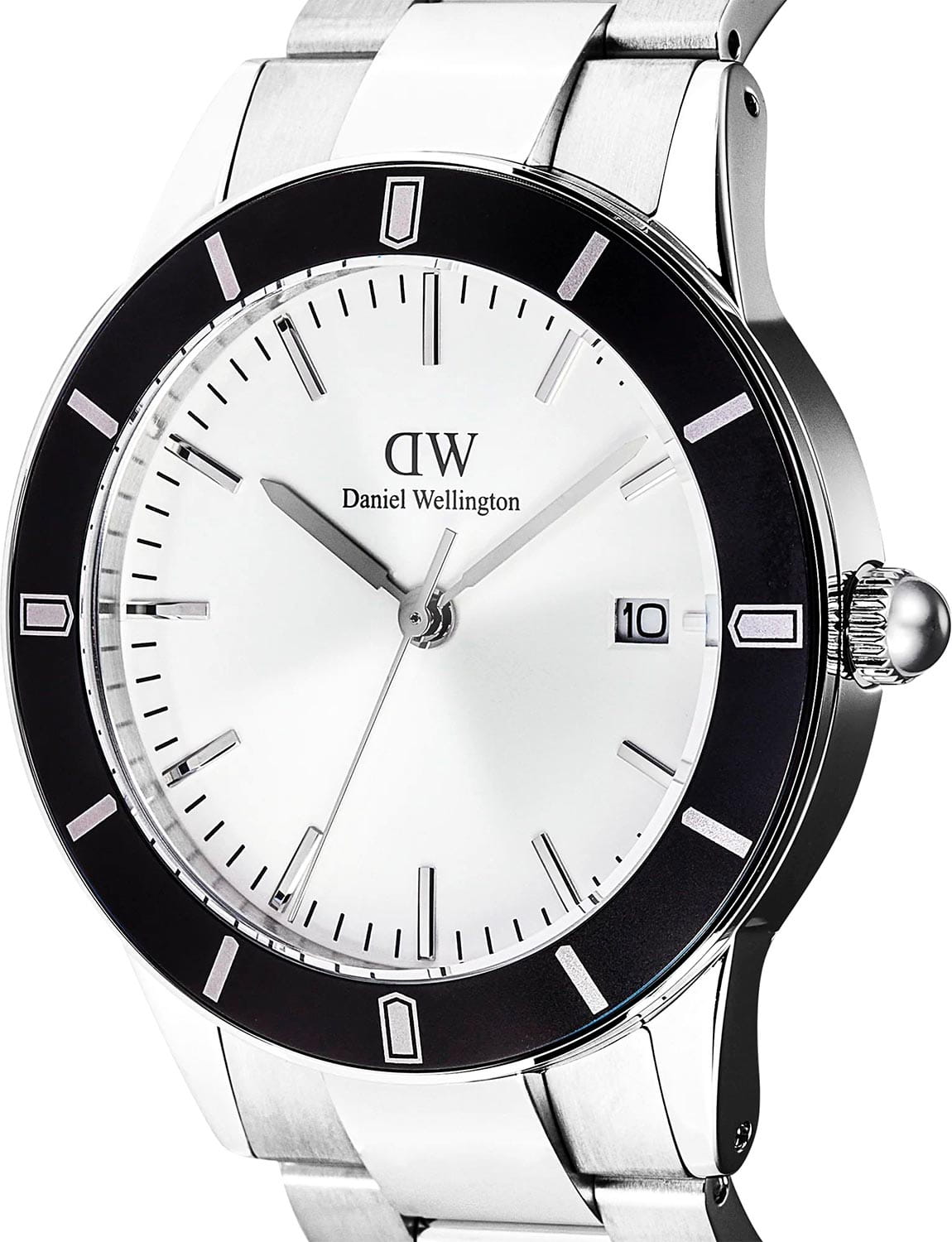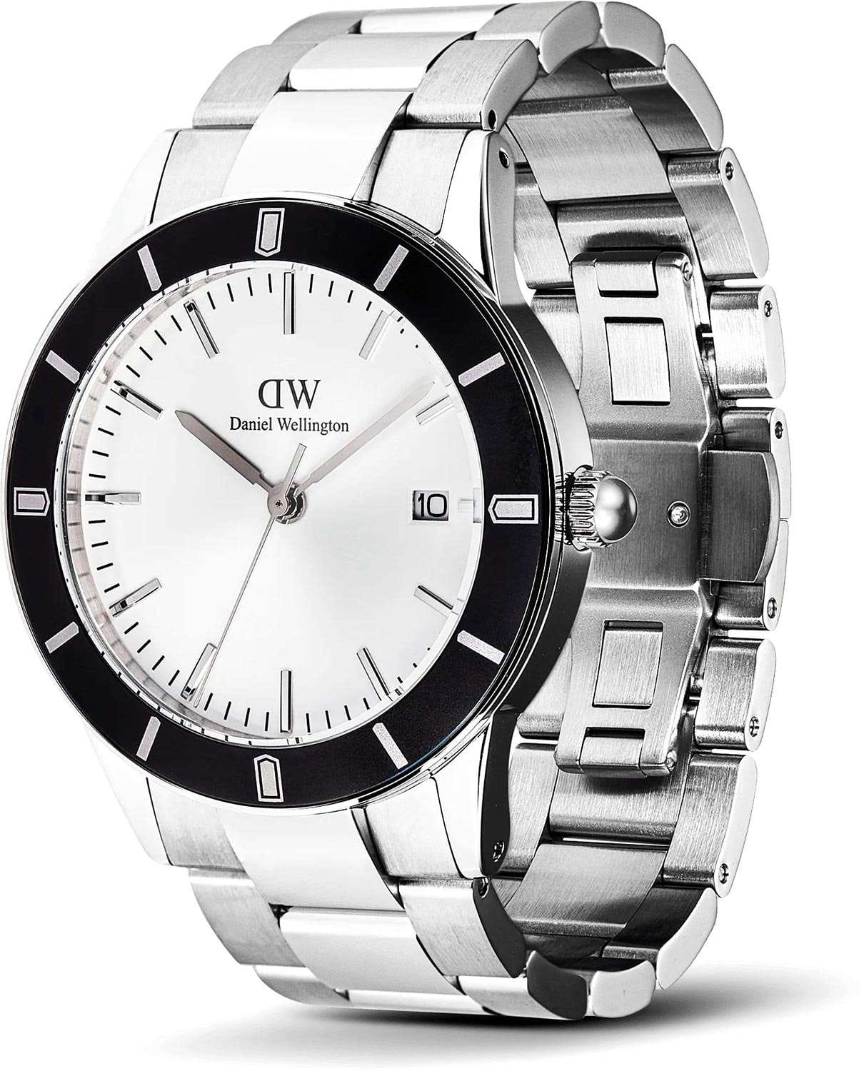 Daniel Wellington — мужские часы в современном спортивно-элегантном стиле. Круглый корпус диаметром 40 мм изготовлен из нержавеющей стали и дополнен чёрным безелемБезельВнешний ободок, закрепляющий стекло. В спортивных часах так называется поворотное кольцо с делениями на циферблате, выполняет роль таймера – замеряет отрезки времени на шкале. Неподвижный безель – элемент декора. Однонаправленно вращающийся безель на дайверских часах позволяет фиксировать моменты погружения и выныривания на поверхность. из анодированного алюминия, которое придаёт модели выразительный характер.