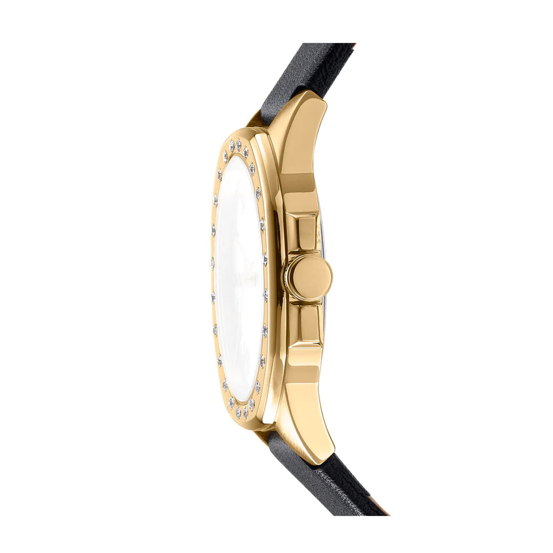 DKNY Brooklyn Maxi DK1L011L0025 — женские кварцевые часы в духе нью-йоркского урбанизма, сочетающие смелый дизайн и функциональность. Корпус из нержавеющей стали диаметром 36 мм с IP-покрытиемIP-покрытиеМетод ионного напыления. Демонстрирует повышенную устойчивость к истиранию, окислению и химическим веществам. Под воздействием высокого давления и температуры около 1500°C молекулы металла надёжно соединяются с частицами корпуса часов. и минеральное стеклоМинеральное стеклоМинеральное стекло представляет собой искусственно выращенный минерал кварца. Такое стекло отличается особой устойчивостью к повреждениям и царапинам. Уступает по некоторым качествам сапфировому стеклу. обеспечивает защиту от царапин, а водонепроницаемость до 50 метров делает модель практичной для активного отдыха или повседневной носки. БезельБезельВнешний ободок, закрепляющий стекло. В спортивных часах так называется поворотное кольцо с делениями на циферблате, выполняет роль таймера – замеряет отрезки времени на шкале. Неподвижный безель – элемент декора. Однонаправленно вращающийся безель на дайверских часах позволяет фиксировать моменты погружения и выныривания на поверхность. инкрустирован кристаллами. Кожаный ремешок из кожи с застежкой-пряжкой подчеркивает универсальность, сочетаясь с деловыми и повседневными образами. Лаконичные линии, акцент на крупном формате и практичность делают модель идеальным выбором для женщин, ценящих дерзкий городской образ, сочетающий энергию мегаполиса с универсальной элегантностью.
