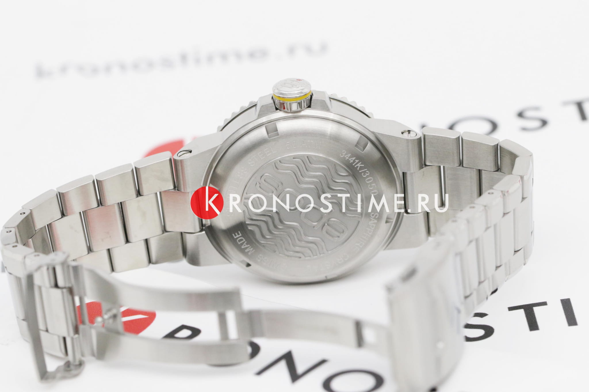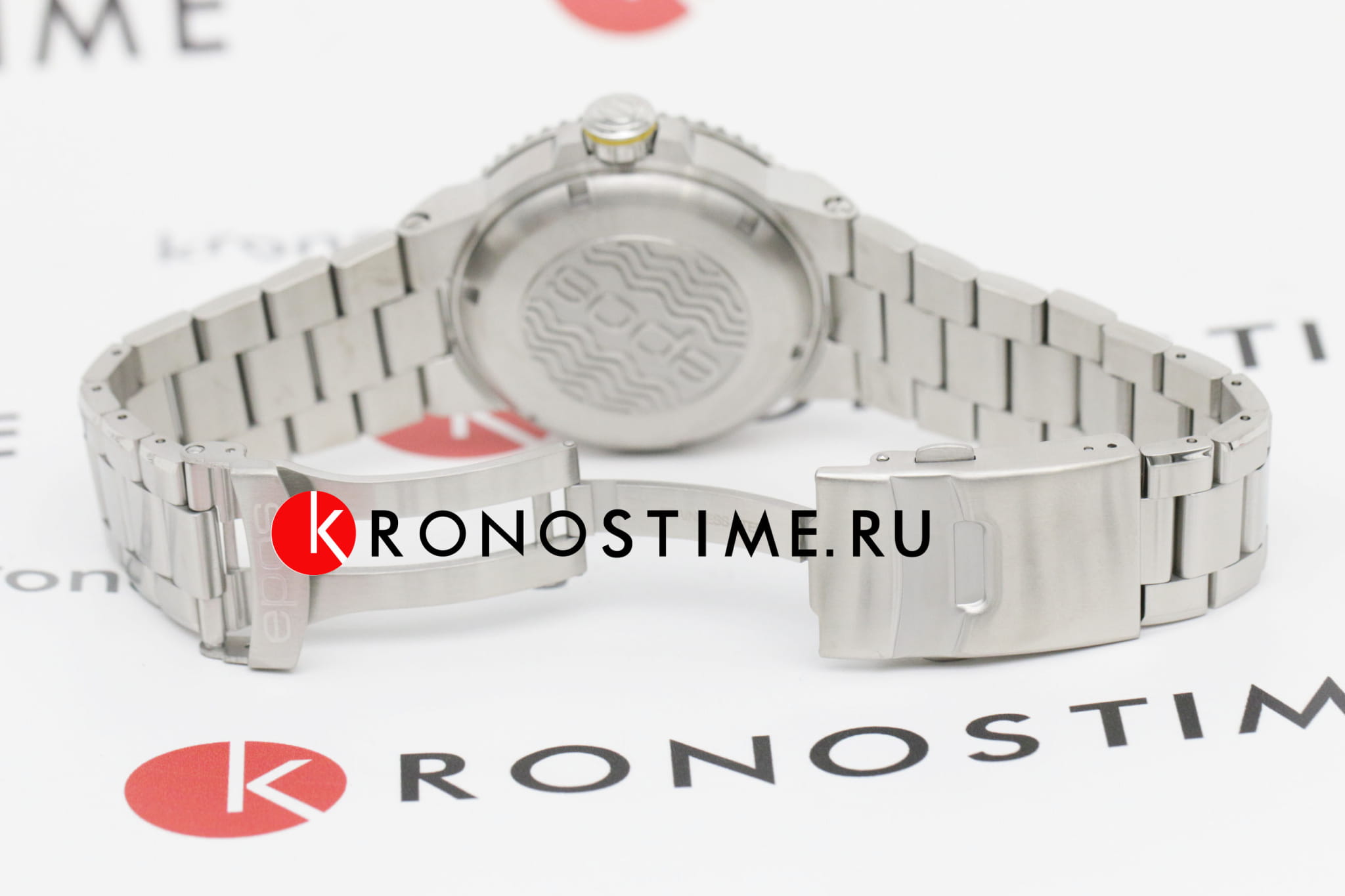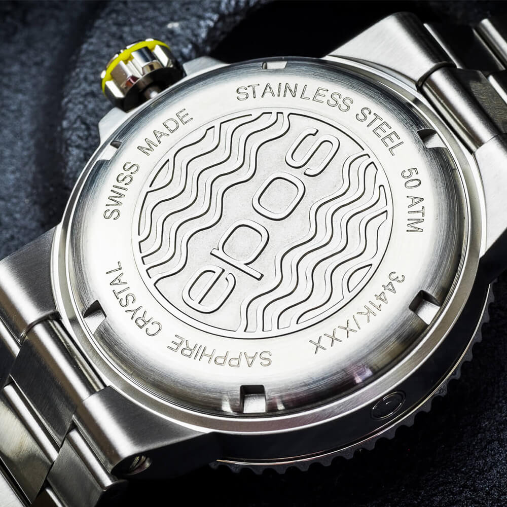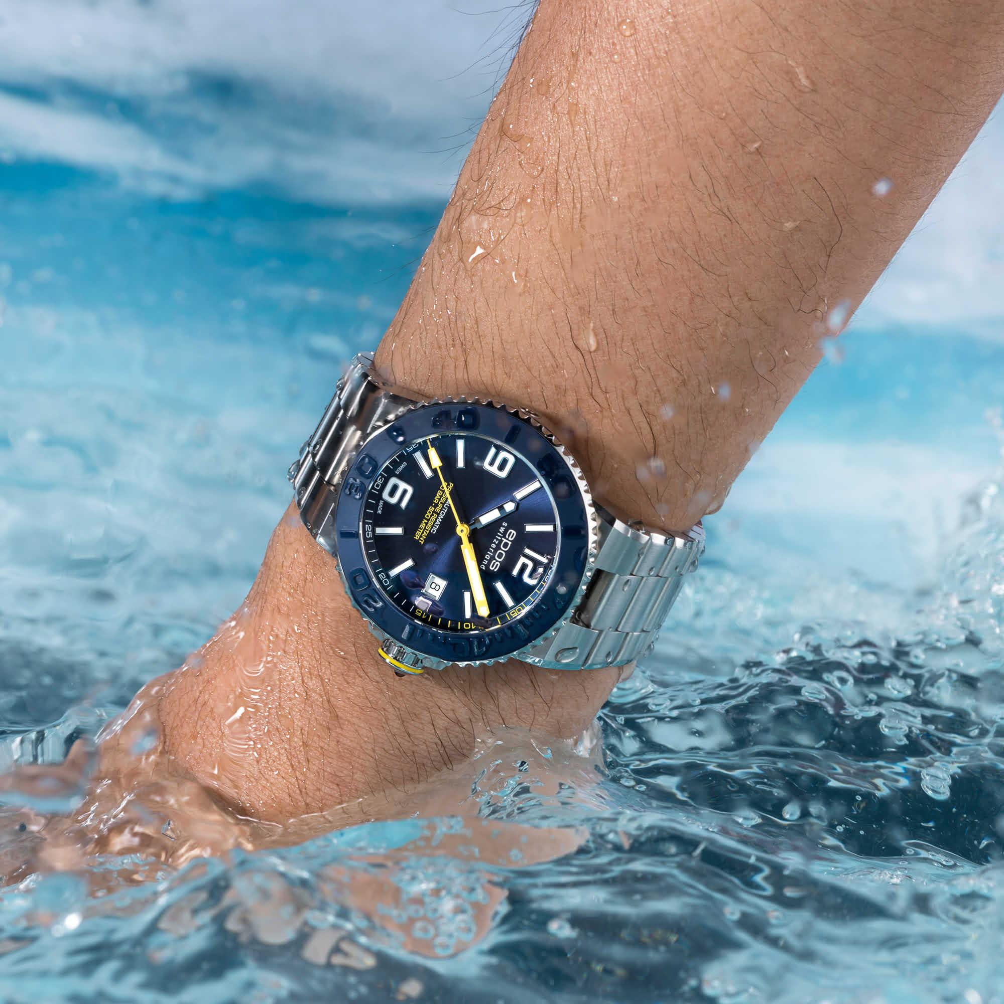 Мужские механические часы с автоподзаводом Epos из коллекции Diver — это профессиональный дайверский инструмент с швейцарским качеством. Корпус диаметром 43 мм и толщиной 14 мм выполнен из нержавеющей стали 316L с PVD-покрытиемPVDУльтратонкое покрытие наносится в технике вакуумного напыления, сочетает в себе нитрид титана особой прочности со слоем золота или оксида хрома. Несёт в себе декоративную или защитную функцию.. Циферблат синего цвета с пескоструйной обработкой оформлен аппликациями часовых индексов и крупными цифрами с покрытием. Циферблат защищён сапфировым стекломСапфировое стеклоПрочный и надёжный материал из кристалла сапфира синтетического происхождения, характеризующийся особой твёрдостью и устойчивостью к царапинам и повреждениям.. Стрелки и метки с люминесцентным покрытиемЛюминесцентное покрытиеПозволяет считывать показания времени в темноте. Производители наносят на стрелки, часовые индексы, безель или поверхность циферблата светонакопительный состав, дающий холодное свечение. Super-Luminova, обеспечивающим отличную читаемость в темноте. Механизм — швейцарский калибр ETA 2824. Окошко даты расположено в положении 3 часов. БезельБезельВнешний ободок, закрепляющий стекло. В спортивных часах так называется поворотное кольцо с делениями на циферблате, выполняет роль таймера – замеряет отрезки времени на шкале. Неподвижный безель – элемент декора. Однонаправленно вращающийся безель на дайверских часах позволяет фиксировать моменты погружения и выныривания на поверхность. — однонаправленный вращающийся, с синей керамической накладкой и рельефной шкалой погружений. Завинчивающаяся коронка и задняя крышка обеспечивают повышенную защиту. Часы оснащены стальным браслетом с литыми звеньями в 3 ряда и раскладной застёжкойРаскладная застёжкаТакой тип застёжки используется только на браслетах из металла. Она никогда не раскрывается полностью, происходит разделение на 2 и более частей. Раскладывающая застёжка снизит вероятность потери часов к минимуму. с двойной блокировкой и дополнительным фиксатором. Автоматический гелиевый клапан позволяет использовать часы при профессиональном дайвинге. Водонепроницаемость 500 м соответствует требованиям для глубоководных погружений. Гарантия — 24 месяца. Идеальный выбор для тех, кто ценит надёжность, точность и экстремальные испытания.