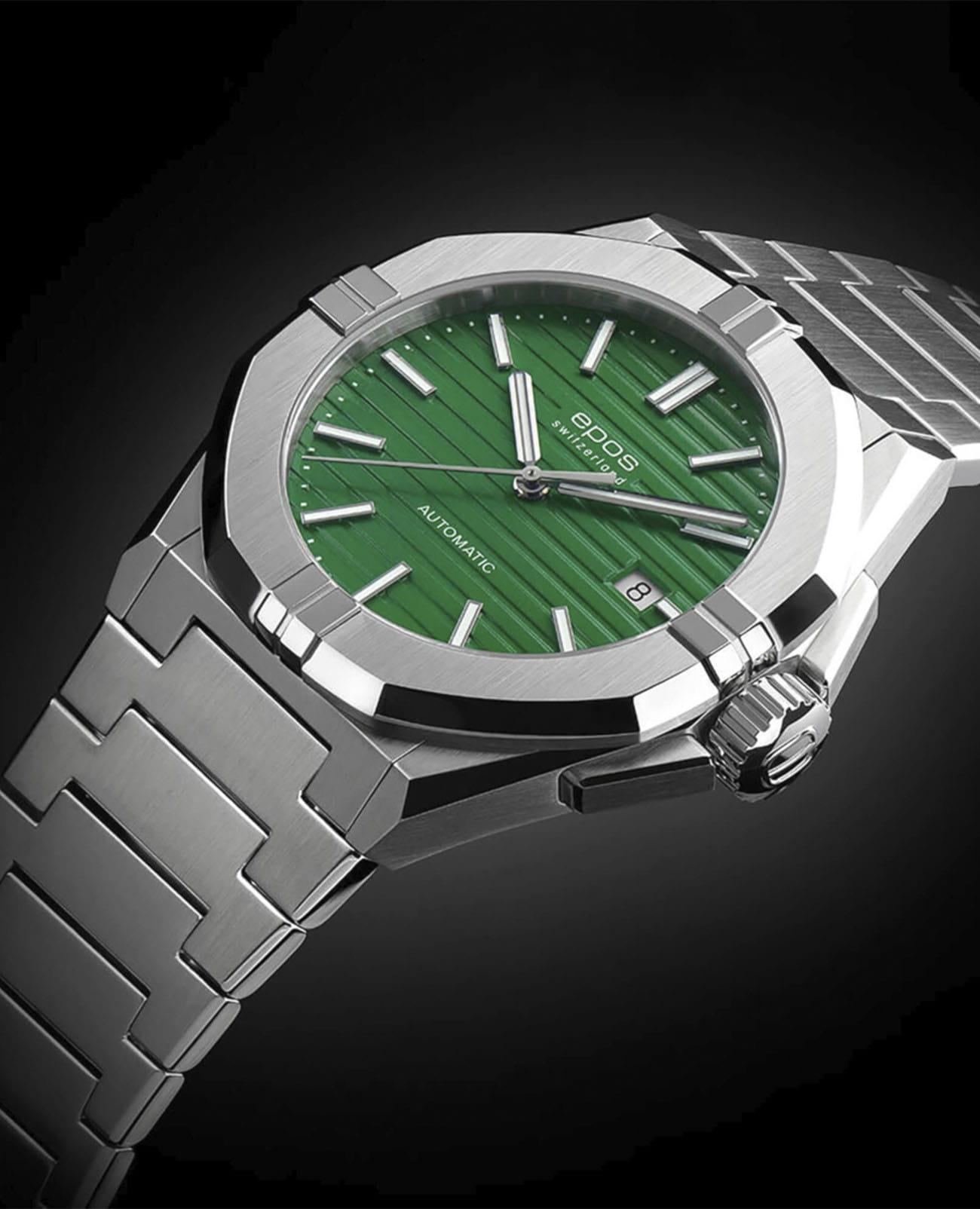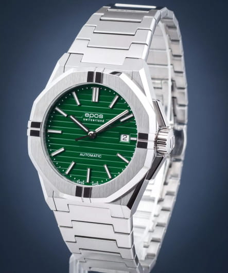 Мужские механические часы с автоподзаводом Epos из коллекции Sportive — это стильный и надёжный аксессуар с швейцарским качеством. Корпус диаметром 41 мм и толщиной 10,7 мм выполнен из нержавеющей стали 316L. Циферблат зелёного цвета оформлен рифлёным узором и метками в виде штрихов. Циферблат защищён сапфировым стекломСапфировое стеклоПрочный и надёжный материал из кристалла сапфира синтетического происхождения, характеризующийся особой твёрдостью и устойчивостью к царапинам и повреждениям.. Стрелки и метки с люминесцентным покрытиемЛюминесцентное покрытиеПозволяет считывать показания времени в темноте. Производители наносят на стрелки, часовые индексы, безель или поверхность циферблата светонакопительный состав, дающий холодное свечение., обеспечивающим хорошую читаемость в темноте. Механизм — швейцарский калибр ETA 2824. Окошко даты расположено в положении 3 часов. Завинчивающаяся коронка обеспечивает дополнительную защиту. Прозрачная задняя крышка позволяет наблюдать за работой декорированного механизма. Часы оснащены стальным браслетом на застёжке «бабочка» с кнопкамиЗастёжка "бабочка"Такой вид застёжки дополняется предохранителями, помогающими избежать случайного раскрытия браслета. Обладают изящным исполнением. . Водонепроницаемость 100 м позволяет использовать часы для плавания и повседневного ношения. Гарантия — 24 месяца. Универсальный выбор для ценителя механики и элегантного спортивного стиля.