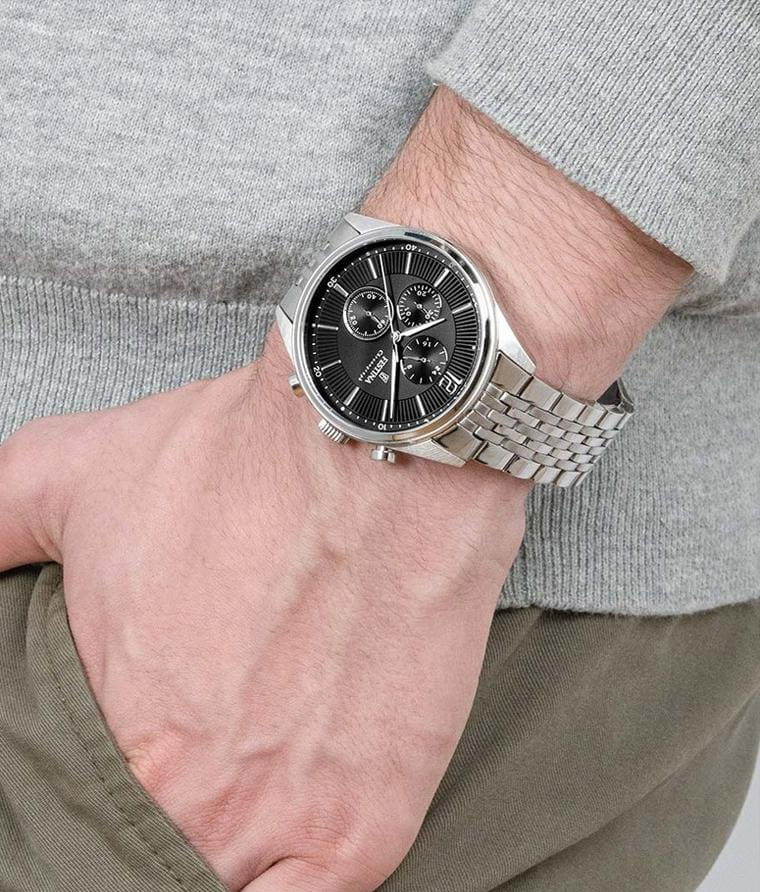 Эксклюзивный хронографХронографФункция позволяет измерять отрезки времени с особой точностью: часы, минуты, секунды. Верным признаком хронографа является наличие на циферблате 3 дополнительных окошек-счётчиков. с секундомеромСекундомерСекундоме́р — прибор, способный измерять интервалы времени с точностью до долей секунды., отличающийся продуманным дизайном и отделкой, придется по вкусу мужчинам, ценящим идеальное соотношение цены и качества.. Минеральное стеклоМинеральное стеклоМинеральное стекло представляет собой искусственно выращенный минерал кварца. Такое стекло отличается особой устойчивостью к повреждениям и царапинам. Уступает по некоторым качествам сапфировому стеклу. устойчивое к появлению царапин, обладающее высокой прозрачностью. Класс водозащиты: 50 метров, позволит защитить корпус от случайных брызг или капель дождя. Браслет с раскладной застёжкойРаскладная застёжкаТакой тип застёжки используется только на браслетах из металла. Она никогда не раскрывается полностью, происходит разделение на 2 и более частей. Раскладывающая застёжка снизит вероятность потери часов к минимуму..