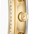 Fossil ES5358 – это изысканные женские часы-хронографХронографФункция позволяет измерять отрезки времени с особой точностью: часы, минуты, секунды. Верным признаком хронографа является наличие на циферблате 3 дополнительных окошек-счётчиков. с секундомеромСекундомерСекундоме́р — прибор, способный измерять интервалы времени с точностью до долей секунды., которые станут идеальным дополнением к вашему стилю, предлагая баланс между функциональностью и эстетикой. Эти часы изготовлены в США и оснащены надежным кварцевым механизмом, что обеспечивает точность и долговечность. Корпус часов выполнен из прочной стали с золотистым IP-покрытиемIP-покрытиеМетод ионного напыления. Демонстрирует повышенную устойчивость к истиранию, окислению и химическим веществам. Под воздействием высокого давления и температуры около 1500°C молекулы металла надёжно соединяются с частицами корпуса часов., а безельБезельВнешний ободок, закрепляющий стекло. В спортивных часах так называется поворотное кольцо с делениями на циферблате, выполняет роль таймера – замеряет отрезки времени на шкале. Неподвижный безель – элемент декора. Однонаправленно вращающийся безель на дайверских часах позволяет фиксировать моменты погружения и выныривания на поверхность. дополнен кристаллами, добавляя блеска и шарма. Белый перламутровый циферблат гармонично сочетается с маркировкой в виде штрихов и римскими цифрами VI и XII, придавая часам классический вид. Окошко даты, расположенное между отметками 4 и 5 часов, добавляет удобства в повседневном использовании. Часы обладают водозащитой 50WR, что позволяет не беспокоиться о случайных попаданиях влаги. Минеральное стеклоМинеральное стеклоМинеральное стекло представляет собой искусственно выращенный минерал кварца. Такое стекло отличается особой устойчивостью к повреждениям и царапинам. Уступает по некоторым качествам сапфировому стеклу. защищает циферблат от царапин и повреждений. Стрелки с люминесцентным покрытиемЛюминесцентное покрытиеПозволяет считывать показания времени в темноте. Производители наносят на стрелки, часовые индексы, безель или поверхность циферблата светонакопительный состав, дающий холодное свечение. позволяют легко считывать время даже в условиях низкой освещенности. Стальной браслет с золотистым IP-покрытиемIP-покрытиеМетод ионного напыления. Демонстрирует повышенную устойчивость к истиранию, окислению и химическим веществам. Под воздействием высокого давления и температуры около 1500°C молекулы металла надёжно соединяются с частицами корпуса часов. и раскладной застёжкойРаскладная застёжкаТакой тип застёжки используется только на браслетах из металла. Она никогда не раскрывается полностью, происходит разделение на 2 и более частей. Раскладывающая застёжка снизит вероятность потери часов к минимуму. обеспечивает комфортное ношение и надежную фиксацию на запястье, с габаритными размерами 36 мм в диаметре, шириной браслета 16 мм и длиной 175 мм. Эти часы — прекрасный выбор для тех, кто ценит стиль и качество в каждом элементе аксессуара.