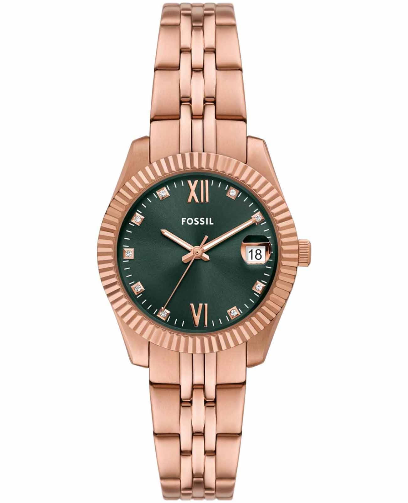 Часы Fossil ES5369 представляют собой изысканный аксессуар, который подчеркнет ваш стиль и индивидуальность. Эти женские наручные часы произведены в США и оснащены надежным кварцевым механизмом. Корпус выполнен из высококачественной стали с розово-золотистым IP-покрытиемIP-покрытиеМетод ионного напыления. Демонстрирует повышенную устойчивость к истиранию, окислению и химическим веществам. Под воздействием высокого давления и температуры около 1500°C молекулы металла надёжно соединяются с частицами корпуса часов., а рифленый безельБезельВнешний ободок, закрепляющий стекло. В спортивных часах так называется поворотное кольцо с делениями на циферблате, выполняет роль таймера – замеряет отрезки времени на шкале. Неподвижный безель – элемент декора. Однонаправленно вращающийся безель на дайверских часах позволяет фиксировать моменты погружения и выныривания на поверхность. с золотистым IP-покрытиемIP-покрытиеМетод ионного напыления. Демонстрирует повышенную устойчивость к истиранию, окислению и химическим веществам. Под воздействием высокого давления и температуры около 1500°C молекулы металла надёжно соединяются с частицами корпуса часов. придает часам элегантный и современный вид. Изумрудно-зеленый циферблат, изготовленный по технологии Sunray, украшен кристаллами, что придает ему особое сияние и элегантность. Метки в виде точек с кристаллами и римские цифры VI и XII создают утонченный и классический облик. В положении 3 часа находится окошко даты с увеличительным стеклом, что добавляет дополнительное удобство в повседневной жизни. Стрелки с люминесцентным покрытиемЛюминесцентное покрытиеПозволяет считывать показания времени в темноте. Производители наносят на стрелки, часовые индексы, безель или поверхность циферблата светонакопительный состав, дающий холодное свечение. позволяют легко считывать время даже в условиях низкой освещенности. Полированный стальной браслет с розово-золотистым IP-покрытиемIP-покрытиеМетод ионного напыления. Демонстрирует повышенную устойчивость к истиранию, окислению и химическим веществам. Под воздействием высокого давления и температуры около 1500°C молекулы металла надёжно соединяются с частицами корпуса часов. и раскладной застёжкойРаскладная застёжкаТакой тип застёжки используется только на браслетах из металла. Она никогда не раскрывается полностью, происходит разделение на 2 и более частей. Раскладывающая застёжка снизит вероятность потери часов к минимуму. обеспечивает комфортное ношение и надежную фиксацию на запястье. Водозащита 50WR позволяет не беспокоиться о случайных брызгах воды. Минеральное стеклоМинеральное стеклоМинеральное стекло представляет собой искусственно выращенный минерал кварца. Такое стекло отличается особой устойчивостью к повреждениям и царапинам. Уступает по некоторым качествам сапфировому стеклу. защищает циферблат от царапин и повреждений. С диаметром корпуса 32 мм и шириной браслета 16 мм, эти часы прекрасно подойдут для тех, кто ценит стиль и качество в каждой детали.