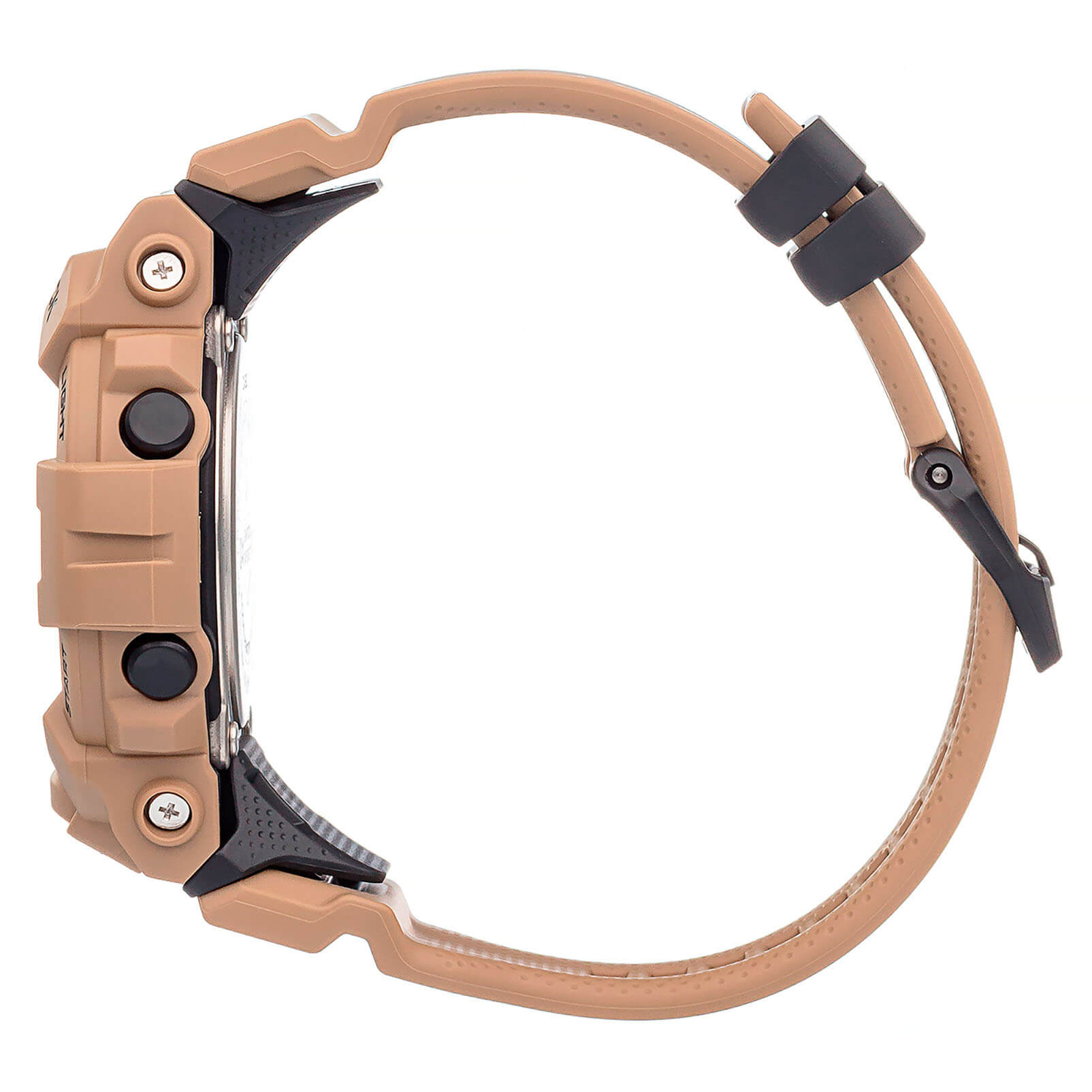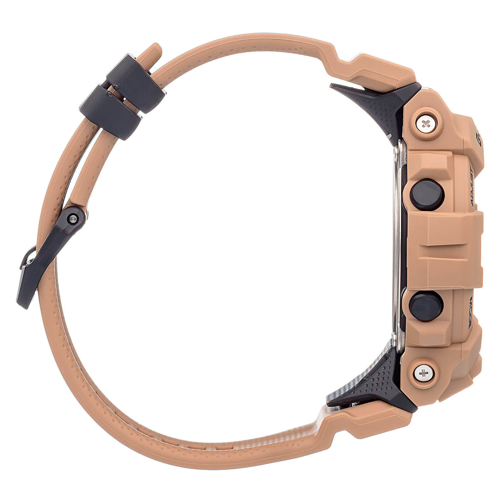Это не просто стильный и практичный аксессуар, модель песочного цвета является идеальным помощником в правильной организации тренировок. Часы для фитнеса и бега оснащены шагомером, измеряющим их в количестве от 0 до 999999, многофункциональным таймером, секундомером с памятью на 200 результатов. С помощью технологии BluetoothBluetoothСовременная технология, позволяющая синхронизировать часы с телефоном и переносить данные. Часы с Bluetooth расширяют возможности вашего смартфона и делают его использование ещё более удобным. данные о физической активности могут передаваться и анализироваться в вашем смартфоне, для этого было разработано приложение G-Shock Connected Phone. Кварцевый механизм японского производства. Батарейка рассчитана на 3 года работы. Ударопрочный корпусУдаропрочный корпусМеханизм заключён в корпус, выполненный из современных материалов, устойчивых к ударам, механическим повреждениям и падению с высоты: инновационный пластик, карбон, нержавеющая сталь, титан. из полимерного материала. Минеральное стекло. Водостойкость до 20 бар. Циферблат со светодиодной подсветкойСветодиодная подсветкаСветодиодная или LED-подсветка обеспечивает появление яркого холодного свечения за счёт LED-элементов - маленьких лампочек. Они потребляют минимальное количество энергии, чаще всего можно встретить 1 светодиод, в нижней части циферблата., стрелки с люминесцентным покрытиемЛюминесцентное покрытиеПозволяет считывать показания времени в темноте. Производители наносят на стрелки, часовые индексы, безель или поверхность циферблата светонакопительный состав, дающий холодное свечение.. Будильник, мировое времяМировое время Полезное часовое усложнение, отображающее время в основных городах и известных областях по всему миру, оно связано с часовыми поясами, удобно для путешественников и бизнесменов. , календарь до 2099 года, функция поиска телефона, хронографХронографФункция позволяет измерять отрезки времени с особой точностью: часы, минуты, секунды. Верным признаком хронографа является наличие на циферблате 3 дополнительных окошек-счётчиков.. Габариты: 54,1 x 48,6 x 15,5 мм.