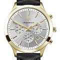 Мужские наручные часы-хронографХронографФункция позволяет измерять отрезки времени с особой точностью: часы, минуты, секунды. Верным признаком хронографа является наличие на циферблате 3 дополнительных окошек-счётчиков. Greenwich Skipper GW 043.21.33 представляют собой классический вариант для повседневной носки. Циферблат украшается брендовым логотипом, изображающим Розу Ветров. Эмблема мореплавательского духа символизирует удачу, стремление достигнуть поставленной цели. Часы характеризуются традиционными формами, лаконичным исполнением, что делает модель элегантным дополнением к деловому костюму. Надёжный корпус из нержавеющей стали с PVD-покрытиемPVDУльтратонкое покрытие наносится в технике вакуумного напыления, сочетает в себе нитрид титана особой прочности со слоем золота или оксида хрома. Несёт в себе декоративную или защитную функцию. спасает японский механизм от повреждений и ударов. Минеральное стеклоМинеральное стеклоМинеральное стекло представляет собой искусственно выращенный минерал кварца. Такое стекло отличается особой устойчивостью к повреждениям и царапинам. Уступает по некоторым качествам сапфировому стеклу. отличается устойчивостью к образованию царапин на поверхности. СекундомерСекундомерСекундоме́р — прибор, способный измерять интервалы времени с точностью до долей секунды.. Стрелки и метки с люминесцентным покрытиемЛюминесцентное покрытиеПозволяет считывать показания времени в темноте. Производители наносят на стрелки, часовые индексы, безель или поверхность циферблата светонакопительный состав, дающий холодное свечение.. Кожаный ремешок на стандартной застёжке. Окошко даты находится в положении между 4 и 5 часов. Класс водозащиты: 100 метров, позволит плавать, нырять и заниматься другими водными видами спорта.