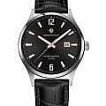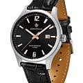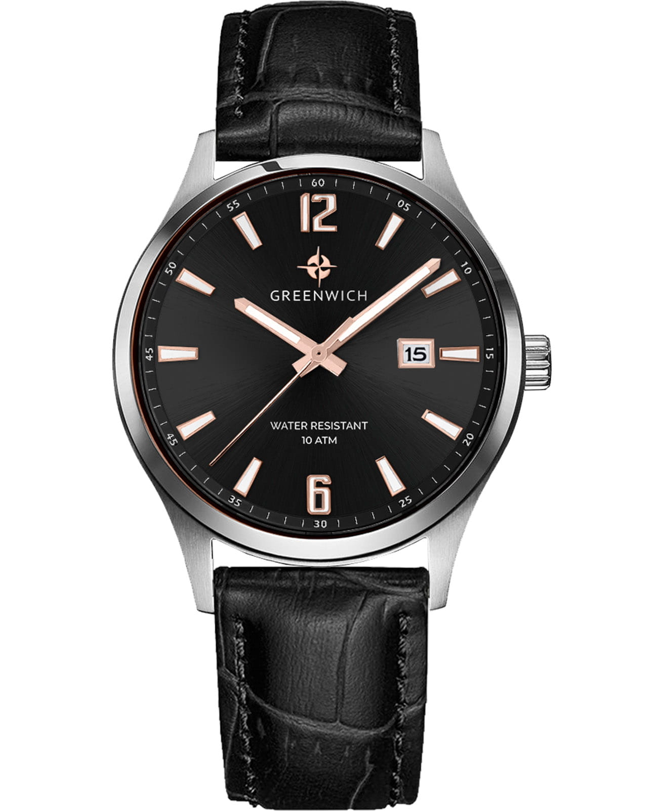 Мужские кварцевые часы Greenwich GW 051.11.30 — это сочетание элегантности, прочности и швейцарского качества. Корпус диаметром 43 мм выполнен из нержавеющей стали 316L с полированным безелемБезельВнешний ободок, закрепляющий стекло. В спортивных часах так называется поворотное кольцо с делениями на циферблате, выполняет роль таймера – замеряет отрезки времени на шкале. Неподвижный безель – элемент декора. Однонаправленно вращающийся безель на дайверских часах позволяет фиксировать моменты погружения и выныривания на поверхность. и эффектом вертикального матирования на боковых гранях, что визуально делает его тоньше. Циферблат чёрного цвета защищён минеральным стекломМинеральное стеклоМинеральное стекло представляет собой искусственно выращенный минерал кварца. Такое стекло отличается особой устойчивостью к повреждениям и царапинам. Уступает по некоторым качествам сапфировому стеклу. и оформлен в минималистичном стиле. Часовая и минутная стрелки, а также метки с люминесцентным покрытиемЛюминесцентное покрытиеПозволяет считывать показания времени в темноте. Производители наносят на стрелки, часовые индексы, безель или поверхность циферблата светонакопительный состав, дающий холодное свечение., обеспечивающим хорошую читаемость в темноте. Секундная стрелка движется по маркированному кругу, окошко даты расположено в положении 3 часов. Механизм — японский кварцевый Miyota. Часы оснащены удобным ремешком из натуральной кожи чёрного цвета с контрастной прошивкой. Завинчивающаяся заводная головка и задняя крышка с гравировкой корабля и логотипом в виде розы ветров подчёркивают надёжность и статус модели. Водонепроницаемость 100 м позволяет использовать часы для плавания и других водных видов спорта.