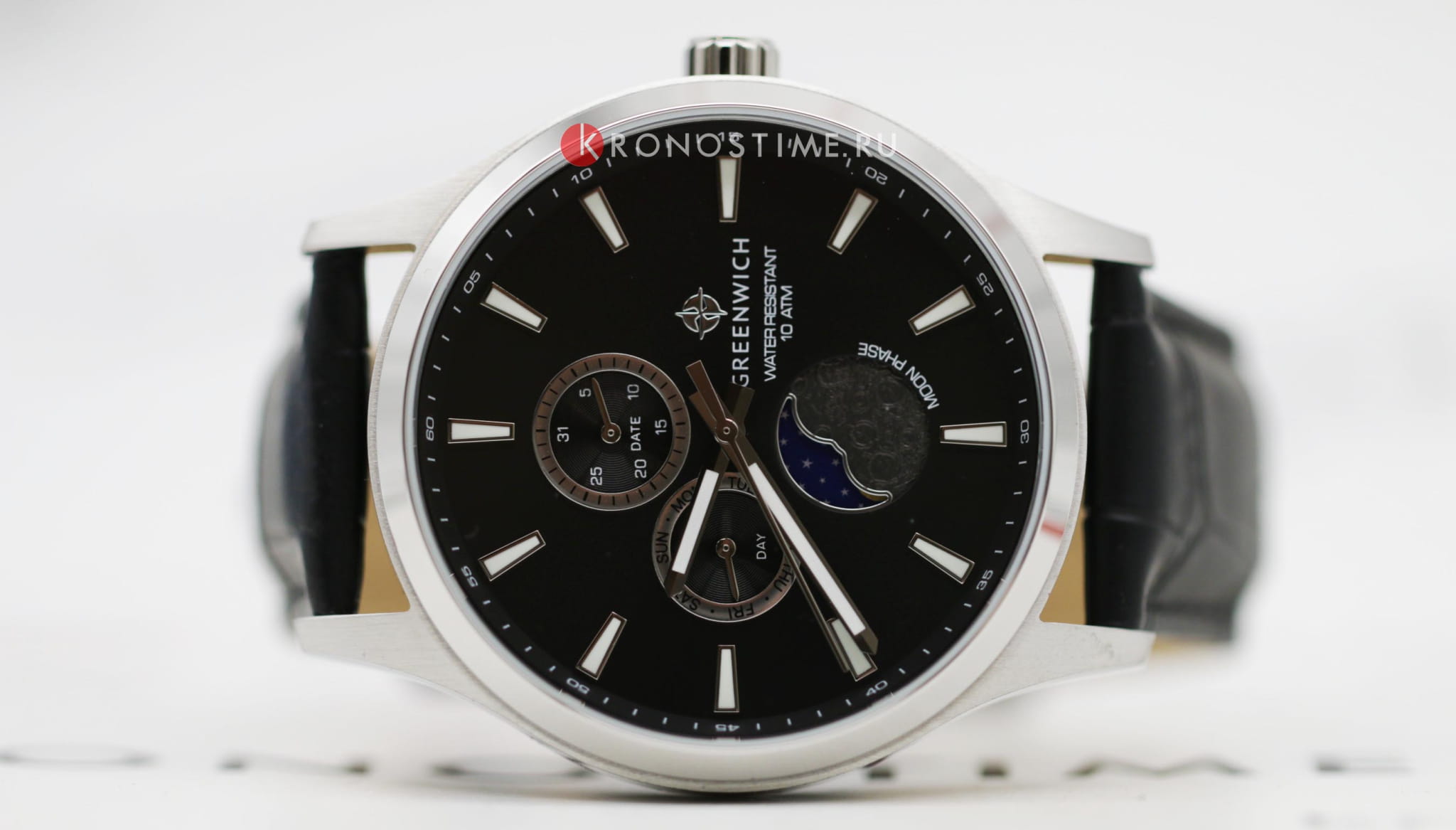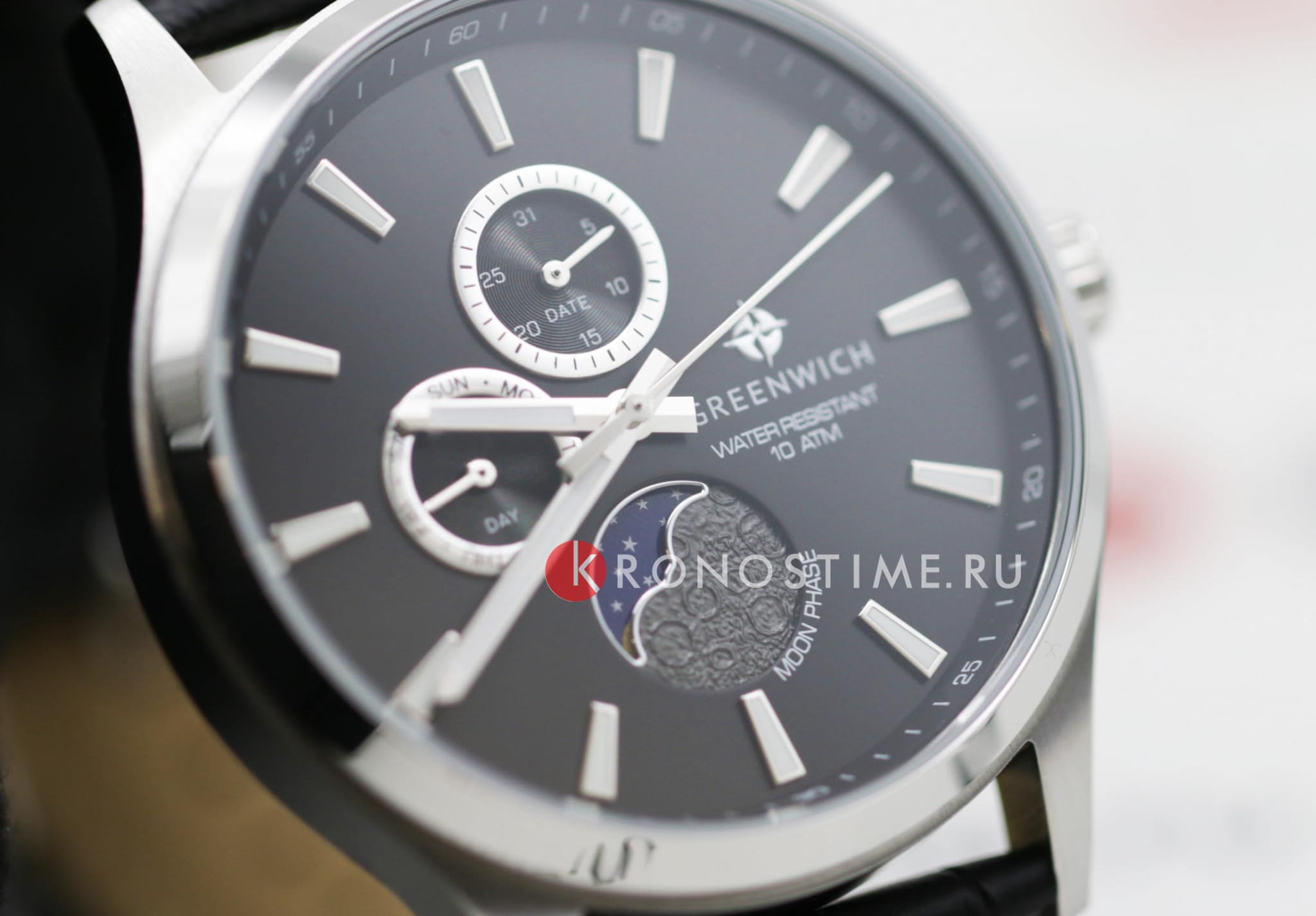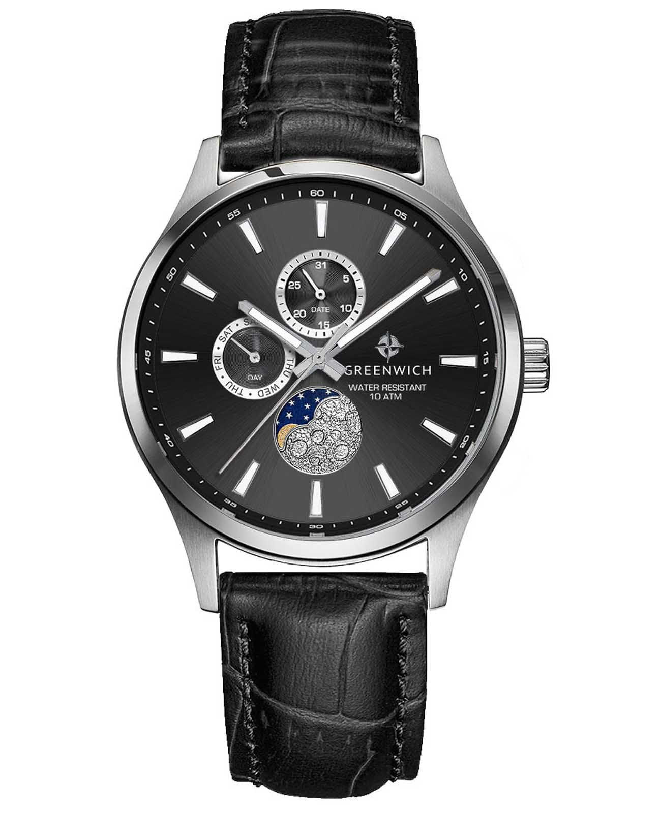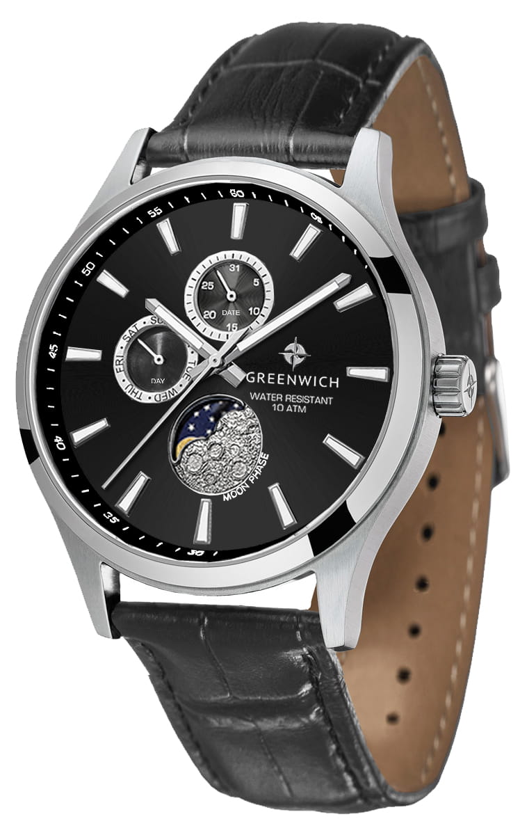 Мужские английские часы Greenwich Moon Walker GW 058.11.31 с минеральным стекломМинеральное стеклоМинеральное стекло представляет собой искусственно выращенный минерал кварца. Такое стекло отличается особой устойчивостью к повреждениям и царапинам. Уступает по некоторым качествам сапфировому стеклу.. В часах привлекает сочетание спортивного дизайна и классических линий корпуса из нержавеющей стали. Кварцевый механизм показывает время с точностью до секунды, дату, день недели. Все индикаторы на черном циферблате хорошо читаются, они выделены накладными рамками с зеркальной полировкой. В позиции «6 часов» расположен индикатор лунных фаз. Его украшением служит элемент с объемным рисунком, напоминающем изрытую кратерами поверхность спутника нашей планеты. Крупные стрелки и риски видны при любых условиях благодаря люминесцентному покрытиюЛюминесцентное покрытиеПозволяет считывать показания времени в темноте. Производители наносят на стрелки, часовые индексы, безель или поверхность циферблата светонакопительный состав, дающий холодное свечение., которое в темноте светится приятным для глаз зеленоватым свечением. Повышенная водостойкость равна 10 атмосфер.
