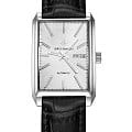 Водозащита до 5 ATM (50 метров) защищает от брызг и дождя, а также подходит для кратковременного погружения в воду. Ремешок из натуральной чёрной кожи с прошивкой и классической застёжкой обеспечивает комфортное ношение и надёжную фиксацию.