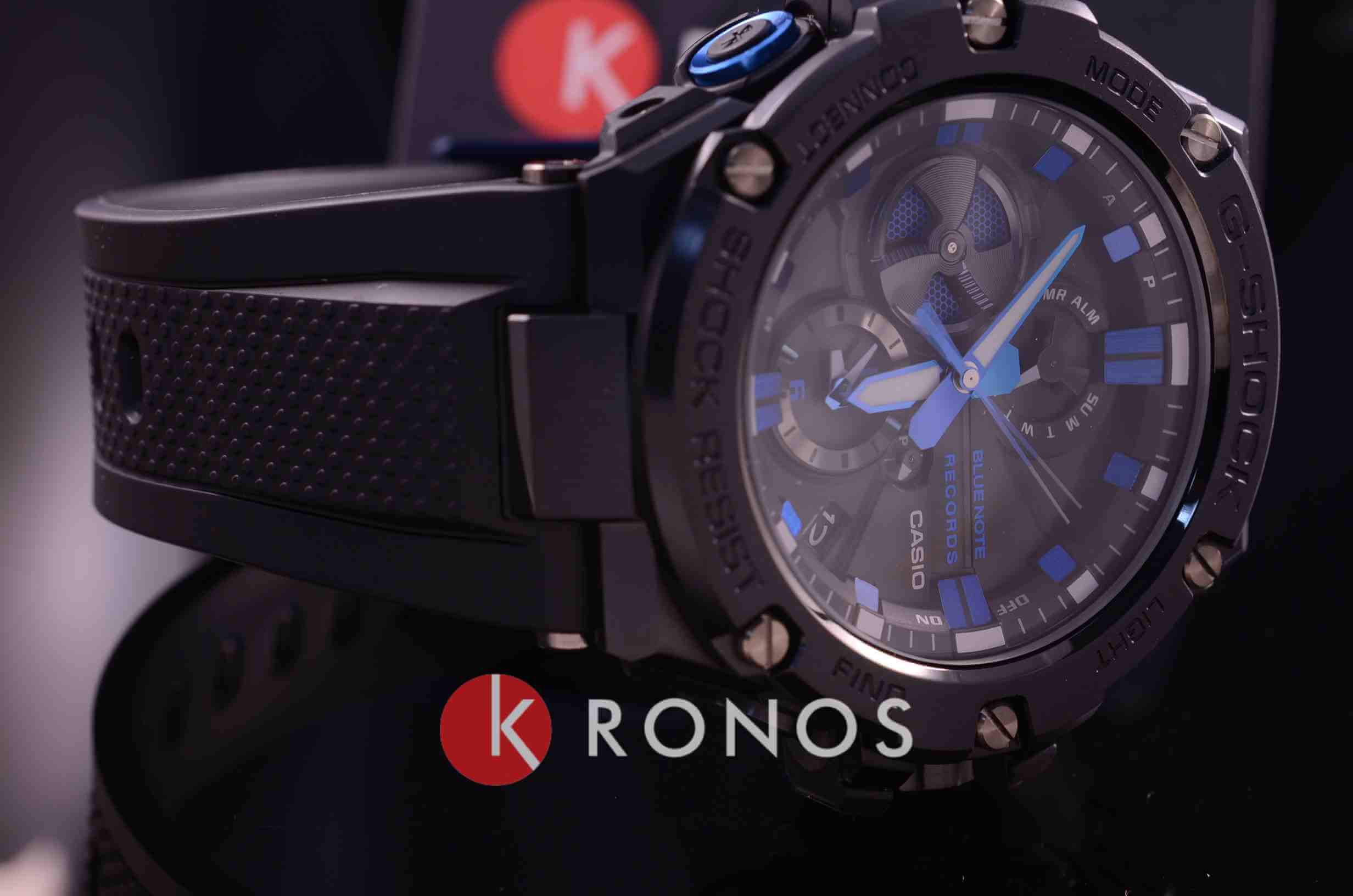 Наручные часы обладают одним из самых тонких корпусов среди стальных моделей G-Shock. Чёрное матовое исполнение имеет яркие акценты в виде синей металлической застёжки и деталей циферблата. Премиальный аксессуар особенно подойдёт тем, кто неравнодушен к оригинальным предметам и любит создавать эксклюзивные образы. Модель оснащена солнечной батарейкой - , индикатор заряда батарейки показывает состояние аккумулятора. Противоударный корпусУдаропрочный корпусМеханизм заключён в корпус, выполненный из современных материалов, устойчивых к ударам, механическим повреждениям и падению с высоты: инновационный пластик, карбон, нержавеющая сталь, титан. из пластика и нержавеющей стали 316L с IP-покрытиемIP-покрытиеМетод ионного напыления. Демонстрирует повышенную устойчивость к истиранию, окислению и химическим веществам. Под воздействием высокого давления и температуры около 1500°C молекулы металла надёжно соединяются с частицами корпуса часов.. Минеральное стекло. Задняя крышка с логотипом Blue Note Records. СветодиоднаяСветодиодная подсветкаСветодиодная или LED-подсветка обеспечивает появление яркого холодного свечения за счёт LED-элементов - маленьких лампочек. Они потребляют минимальное количество энергии, чаще всего можно встретить 1 светодиод, в нижней части циферблата. и люминесцентная подсветкаЛюминесцентное покрытиеПозволяет считывать показания времени в темноте. Производители наносят на стрелки, часовые индексы, безель или поверхность циферблата светонакопительный состав, дающий холодное свечение.. Ремешок из полимерного материала. Завинчивающаяся заводная головка. Технология BluetoothBluetoothСовременная технология, позволяющая синхронизировать часы с телефоном и переносить данные. Часы с Bluetooth расширяют возможности вашего смартфона и делают его использование ещё более удобным., секундомер, будильник, хронографХронографФункция позволяет измерять отрезки времени с особой точностью: часы, минуты, секунды. Верным признаком хронографа является наличие на циферблате 3 дополнительных окошек-счётчиков., мировое времяМировое время Полезное часовое усложнение, отображающее время в основных городах и известных областях по всему миру, оно связано с часовыми поясами, удобно для путешественников и бизнесменов. , автоматический календарь, таймер. Габариты: 58,1 x 53,8 x 14,1 мм.
