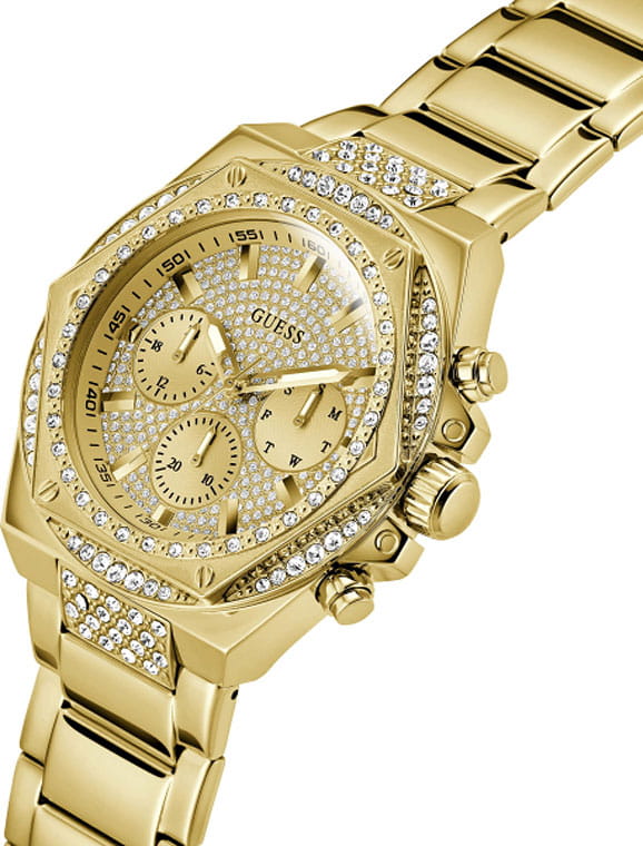 Мужские наручные часы Guess GW0899G2 – это сочетание элегантности и современного стиля. Они оснащены надежным кварцевым механизмом, который обеспечивает точность хода. Корпус часов выполнен из стали с PVD-покрытиемPVDУльтратонкое покрытие наносится в технике вакуумного напыления, сочетает в себе нитрид титана особой прочности со слоем золота или оксида хрома. Несёт в себе декоративную или защитную функцию. золотистого цвета, безельБезельВнешний ободок, закрепляющий стекло. В спортивных часах так называется поворотное кольцо с делениями на циферблате, выполняет роль таймера – замеряет отрезки времени на шкале. Неподвижный безель – элемент декора. Однонаправленно вращающийся безель на дайверских часах позволяет фиксировать моменты погружения и выныривания на поверхность. декорирован кристаллами и винтами, придающими модели особый характер. Золотистый циферблат инкрустирован кристаллами и оснащен метками в виде штрихов, что добавляет изысканности и блеска. Часы поддерживают 12-ти и 24-х часовой формат времени, а также оснащены календарем, показывающим число и день недели на отдельных циферблатах. Люминесцентное покрытиеЛюминесцентное покрытиеПозволяет считывать показания времени в темноте. Производители наносят на стрелки, часовые индексы, безель или поверхность циферблата светонакопительный состав, дающий холодное свечение. на стрелках обеспечивает отличную видимость в темноте. Стальной браслет с раскладной застежкойРаскладная застёжкаТакой тип застёжки используется только на браслетах из металла. Она никогда не раскрывается полностью, происходит разделение на 2 и более частей. Раскладывающая застёжка снизит вероятность потери часов к минимуму. гарантирует комфортное ношение и надежную фиксацию. Минеральное стеклоМинеральное стеклоМинеральное стекло представляет собой искусственно выращенный минерал кварца. Такое стекло отличается особой устойчивостью к повреждениям и царапинам. Уступает по некоторым качествам сапфировому стеклу. защищает циферблат от царапин, а водозащита 30WR предохраняет часы от случайных брызг и дождя. Эта модель станет отличным выбором для тех, кто ценит стиль и функциональность в одном аксессуаре.