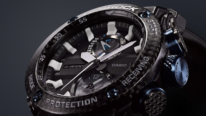 Внушительный аксессуар стильно смотрится на широком запястье, гармонично смотрятся крупные детали в голубом цвете. Задняя крышка здесь отсутствует, ударопрочный корпусУдаропрочный корпусМеханизм заключён в корпус, выполненный из современных материалов, устойчивых к ударам, механическим повреждениям и падению с высоты: инновационный пластик, карбон, нержавеющая сталь, титан. сделан из монолитного углеродного монокока, вдохновлённого конструкцией ранних самолётов. Он состоит из 52 карбоновых слоёв, уникальная текстура просматривается на боковых частях безеляБезельВнешний ободок, закрепляющий стекло. В спортивных часах так называется поворотное кольцо с делениями на циферблате, выполняет роль таймера – замеряет отрезки времени на шкале. Неподвижный безель – элемент декора. Однонаправленно вращающийся безель на дайверских часах позволяет фиксировать моменты погружения и выныривания на поверхность. – с успехом реализована технология Carbon Core GuardCarbon Core Guard Новейшая структура корпуса, разработанная Casio. Полиуретановая пластина дополнительно усилена карбоновыми вставками, что придаёт специальную защиту от механических повреждений. Карбон отличается лёгкостью и прочностью.. Полимерный ремешок тоже имеет усиление карбоновыми волокнами. Наручные часы обладают полезным функционалом: BluetoothBluetoothСовременная технология, позволяющая синхронизировать часы с телефоном и переносить данные. Часы с Bluetooth расширяют возможности вашего смартфона и делают его использование ещё более удобным., будильник, мировое времяМировое время Полезное часовое усложнение, отображающее время в основных городах и известных областях по всему миру, оно связано с часовыми поясами, удобно для путешественников и бизнесменов. , таймер, приём радиосигнала, питание от солнечной батареи . Сапфировое стекло с антибликовой обработкой. Яркая люминесцентная подсветкаЛюминесцентное покрытиеПозволяет считывать показания времени в темноте. Производители наносят на стрелки, часовые индексы, безель или поверхность циферблата светонакопительный состав, дающий холодное свечение.. Габариты: 50,1 x 46,4 x 16,9 мм.
