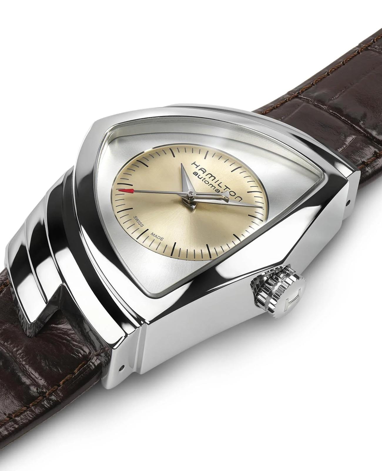 Женские наручные часы Hamilton Ventura Auto H24515521 с надёжным автоматическим механизмом. Корпус часов изготовлен из нержавеющей стали. Практичный кожаный ремешок на застёжке "Бабочка". Сапфировое стеклоСапфировое стеклоПрочный и надёжный материал из кристалла сапфира синтетического происхождения, характеризующийся особой твёрдостью и устойчивостью к царапинам и повреждениям. устойчивое к мелким механическим повреждениям. Класс водозащиты: 50 метров, позволит защитить корпус от случайных брызг или капель дождя.