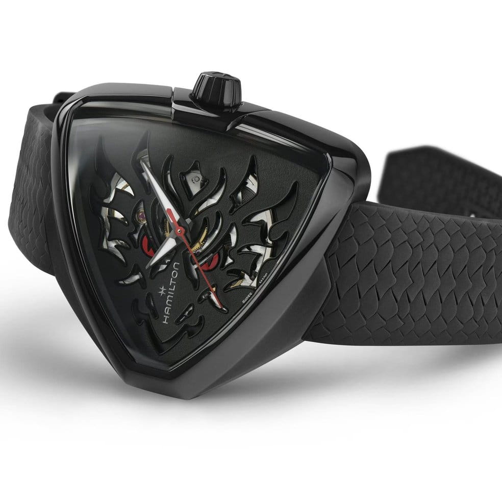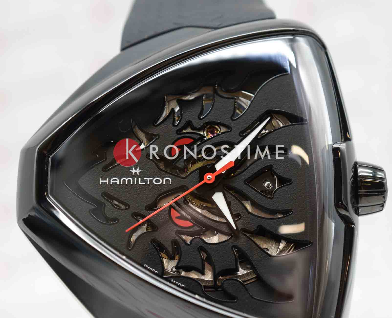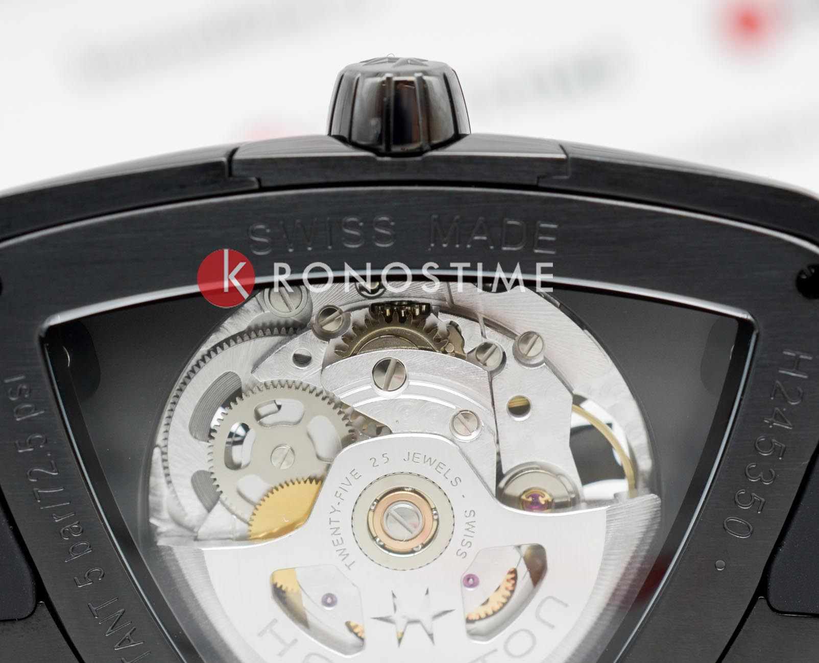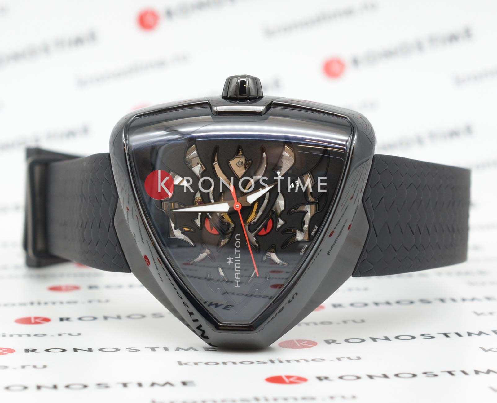 Мужские швейцарские механические часы с автоподзаводом Hamilton Ventura Elvis80 Skeleton Auto H24535332. Механический механизм (автоматический калибр) с высокой точностью. Сапфировое стеклоСапфировое стеклоПрочный и надёжный материал из кристалла сапфира синтетического происхождения, характеризующийся особой твёрдостью и устойчивостью к царапинам и повреждениям. устойчивое к появлению царапин, обладающее высокой прозрачностью. Класс водозащиты: 50 метров, позволит защитить корпус от случайных брызг или капель дождя. Корпус часов изготовлен из нержавеющей стали с PVD-покрытиемPVDУльтратонкое покрытие наносится в технике вакуумного напыления, сочетает в себе нитрид титана особой прочности со слоем золота или оксида хрома. Несёт в себе декоративную или защитную функцию. черного цвета. Под циферблатом находится механизм H-10-S с 80-часовым запасом хода и спиралью баланса Nivachron™Nivachron™Специально разработанный инновационный сплав Nivachron™ повышает устойчивость часов к воздействию магнитных полей..