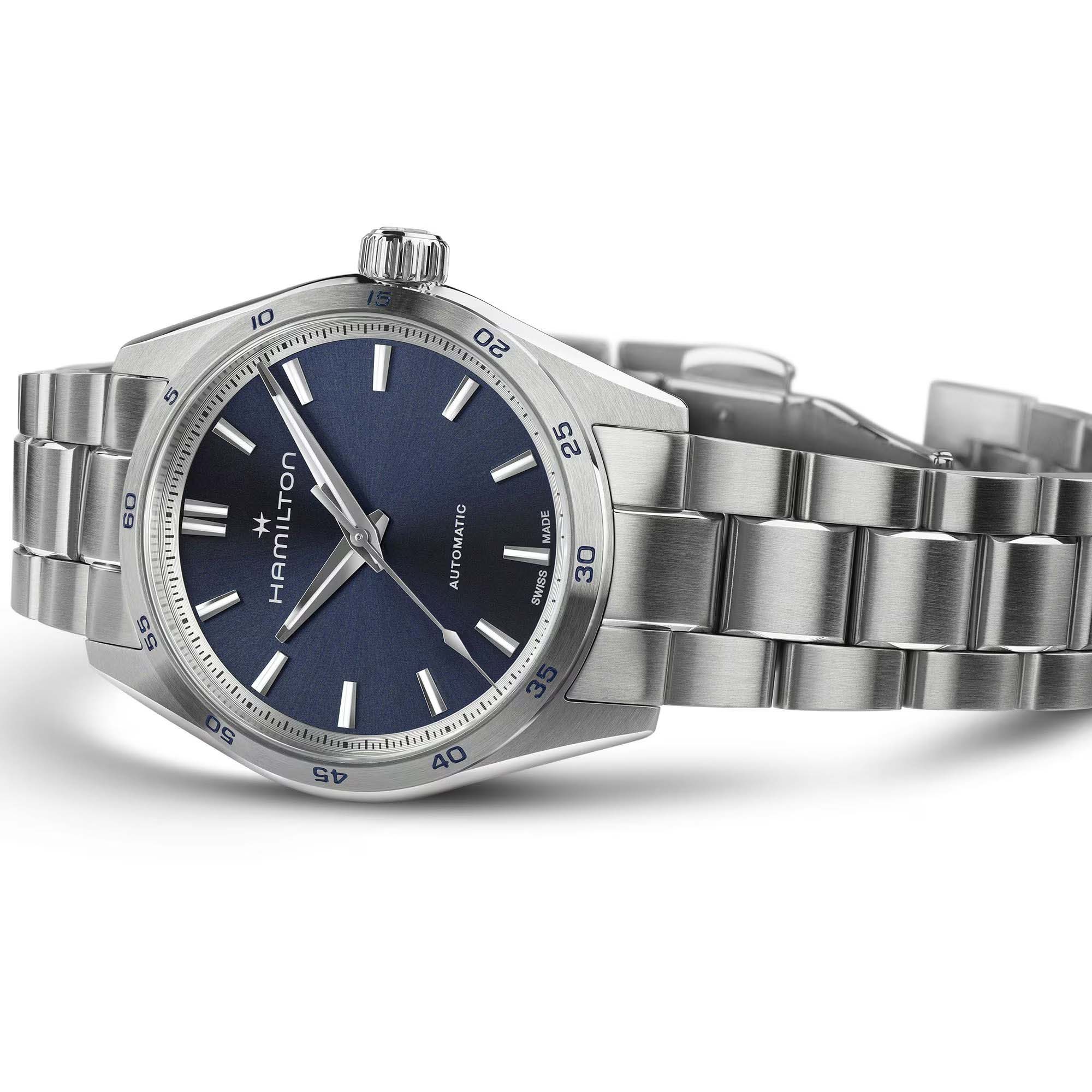 Модели из линии Jazzmaster Performer, привлекающие внимание ярким дизайном в стиле спортивный шик, сочетают в себе функциональность и эстетичность. Часы Jazzmaster Performer Automatic оснащены автоматическим механизмом H-10 с 80-часовым запасом хода. Модель в корпусе из нержавеющей стали диаметром 34 мм имеет лаконичный синий циферблат из нержавеющей стали. Сапфировое стеклоСапфировое стеклоПрочный и надёжный материал из кристалла сапфира синтетического происхождения, характеризующийся особой твёрдостью и устойчивостью к царапинам и повреждениям. с антибликовым покрытием. Стальной браслет на застёжке-бабочке с кнопкамиЗастёжка "бабочка"Такой вид застёжки дополняется предохранителями, помогающими избежать случайного раскрытия браслета. Обладают изящным исполнением. . Стрелки и метки с люминесцентным покрытиемЛюминесцентное покрытиеПозволяет считывать показания времени в темноте. Производители наносят на стрелки, часовые индексы, безель или поверхность циферблата светонакопительный состав, дающий холодное свечение..
