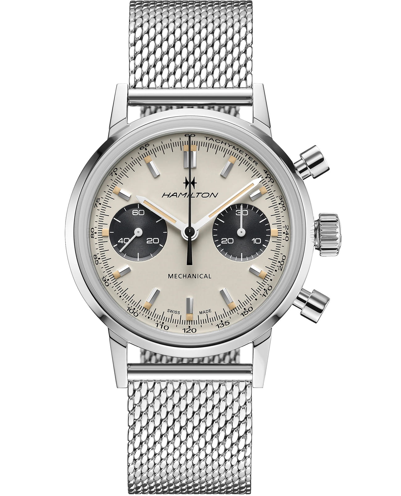 Почувствуйте дыхание часового искусства при каждом заводе Hamilton American Classic Intra-Matic Chronograph H H38429110. Модель, оснащенная механизмом хронографа с ручным заводом H-51, воплощает собой часы с душой. Выпуклое сапфировое стекло с двусторонним антибликовым покрытием защищает фирменный циферблат окраски «панда», который придает механической версии винтажного изделия особую аутентичность.