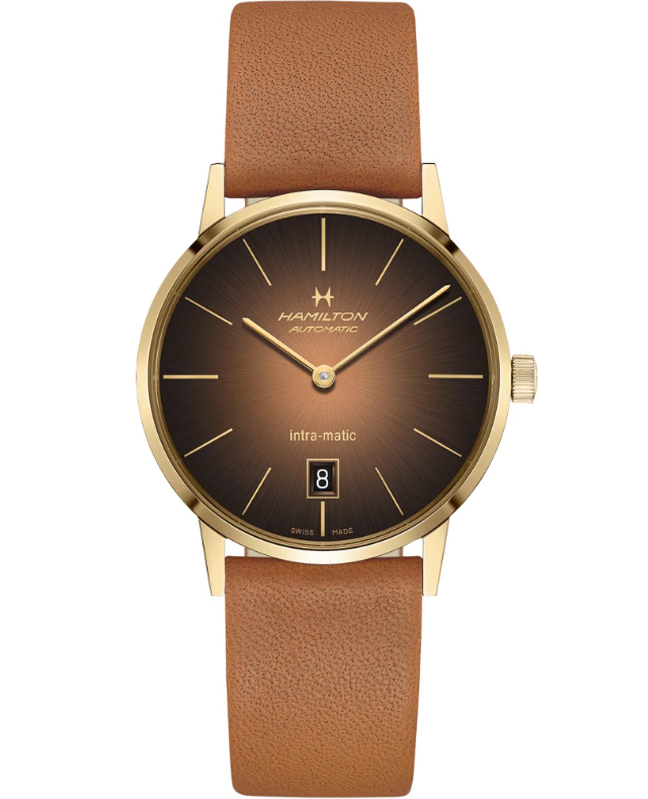 Мужские наручные часы Hamilton American Classic Intra-Matic Auto H38475501 с надёжным автоматическим механизмом. Корпус часов изготовлен из нержавеющей стали с золотым PVD-покрытиемPVDУльтратонкое покрытие наносится в технике вакуумного напыления, сочетает в себе нитрид титана особой прочности со слоем золота или оксида хрома. Несёт в себе декоративную или защитную функцию.. Практичный кожаный ремешок на стандартной застёжке. Сапфировое стеклоСапфировое стеклоПрочный и надёжный материал из кристалла сапфира синтетического происхождения, характеризующийся особой твёрдостью и устойчивостью к царапинам и повреждениям. с антибликовым покрытием. Окошко даты находится в положении 6 часов.