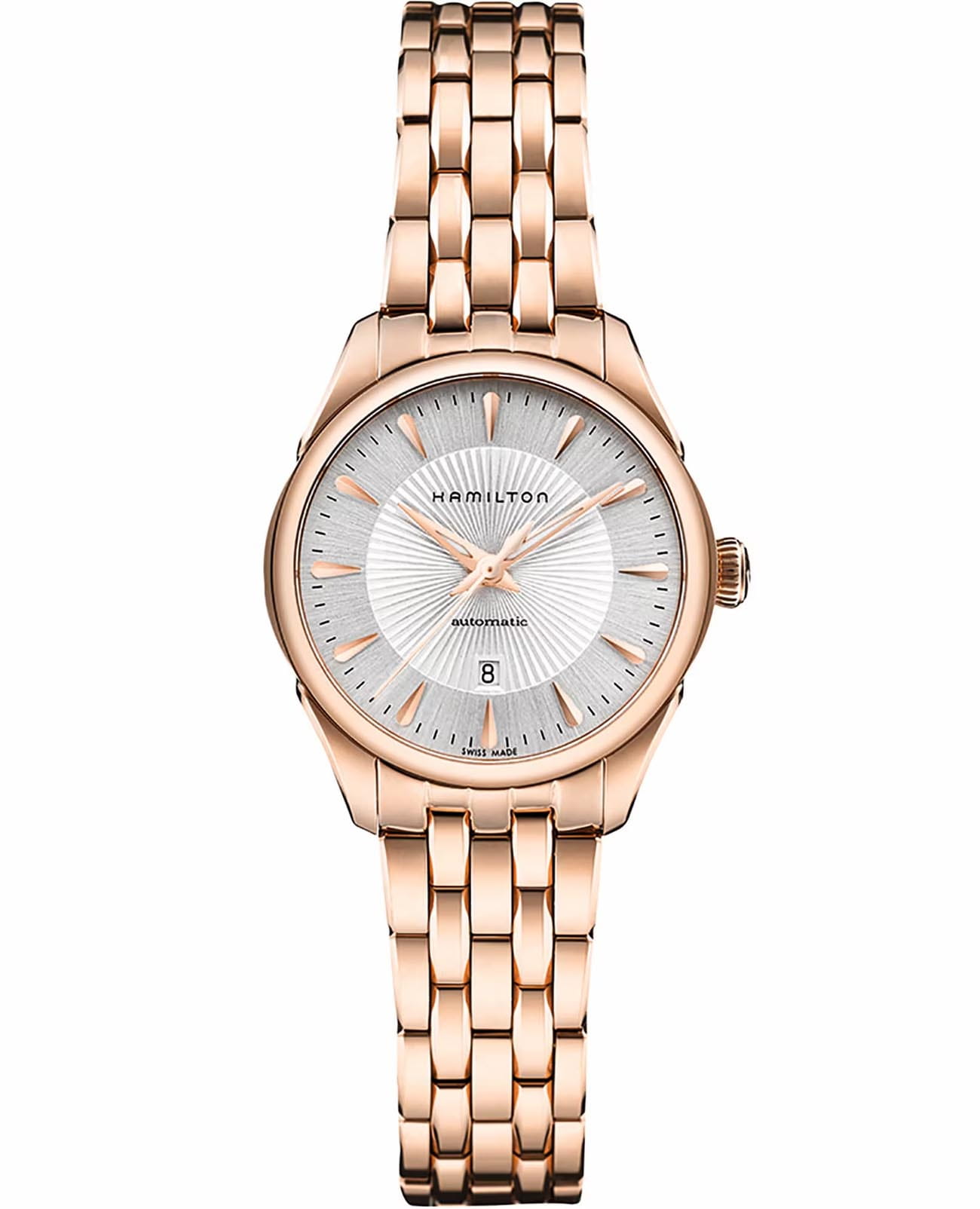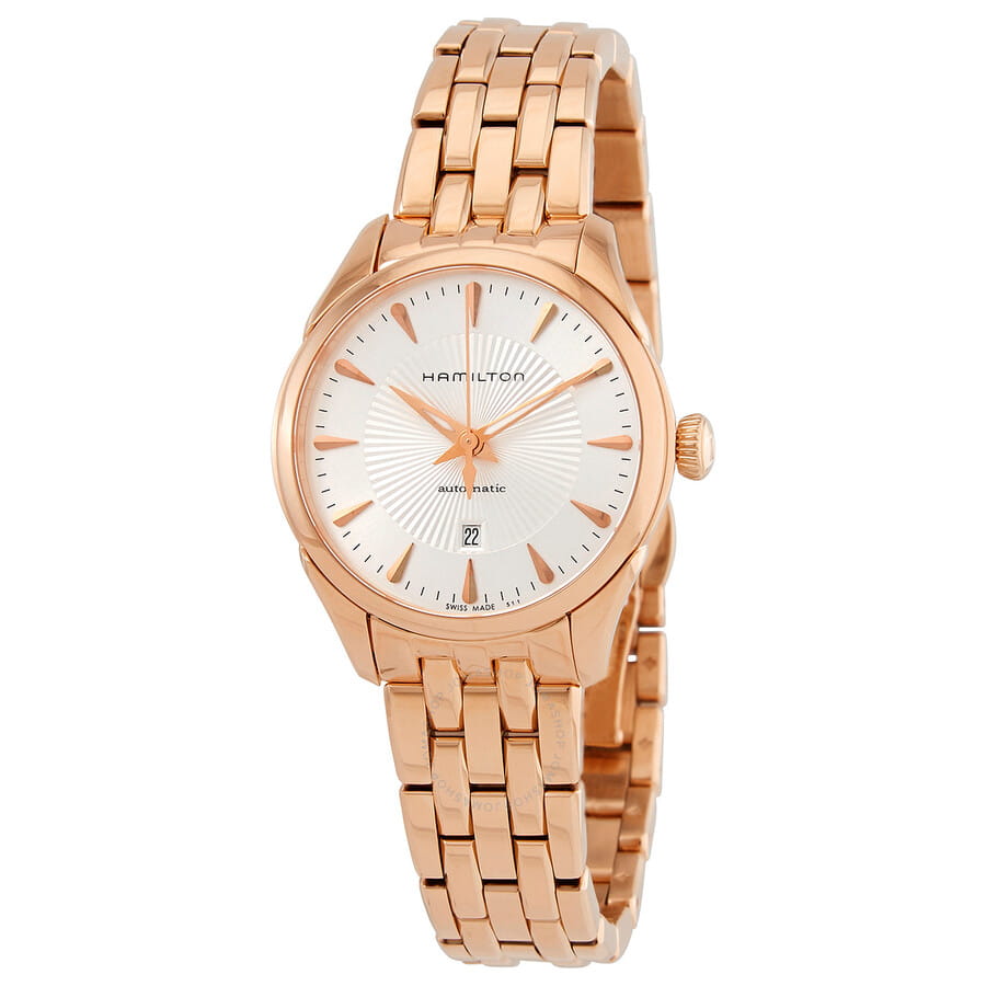 Женские механические часы Hamilton Jazzmaster Lady Auto H42245151 с автоматическим подзаводом. Корпус и браслет изготовлены из нержавеющей стали с PVD-покрытиемPVDУльтратонкое покрытие наносится в технике вакуумного напыления, сочетает в себе нитрид титана особой прочности со слоем золота или оксида хрома. Несёт в себе декоративную или защитную функцию.. Сапфировое стеклоСапфировое стеклоПрочный и надёжный материал из кристалла сапфира синтетического происхождения, характеризующийся особой твёрдостью и устойчивостью к царапинам и повреждениям. с антибликовым покрытием. Стальной браслет на застёжке-бабочке с кнопкамиЗастёжка "бабочка"Такой вид застёжки дополняется предохранителями, помогающими избежать случайного раскрытия браслета. Обладают изящным исполнением. . Стрелки с люминесцентным покрытиемЛюминесцентное покрытиеПозволяет считывать показания времени в темноте. Производители наносят на стрелки, часовые индексы, безель или поверхность циферблата светонакопительный состав, дающий холодное свечение.. Класс водозащиты: 50 метров, позволит защитить корпус от случайных брызг или капель дождя. Окошко даты находится в положении 6 часов.