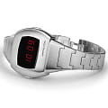 Hamilton American Classic PSR 74 H52304130 — современное переосмысление легендарных цифровых часов Pulsar 1974 года в культовом ретро-дизайне. Компактный корпус 25,6 × 30,9 мм выполнен из матовой нержавеющей стали и отличается лаконичной прямоугольной формой. Дисплей представляет собой гибрид: постоянная LCD-индикация дополнена активируемой LED-подсветкой, отображающей красные цифры времени при нажатии кнопки. Циферблат защищён сапфировым стекломСапфировое стеклоПрочный и надёжный материал из кристалла сапфира синтетического происхождения, характеризующийся особой твёрдостью и устойчивостью к царапинам и повреждениям. с антибликовым покрытием. Кварцевый механизм обеспечивает точную работу и до 4 лет автономной службы. Формат отображения времени может быть выбран между 12- и 24-часовым, также доступен показ даты. Часы укомплектованы браслетом из нержавеющей стали с широкими звеньями и застёжкой 'бабочка'Застёжка "бабочка"Такой вид застёжки дополняется предохранителями, помогающими избежать случайного раскрытия браслета. Обладают изящным исполнением. , обеспечивающей удобную посадку и надёжную фиксацию. Водонепроницаемость 100 метров делает модель подходящей для повседневного использования и плавания. Идеальный выбор для тех, кто ценит эстетическую ностальгию и передовые технологии.