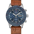 Ориентируйтесь в небе с помощью нашего автоматического хронографаХронографФункция позволяет измерять отрезки времени с особой точностью: часы, минуты, секунды. Верным признаком хронографа является наличие на циферблате 3 дополнительных окошек-счётчиков. Khaki Aviation Converter Auto Chrono, оснащенного двунаправленным вращающимся безелемБезельВнешний ободок, закрепляющий стекло. В спортивных часах так называется поворотное кольцо с делениями на циферблате, выполняет роль таймера – замеряет отрезки времени на шкале. Неподвижный безель – элемент декора. Однонаправленно вращающийся безель на дайверских часах позволяет фиксировать моменты погружения и выныривания на поверхность. с логарифмической линейкой для быстрого расчета важнейших конверсий и показателей. Оснащенные механизмом H-21-Si с силиконовой пружиной для повышения производительности и точности, эти часы идеально сочетают функциональность и авиационную эстетику: 44-миллиметровый корпус из нержавеющей стали сочетается с коричневым кожаным ремешком и синим циферблатом, напоминающим о чистом небе.