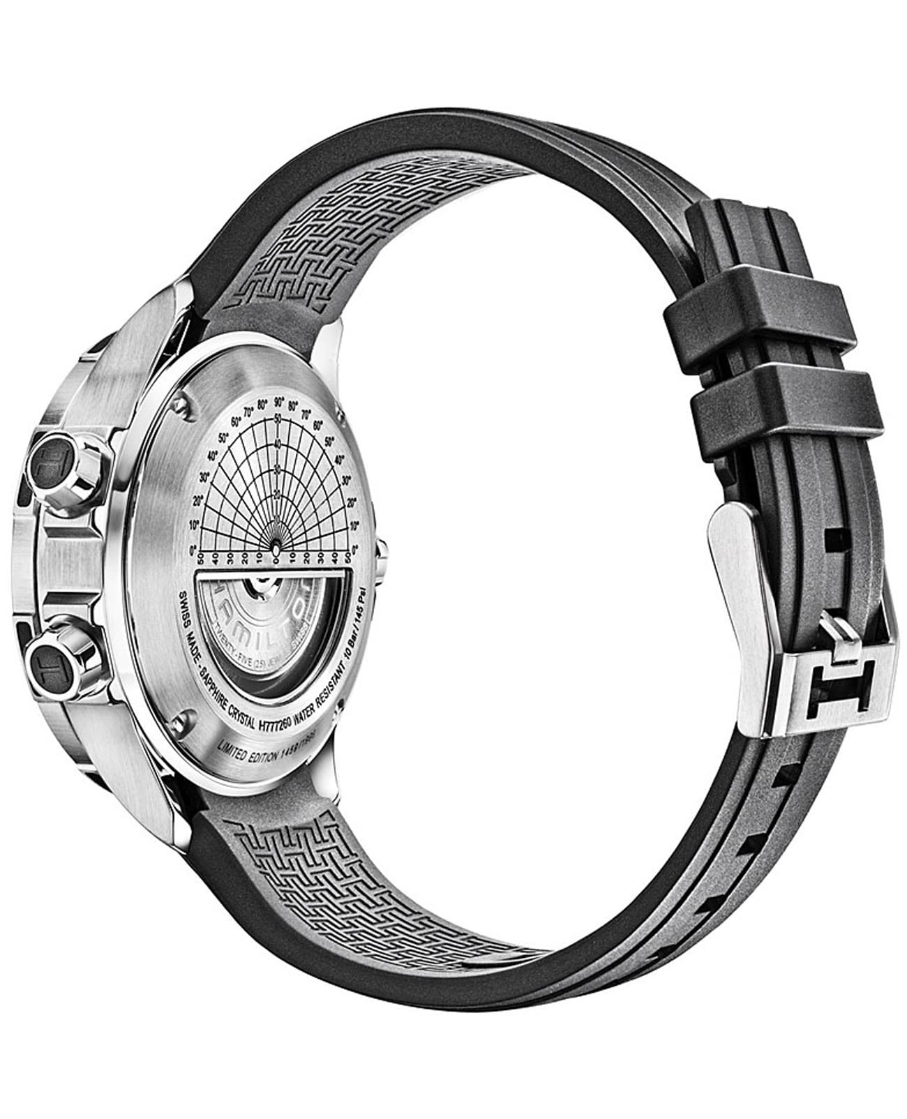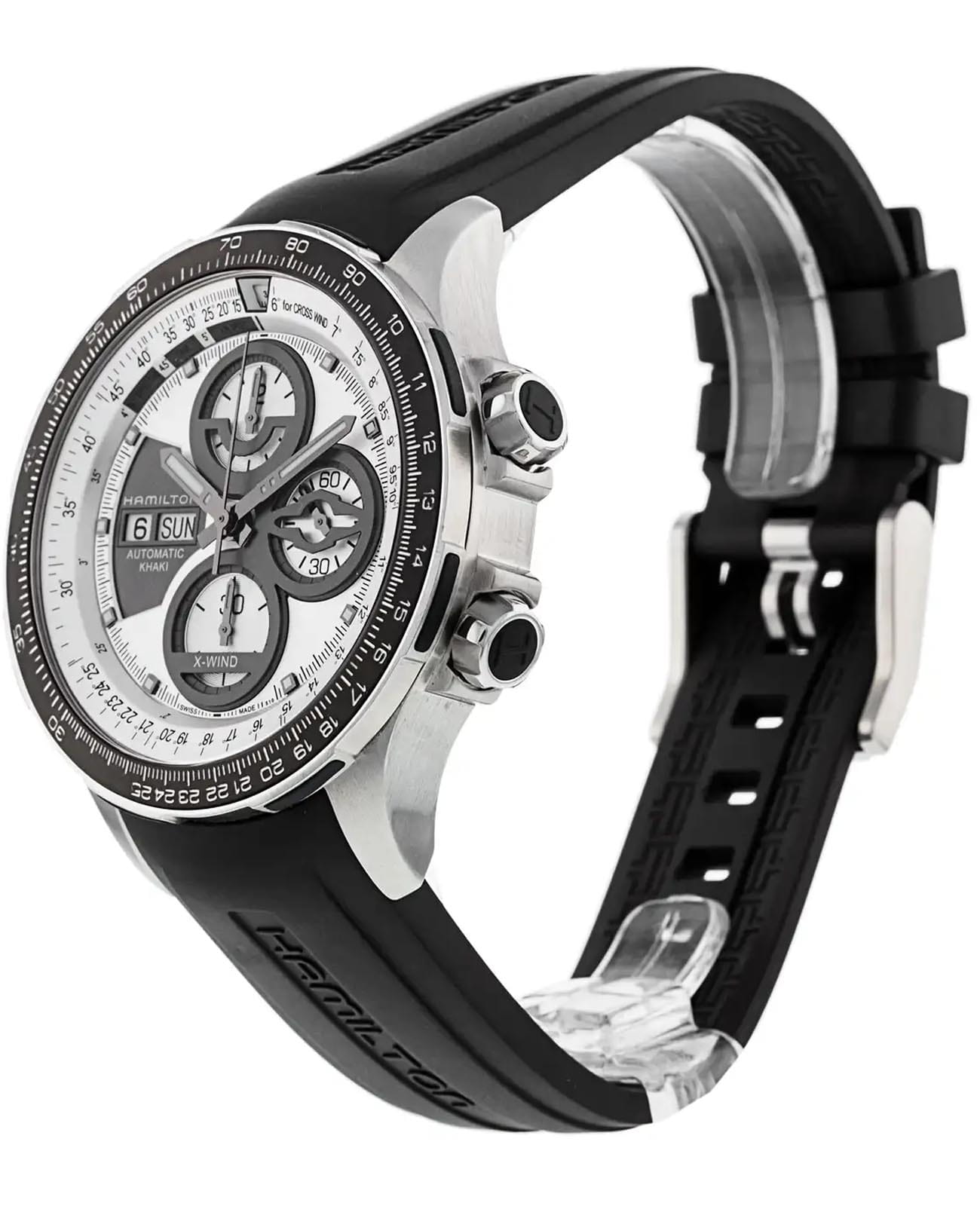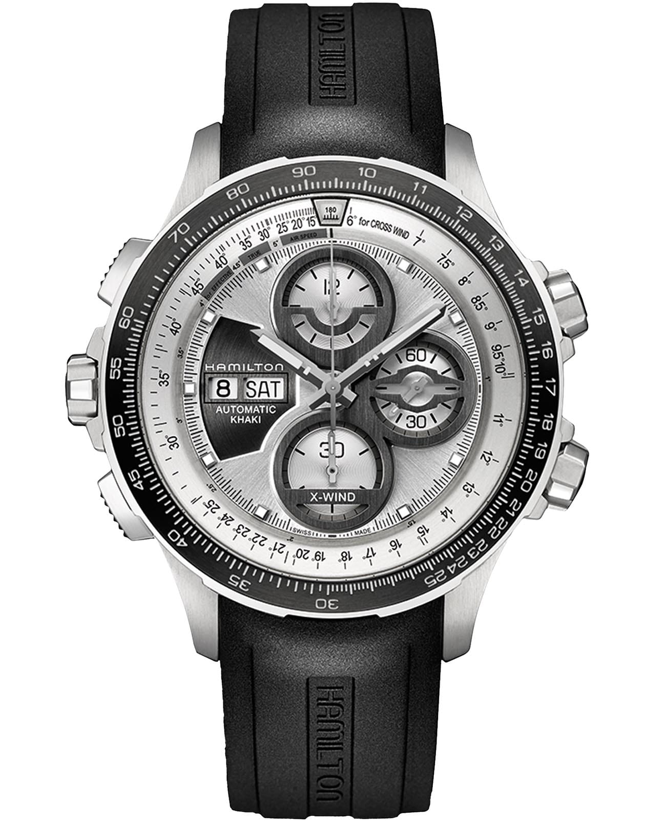 Мужские механические швейцарские часы-хронограф Hamilton Khaki Aviation X-Wind Auto Chrono H77726351. Корпус часов изготовлен из нержавеющей стали. Каучуковый ремешок на стандартной застёжке. Сапфировое стеклоСапфировое стеклоПрочный и надёжный материал из кристалла сапфира синтетического происхождения, характеризующийся особой твёрдостью и устойчивостью к царапинам и повреждениям. устойчивое к мелким механическим повреждениям. Класс водозащиты: 100 метров, позволит плавать, нырять и заниматься другими водными видами спорта. БезельБезельВнешний ободок, закрепляющий стекло. В спортивных часах так называется поворотное кольцо с делениями на циферблате, выполняет роль таймера – замеряет отрезки времени на шкале. Неподвижный безель – элемент декора. Однонаправленно вращающийся безель на дайверских часах позволяет фиксировать моменты погружения и выныривания на поверхность. с PVD-покрытиемPVDУльтратонкое покрытие наносится в технике вакуумного напыления, сочетает в себе нитрид титана особой прочности со слоем золота или оксида хрома. Несёт в себе декоративную или защитную функцию.. Стрелки и метки с люминесцентным покрытиемЛюминесцентное покрытиеПозволяет считывать показания времени в темноте. Производители наносят на стрелки, часовые индексы, безель или поверхность циферблата светонакопительный состав, дающий холодное свечение.. Окошки дня недели и даты находятся в положении 9 часов. Калькулятор угла сноса на задней крышке.