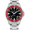 Часы Hamilton Khaki Navy Scuba Automatic (H82405130) сочетают функциональность дайверских часов с ярким дизайном, заключены в 40-мм корпус из нержавеющей стали с красным алюминиевым безелемБезельВнешний ободок, закрепляющий стекло. В спортивных часах так называется поворотное кольцо с делениями на циферблате, выполняет роль таймера – замеряет отрезки времени на шкале. Неподвижный безель – элемент декора. Однонаправленно вращающийся безель на дайверских часах позволяет фиксировать моменты погружения и выныривания на поверхность., вдохновлённого морской тематикой. Модель оснащена автоматическим калибром H-10 с увеличенным запасом хода 80 часов и спиралью баланса Nivachron™Nivachron™Специально разработанный инновационный сплав Nivachron™ повышает устойчивость часов к воздействию магнитных полей., обеспечивающей устойчивость к магнитным полям и температурным перепадам. Чёрный циферблат с люминесцентными метками Super-LumiNova гарантирует чёткую видимость в темноте, а сапфировое стеклоСапфировое стеклоПрочный и надёжный материал из кристалла сапфира синтетического происхождения, характеризующийся особой твёрдостью и устойчивостью к царапинам и повреждениям. с антибликовым покрытиемАнтибликовое покрытиеСлой оксида металла в 0,13-0,3 микрон, благодаря которому стекло часов не бликует и не отражает свет. Антибликовое покрытие уменьшает отражение света в 10 раз, обеспечивая отличную читаемость показателей циферблата. защищает от царапин. Водонепроницаемость до 100 метров (10 бар) делает часы надёжным спутником для плавания. Комплектуется стальным браслетом шириной 20 мм с раскладной застёжкойРаскладная застёжкаТакой тип застёжки используется только на браслетах из металла. Она никогда не раскрывается полностью, происходит разделение на 2 и более частей. Раскладывающая застёжка снизит вероятность потери часов к минимуму., сочетающим комфорт и долговечность.