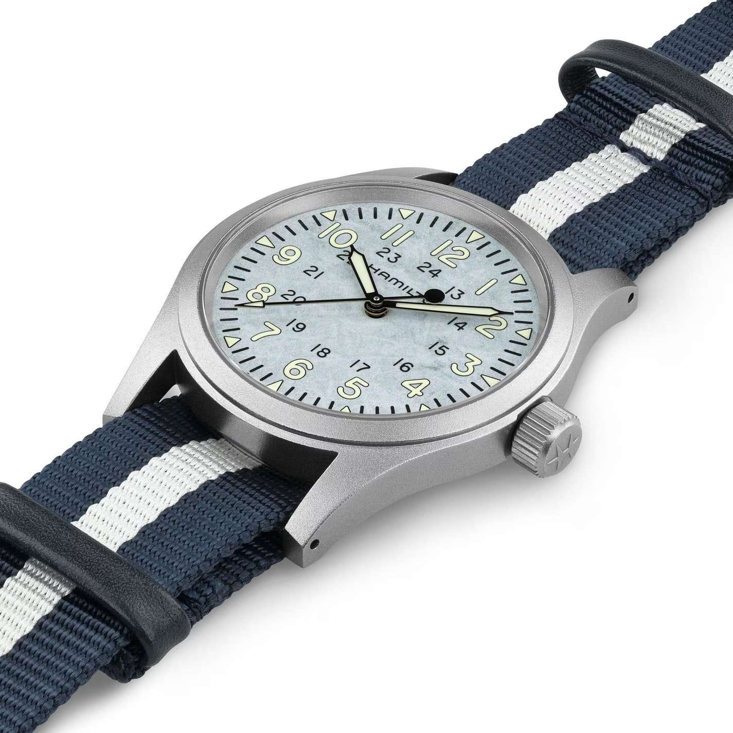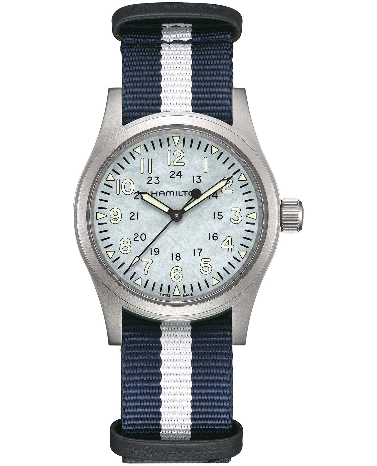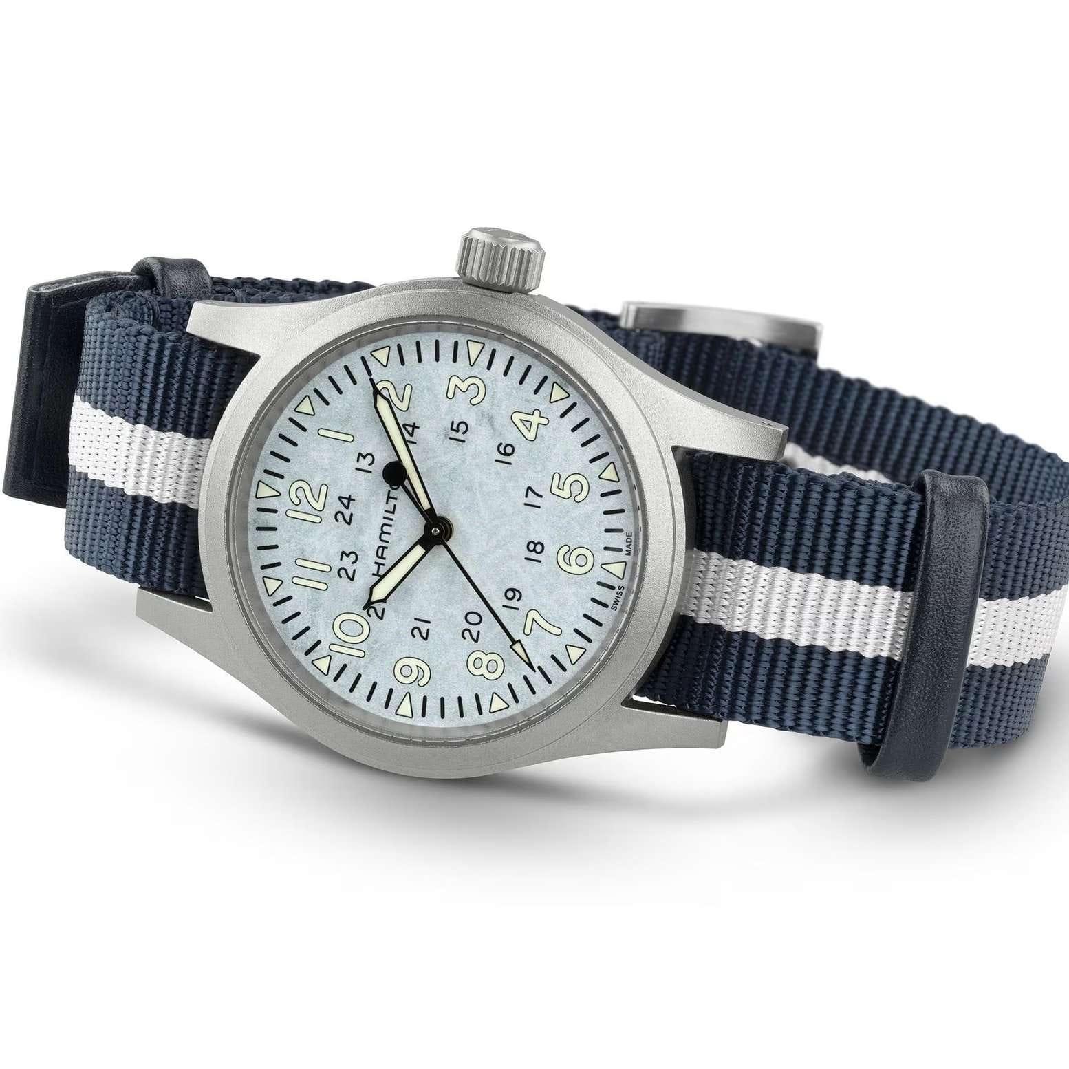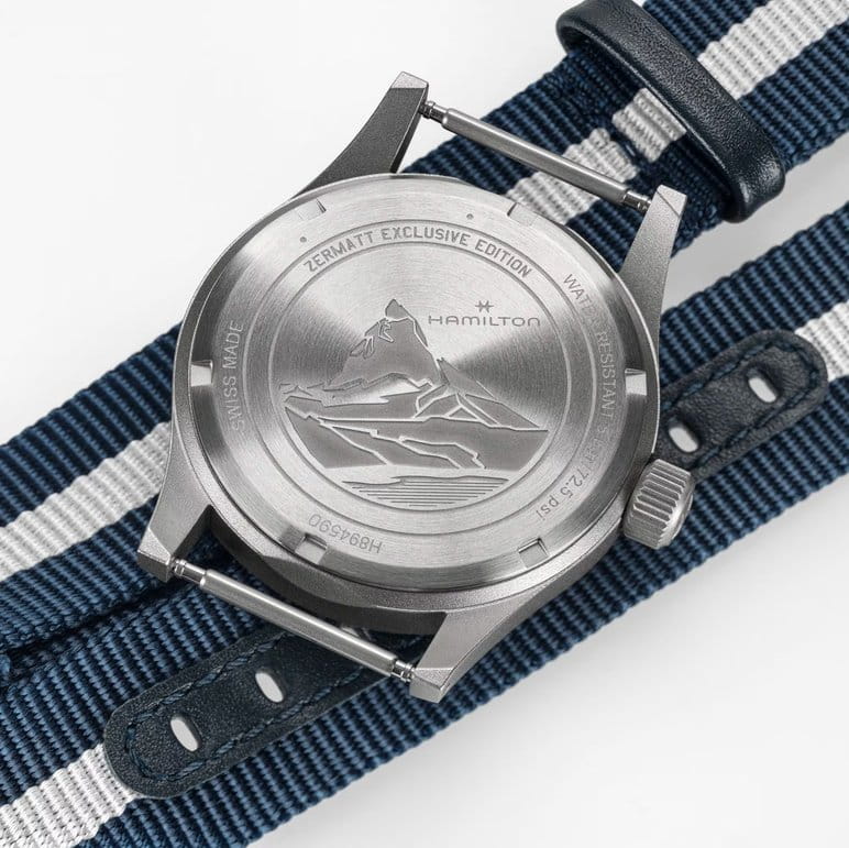 Мужские швейцарские часы Hamilton Khaki Field Mechanical Exclusive Edition H89459940 - механический механизм (автоматический калибр) с высокой точностью. Циферблат дополнен сине-белым полосатым ремешком, который символизирует цвета снега в тени и на солнце. Завершает образ этой эксклюзивной серии задняя крышка корпуса, украшенная искусной гравировкой силуэта Маттерхорна. Сапфировое стеклоСапфировое стеклоПрочный и надёжный материал из кристалла сапфира синтетического происхождения, характеризующийся особой твёрдостью и устойчивостью к царапинам и повреждениям. устойчивое к появлению царапин, обладающее высокой прозрачностью. Класс водозащиты: 50 метров позволит защитить корпус от случайных брызг или капель дождя. Корпус часов изготовлен из нержавеющей стали, диаметром 38 мм и толщиной 9.5 мм. Текстильный ремешок NATOРемешок NATOРемешок NATO — это прочный, универсальный и сменный часовой ремешок, изначально созданный для военных. Он изготовлен из нейлона или другого прочного материала и имеет уникальную конструкцию, которая позволяет часам оставаться на запястье даже в случае поломки одной из прикрепляющих точек. на стандартной застежке обеспечивает комфортное ношение на запястье. Стрелки и метки с люминесцентным покрытиемЛюминесцентное покрытиеПозволяет считывать показания времени в темноте. Производители наносят на стрелки, часовые индексы, безель или поверхность циферблата светонакопительный состав, дающий холодное свечение. Super-LumiNova® обеспечивает отличную видимость в темноте. Часы Khaki Field Mechanical – это точная копия своего оригинального предшественника 1960-х годов и верны военному наследию Hamilton, обладая механическим калибром и запасом хода до 80 часов. Откройте для себя нашу коллекцию Khaki Field.