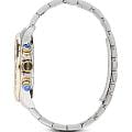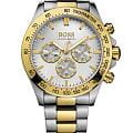 Мужские кварцевые часы Hugo Boss Ikon HB1512960 представлены в двухцветном корпусе из нержавеющей стали с IP-покрытиемIP-покрытиеМетод ионного напыления. Демонстрирует повышенную устойчивость к истиранию, окислению и химическим веществам. Под воздействием высокого давления и температуры около 1500°C молекулы металла надёжно соединяются с частицами корпуса часов. диаметром 46 мм, сочетая стильный дизайн с функциональностью хронографа. Модель оснащена кварцевым механизмом с тремя субдиалами (60-секундный, 30-минутный и 24-часовой счетчики), дополненными тахиметрической шкалойТахиметрРазмеченная шкала, располагается на ободке или безеле часов. Тахиметр позволяет рассчитать скорость на определённом участке пути, расстояние измеряется в километрах или милях. на золотистом безелеБезельВнешний ободок, закрепляющий стекло. В спортивных часах так называется поворотное кольцо с делениями на циферблате, выполняет роль таймера – замеряет отрезки времени на шкале. Неподвижный безель – элемент декора. Однонаправленно вращающийся безель на дайверских часах позволяет фиксировать моменты погружения и выныривания на поверхность.. Серебристый циферблат с позолоченными метками и стрелками защищен прочным минеральным стекломМинеральное стеклоМинеральное стекло представляет собой искусственно выращенный минерал кварца. Такое стекло отличается особой устойчивостью к повреждениям и царапинам. Уступает по некоторым качествам сапфировому стеклу., обеспечивающим отличную читаемость. Двухцветный браслет из нержавеющей стали шириной 20-22 мм обеспечивает комфортную посадку на запястье. Ударопрочный корпусУдаропрочный корпусМеханизм заключён в корпус, выполненный из современных материалов, устойчивых к ударам, механическим повреждениям и падению с высоты: инновационный пластик, карбон, нержавеющая сталь, титан. с делает часы устойчивыми к повседневным нагрузкам.