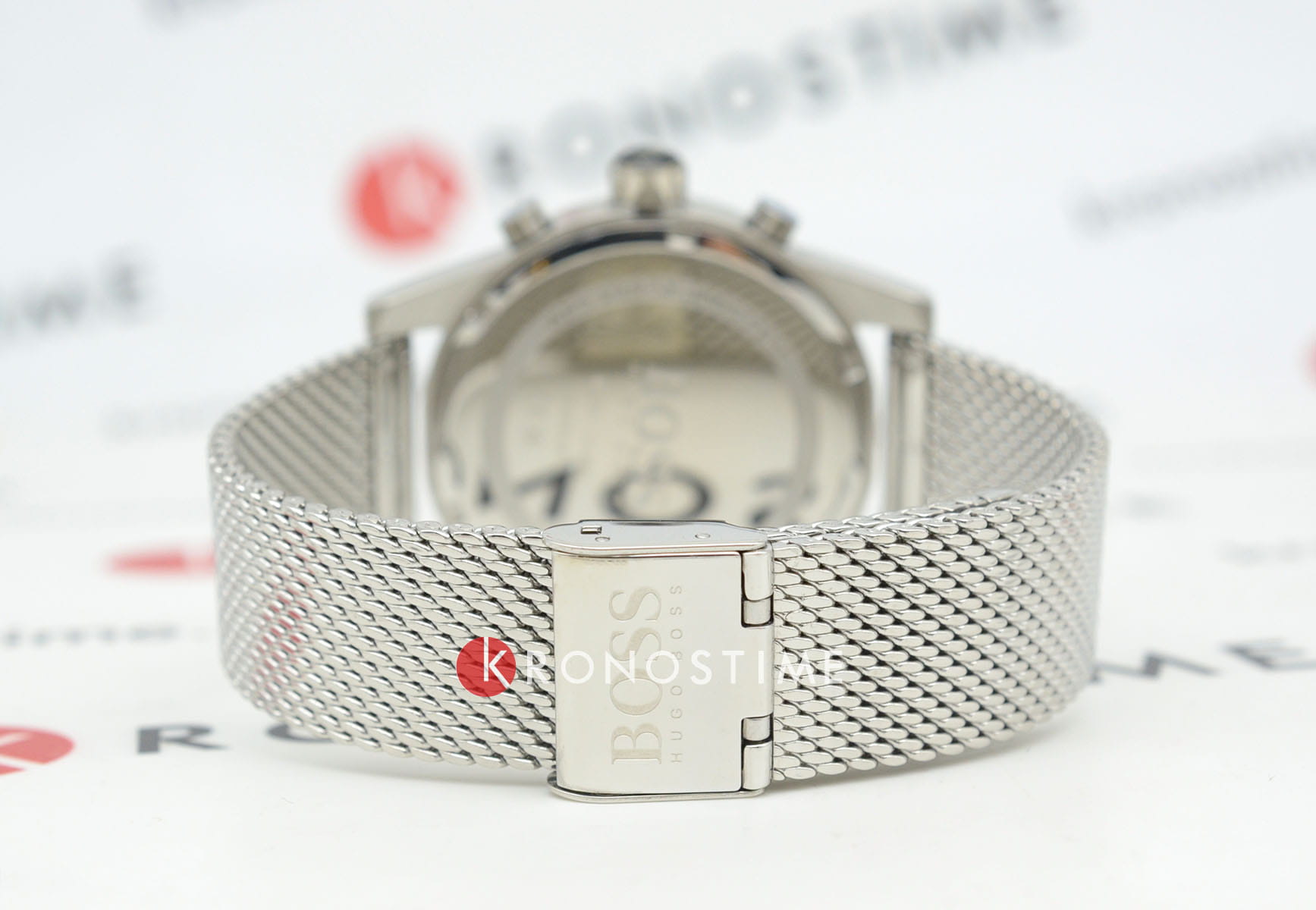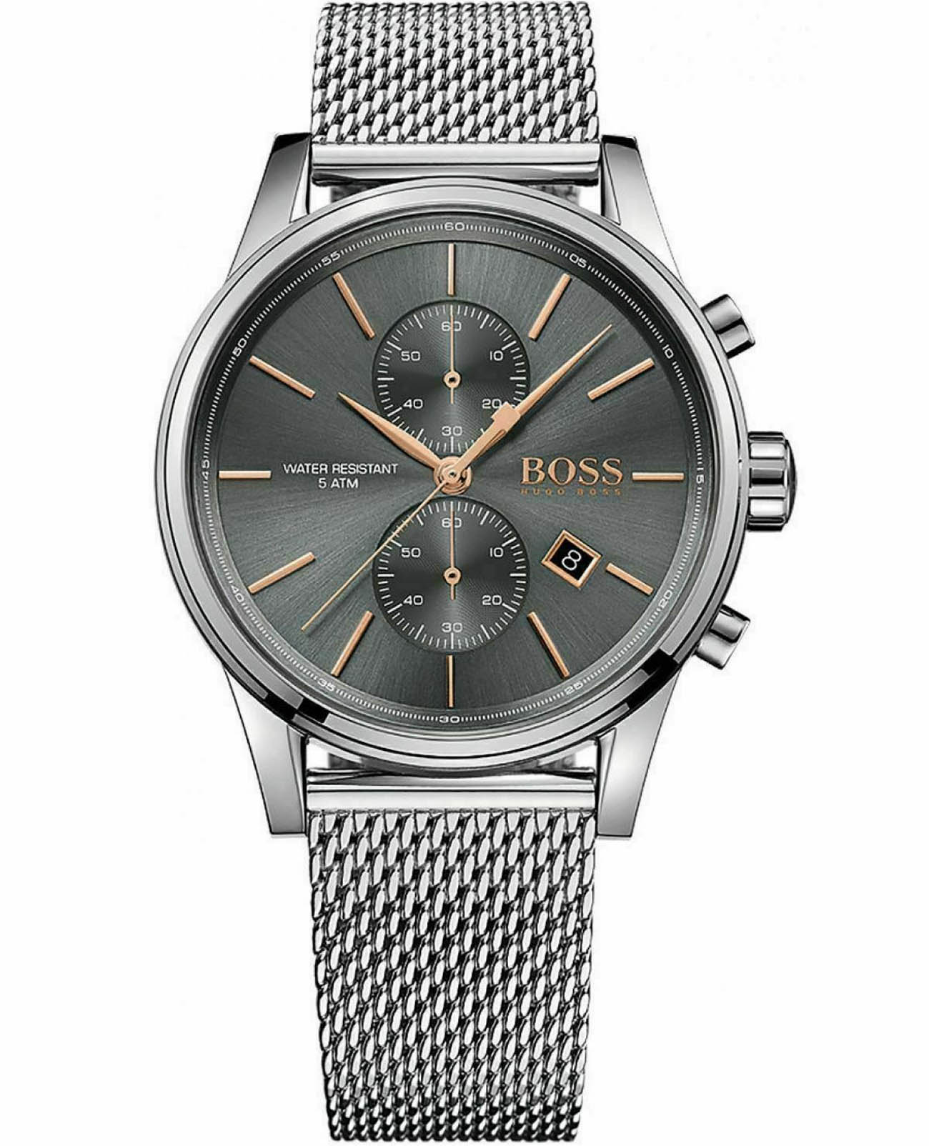 Мужские часы Hugo Boss Jet HB1513440 из коллекции сочетают современный дизайн и функциональность в 40-мм корпусе из нержавеющей стали серебристого цвета. Модель оснащена кварцевым механизмом, обеспечивающим точность хода, и функциями хронографаХронографФункция позволяет измерять отрезки времени с особой точностью: часы, минуты, секунды. Верным признаком хронографа является наличие на циферблате 3 дополнительных окошек-счётчиков. с cекундомеромСекундомерСекундоме́р — прибор, способный измерять интервалы времени с точностью до долей секунды., а также индикацией даты в положении 3 часа. Серый циферблат с арабскими цифрами и метками защищен устойчивым к царапинам минеральным стекломМинеральное стеклоМинеральное стекло представляет собой искусственно выращенный минерал кварца. Такое стекло отличается особой устойчивостью к повреждениям и царапинам. Уступает по некоторым качествам сапфировому стеклу., а стальной браслет с "миланским плетением" дополнен раскладной застёжкойРаскладная застёжкаТакой тип застёжки используется только на браслетах из металла. Она никогда не раскрывается полностью, происходит разделение на 2 и более частей. Раскладывающая застёжка снизит вероятность потери часов к минимуму.. Часы обладают водонепроницаемостью WR50 (5 атм), что позволяет использовать их при плавании и защищает от брызг или дождя.