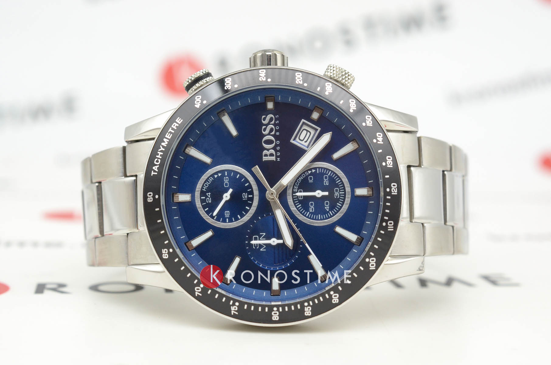 Мужские часы Hugo Boss Rafale Blue HB1513510 представлены в круглом 44-мм корпусе из нержавеющей стали. Часы оснащены кварцевым механизмом с функциями хронографаХронографФункция позволяет измерять отрезки времени с особой точностью: часы, минуты, секунды. Верным признаком хронографа является наличие на циферблате 3 дополнительных окошек-счётчиков., секундомеромСекундомерСекундоме́р — прибор, способный измерять интервалы времени с точностью до долей секунды., а также тахиметрической шкалой на неподвижном безелеБезельВнешний ободок, закрепляющий стекло. В спортивных часах так называется поворотное кольцо с делениями на циферблате, выполняет роль таймера – замеряет отрезки времени на шкале. Неподвижный безель – элемент декора. Однонаправленно вращающийся безель на дайверских часах позволяет фиксировать моменты погружения и выныривания на поверхность. с IP-покрытиемIP-покрытиеМетод ионного напыления. Демонстрирует повышенную устойчивость к истиранию, окислению и химическим веществам. Под воздействием высокого давления и температуры около 1500°C молекулы металла надёжно соединяются с частицами корпуса часов. для расчетов скорости. Окошко даты на позиции 4 часа. Эффектный синий циферблат защищен минеральным стекломМинеральное стеклоМинеральное стекло представляет собой искусственно выращенный минерал кварца. Такое стекло отличается особой устойчивостью к повреждениям и царапинам. Уступает по некоторым качествам сапфировому стеклу.. Люминесцентное покрытиеЛюминесцентное покрытиеПозволяет считывать показания времени в темноте. Производители наносят на стрелки, часовые индексы, безель или поверхность циферблата светонакопительный состав, дающий холодное свечение. на стрелках и метках обеспечивает отличную видимость в темноте. Стальной браслет с раскладной застёжкойРаскладная застёжкаТакой тип застёжки используется только на браслетах из металла. Она никогда не раскрывается полностью, происходит разделение на 2 и более частей. Раскладывающая застёжка снизит вероятность потери часов к минимуму. обеспечивает удобную посадку. Водонепроницаемость 50 метров (5 ATM) защищает от брызг. Эта модель станет отличным выбором для тех, кто ценит стиль и функциональность в одном аксессуаре.
