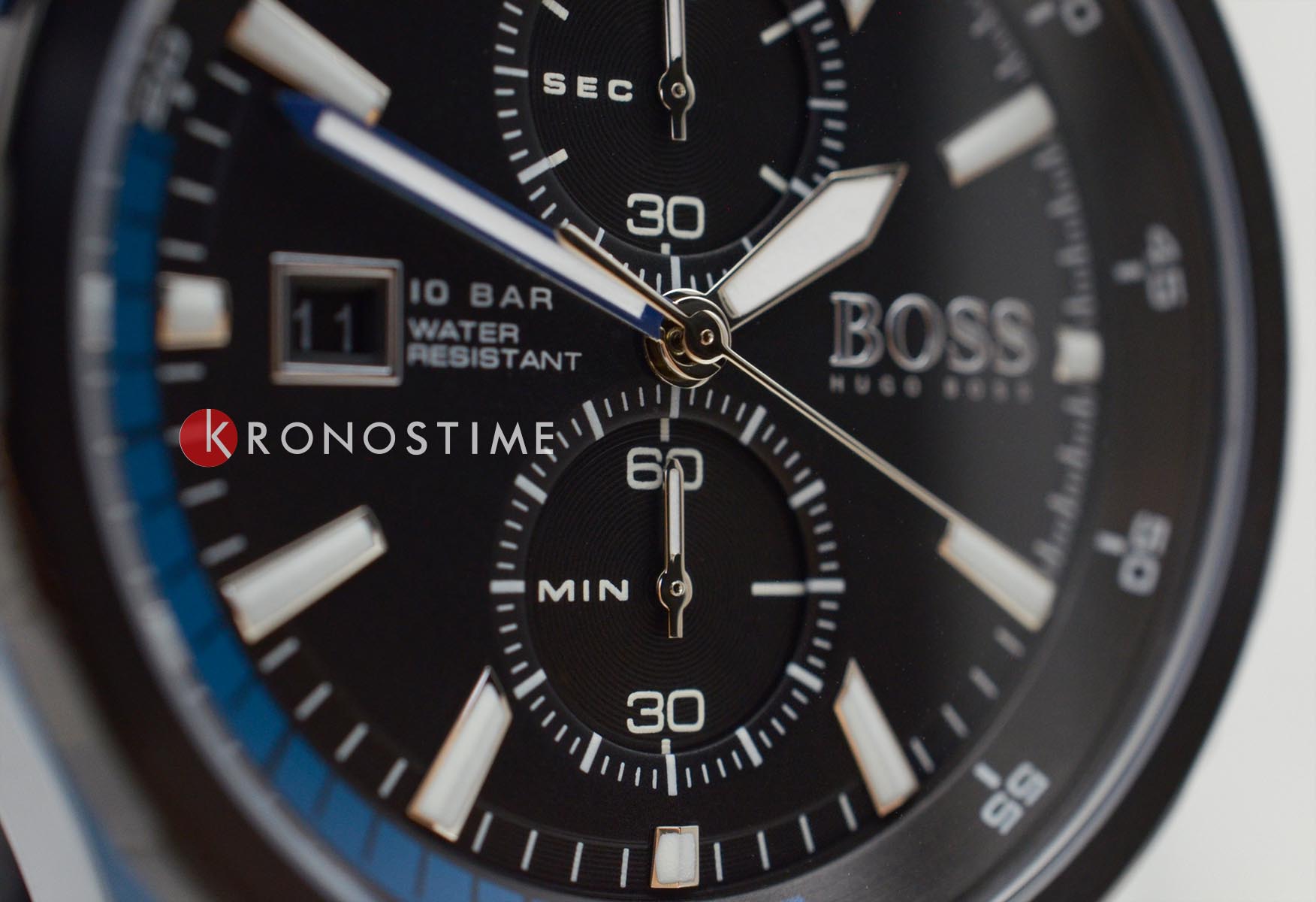 Мужские часы Hugo Boss Globetrotter HB1513824 представлены в круглом 46-мм корпусе из нержавеющей стали с синим IP-покрытиемIP-покрытиеМетод ионного напыления. Демонстрирует повышенную устойчивость к истиранию, окислению и химическим веществам. Под воздействием высокого давления и температуры около 1500°C молекулы металла надёжно соединяются с частицами корпуса часов. толщиной 11–12 мм. Оснащены кварцевым механизмом с функцией хронографаХронографФункция позволяет измерять отрезки времени с особой точностью: часы, минуты, секунды. Верным признаком хронографа является наличие на циферблате 3 дополнительных окошек-счётчиков., секундомеромСекундомерСекундоме́р — прибор, способный измерять интервалы времени с точностью до долей секунды. и тахиметрической шкалой на внутреннем безелеБезельВнешний ободок, закрепляющий стекло. В спортивных часах так называется поворотное кольцо с делениями на циферблате, выполняет роль таймера – замеряет отрезки времени на шкале. Неподвижный безель – элемент декора. Однонаправленно вращающийся безель на дайверских часах позволяет фиксировать моменты погружения и выныривания на поверхность.. Черный циферблат с окошком даты защищен устойчивым к царапинам минеральным стекломМинеральное стеклоМинеральное стекло представляет собой искусственно выращенный минерал кварца. Такое стекло отличается особой устойчивостью к повреждениям и царапинам. Уступает по некоторым качествам сапфировому стеклу.. Стальной браслет с IP-покрытиемIP-покрытиеМетод ионного напыления. Демонстрирует повышенную устойчивость к истиранию, окислению и химическим веществам. Под воздействием высокого давления и температуры около 1500°C молекулы металла надёжно соединяются с частицами корпуса часов. дополнен раскладной застёжкойРаскладная застёжкаТакой тип застёжки используется только на браслетах из металла. Она никогда не раскрывается полностью, происходит разделение на 2 и более частей. Раскладывающая застёжка снизит вероятность потери часов к минимуму.. Стрелки с люминесцентным покрытиемЛюминесцентное покрытиеПозволяет считывать показания времени в темноте. Производители наносят на стрелки, часовые индексы, безель или поверхность циферблата светонакопительный состав, дающий холодное свечение. обеспечивают видимость в темноте. Водонепроницаемость 100 метров (10 ATM) позволяет использовать часы для плавания.