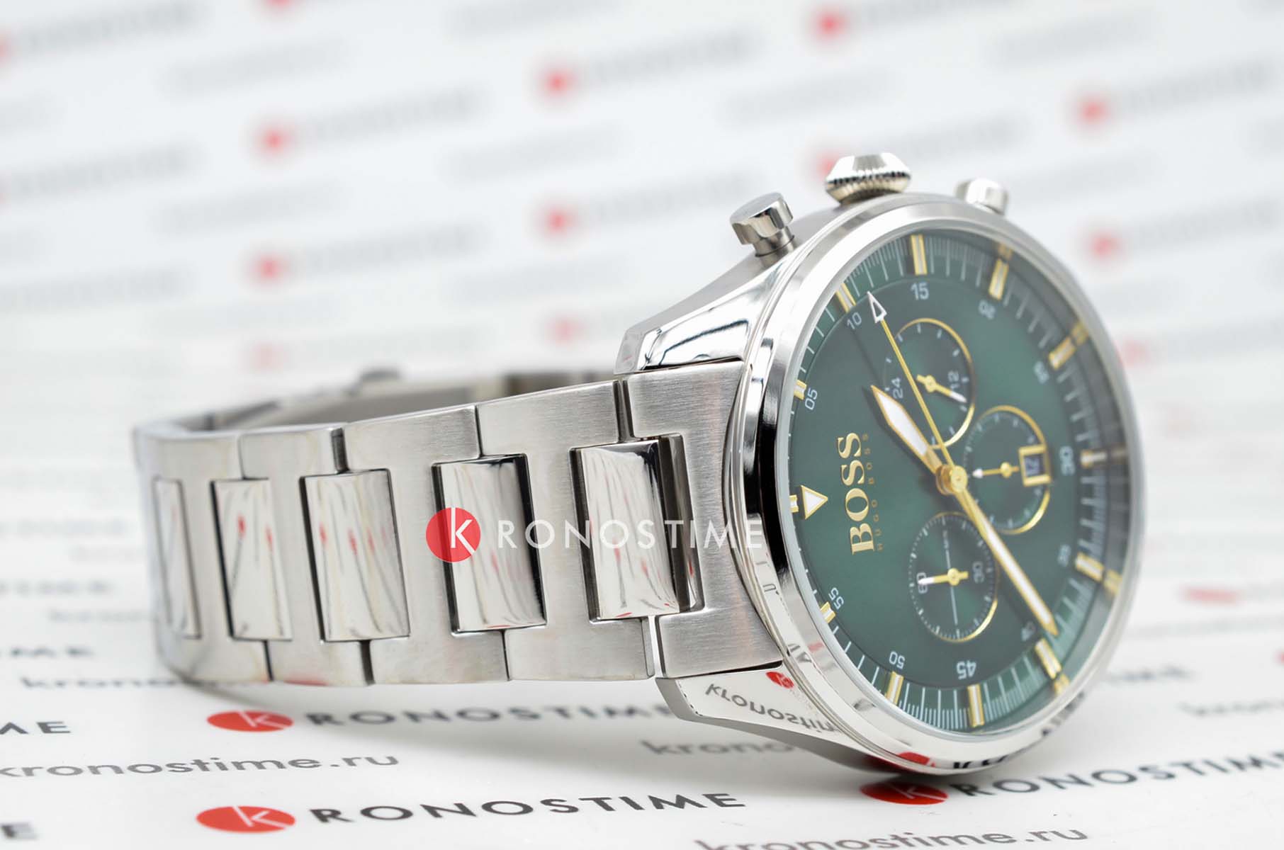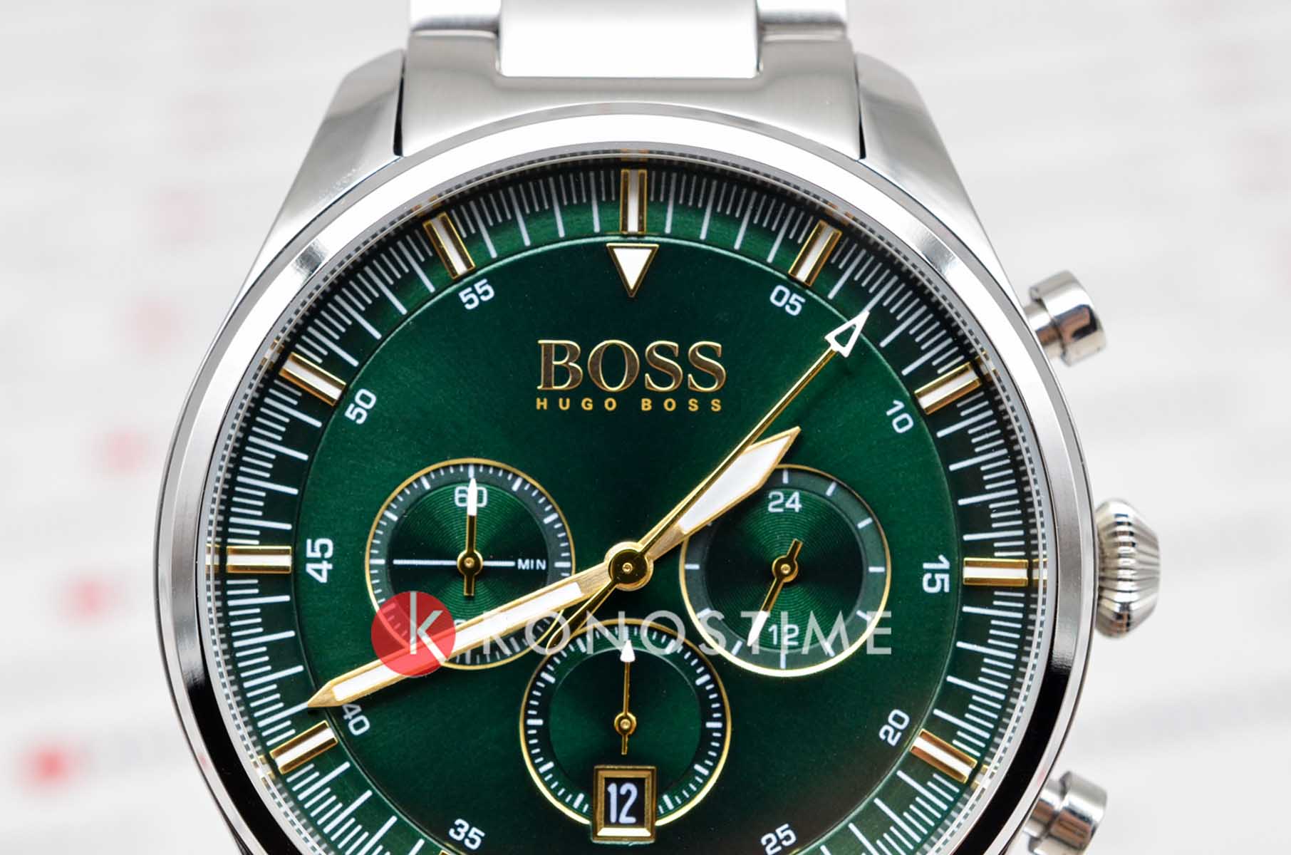 Мужские часы Hugo Boss Pioneer HB1513868 представлены в круглом 44-мм корпусе из нержавеющей стали. Оснащены кварцевым механизмом с функциями хронографаХронографФункция позволяет измерять отрезки времени с особой точностью: часы, минуты, секунды. Верным признаком хронографа является наличие на циферблате 3 дополнительных окошек-счётчиков. и секундомеромСекундомерСекундоме́р — прибор, способный измерять интервалы времени с точностью до долей секунды., а также индикацией даты. Зеленый циферблат с метками в виде штрихов защищен устойчивым к царапинам минеральным стекломМинеральное стеклоМинеральное стекло представляет собой искусственно выращенный минерал кварца. Такое стекло отличается особой устойчивостью к повреждениям и царапинам. Уступает по некоторым качествам сапфировому стеклу.. Браслет из стали дополнен раскладной застёжкойРаскладная застёжкаТакой тип застёжки используется только на браслетах из металла. Она никогда не раскрывается полностью, происходит разделение на 2 и более частей. Раскладывающая застёжка снизит вероятность потери часов к минимуму.. Водонепроницаемость 50 метров (5 ATM) обеспечивает защиту от брызг и дождя.