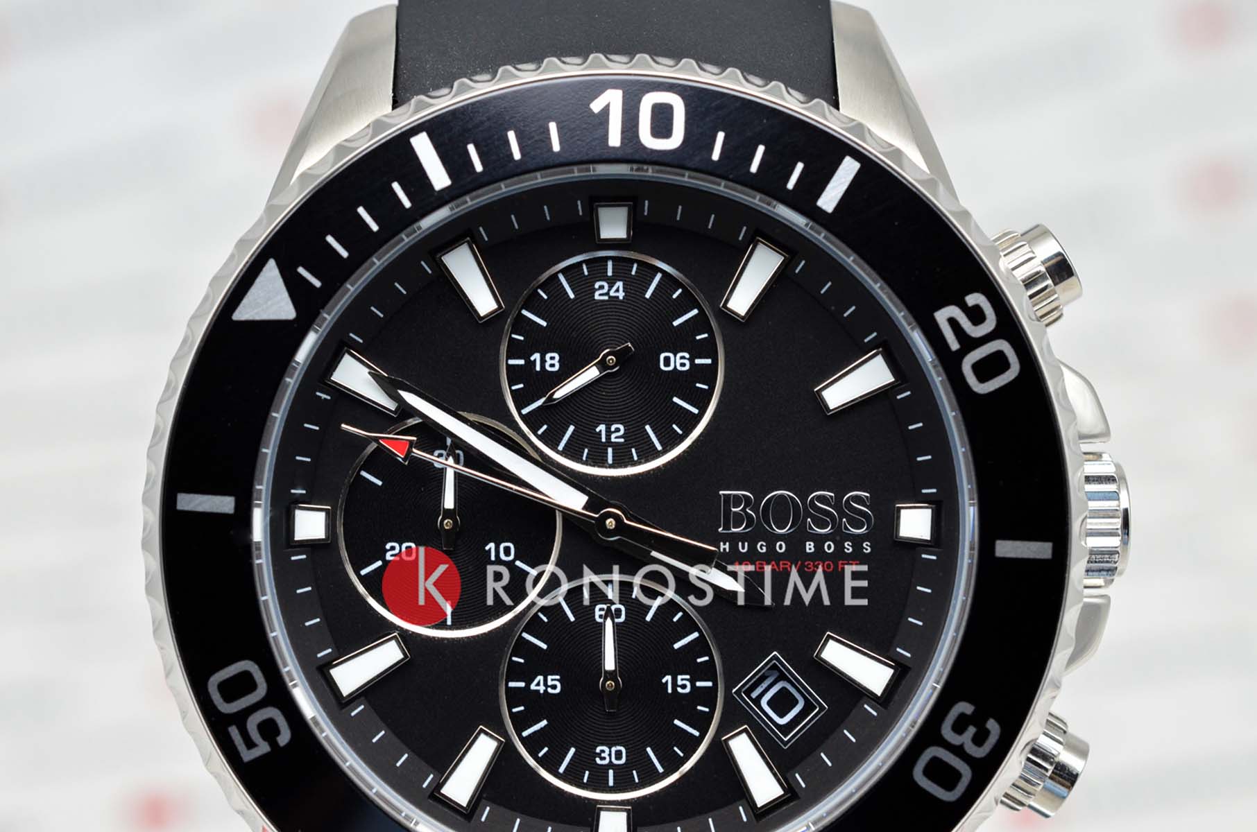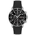 Мужские часы Hugo Boss Admiral HB1513912 представлены в круглом 45-мм корпусе из нержавеющей стали 316L с IP-покрытиемIP-покрытиеМетод ионного напыления. Демонстрирует повышенную устойчивость к истиранию, окислению и химическим веществам. Под воздействием высокого давления и температуры около 1500°C молекулы металла надёжно соединяются с частицами корпуса часов.. Оснащены кварцевым механизмом с функциями хронографаХронографФункция позволяет измерять отрезки времени с особой точностью: часы, минуты, секунды. Верным признаком хронографа является наличие на циферблате 3 дополнительных окошек-счётчиков. и секундомеромСекундомерСекундоме́р — прибор, способный измерять интервалы времени с точностью до долей секунды.. Черный циферблат защищен устойчивым к царапинам минеральным стекломМинеральное стеклоМинеральное стекло представляет собой искусственно выращенный минерал кварца. Такое стекло отличается особой устойчивостью к повреждениям и царапинам. Уступает по некоторым качествам сапфировому стеклу.. Силиконовый ремешок черного цвета дополнен стандартной застежкой, а стрелки покрыты люминесцентным составомЛюминесцентное покрытиеПозволяет считывать показания времени в темноте. Производители наносят на стрелки, часовые индексы, безель или поверхность циферблата светонакопительный состав, дающий холодное свечение. для видимости в темноте. Водонепроницаемость 100 метров (10 ATM) позволяет использовать часы для плавания.