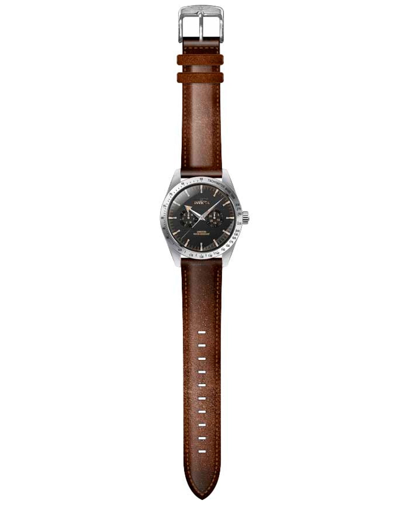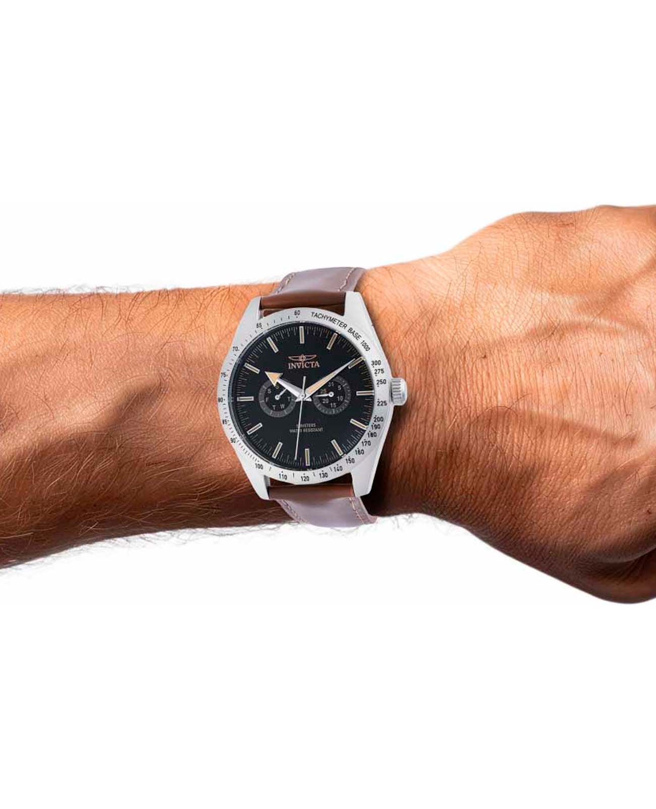 Мужские наручные часы Invicta Specialty IN45973 из коллекции Specialty сочетают в себе спортивный дизайн и надежность современных технологий. Модель обладает круглым корпусом диаметром 44 мм, выполненным из нержавеющей стали, что обеспечивает высокую устойчивость к внешним воздействиям. БезельБезельВнешний ободок, закрепляющий стекло. В спортивных часах так называется поворотное кольцо с делениями на циферблате, выполняет роль таймера – замеряет отрезки времени на шкале. Неподвижный безель – элемент декора. Однонаправленно вращающийся безель на дайверских часах позволяет фиксировать моменты погружения и выныривания на поверхность. украшен тахиметрической шкалой, придающей часам дополнительную элегантность. Кожаный ремешок на стандартной застежке, гарантирует комфортное ношение и безопасность. Черный циферблат дополнен метками в виде штрихов и светящимися стрелками с люминесцентным покрытиемЛюминесцентное покрытиеПозволяет считывать показания времени в темноте. Производители наносят на стрелки, часовые индексы, безель или поверхность циферблата светонакопительный состав, дающий холодное свечение. Tritnite, которые обеспечивают отличную видимость даже в темноте . На циферблате также вынесены отдельные окна для даты, дня недели и индикация 12-ти и 24-х часового формата времени . Для защиты используется минеральное стеклоМинеральное стеклоМинеральное стекло представляет собой искусственно выращенный минерал кварца. Такое стекло отличается особой устойчивостью к повреждениям и царапинам. Уступает по некоторым качествам сапфировому стеклу. Flame Fusion, которое обеспечивает прочность и устойчивость к царапинам . Часы оснащены кварцевым механизмом калибра Seiko TMI VH64, что гарантирует точность хода без необходимости подзаводки . Водонепроницаемость часов достигает 50 метров (5 атмосфер), что позволяет использовать их во время мытья рук или плавания, однако не рекомендуется для глубоководного дайвинга . Сочетание практичности, надежности и стильного дизайна делает эту модель универсальным аксессуаром как для повседневной носки, так и для занятий спортом .