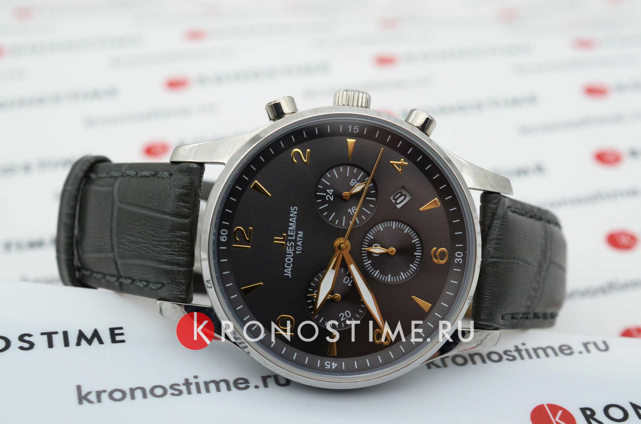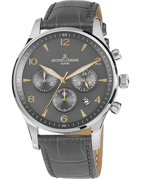 Наручные часы-хронографХронографФункция позволяет измерять отрезки времени с особой точностью: часы, минуты, секунды. Верным признаком хронографа является наличие на циферблате 3 дополнительных окошек-счётчиков. Jacques Lemans призваны ставить на первое место индивидуальный стиль владельца, классическая элегантность придётся по вкусу каждому. Брендовые часы привлекают минималистичным дизайном, отсутствие вычурности и обилия декорирующих элементов делают модель лучшим решением для ежедневного применения. Аксессуар можно носить с деловыми костюмами и повседневной одеждой, он органично сочетается как с классическими брюками, так и с рваными джинсами. Это настоящее часовое искусство высокого качества, часы считаются актуальным вариантом на все времена и с идеальной точностью показывают время благодаря надёжному японскому механизму. Дата. 12/24-часовой формат времени. СекундомерСекундомерСекундоме́р — прибор, способный измерять интервалы времени с точностью до долей секунды..