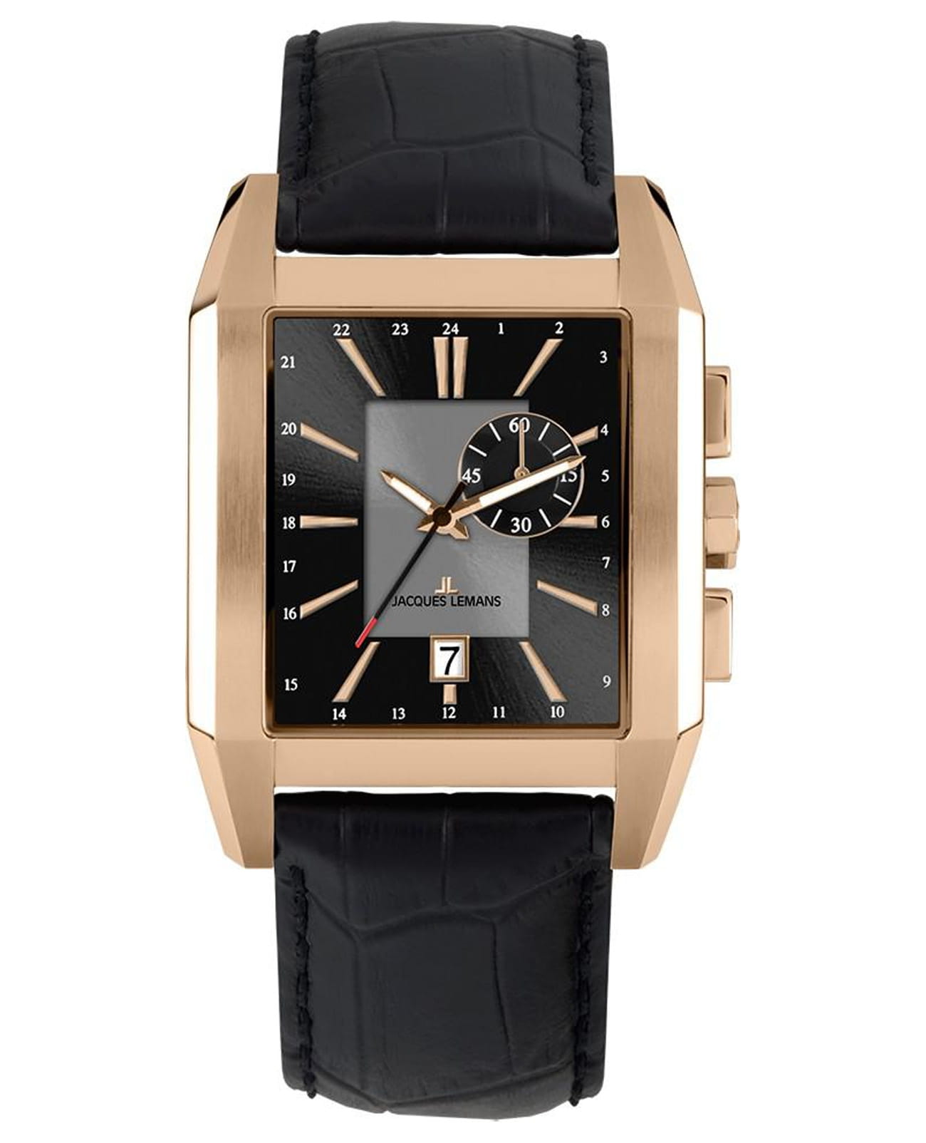 Мужские часы Jacques Lemans London 1-2162C, кварцевый механизм с высокой точностью.  Минеральное стеклоМинеральное стеклоМинеральное стекло представляет собой искусственно выращенный минерал кварца. Такое стекло отличается особой устойчивостью к повреждениям и царапинам. Уступает по некоторым качествам сапфировому стеклу. устойчивое к мелким механическим повреждениям. Корпус часов изготовлен из стали с PVD-покрытиемPVDУльтратонкое покрытие наносится в технике вакуумного напыления, сочетает в себе нитрид титана особой прочности со слоем золота или оксида хрома. Несёт в себе декоративную или защитную функцию.. Второй часовой поясВторой часовой поясФункция, позволяющая отображать время двух часовых поясов одновременно.. Окошко даты находится в положении 6 часов. Стрелки с люминесцентным покрытиемЛюминесцентное покрытиеПозволяет считывать показания времени в темноте. Производители наносят на стрелки, часовые индексы, безель или поверхность циферблата светонакопительный состав, дающий холодное свечение.. Секундная стрелка вынесена на отдельный циферблат. Класс водозащиты: 50 метров, позволит плавать, нырять и заниматься другими водными видами спорта. Кожаный ремешок на стандартной застёжке.