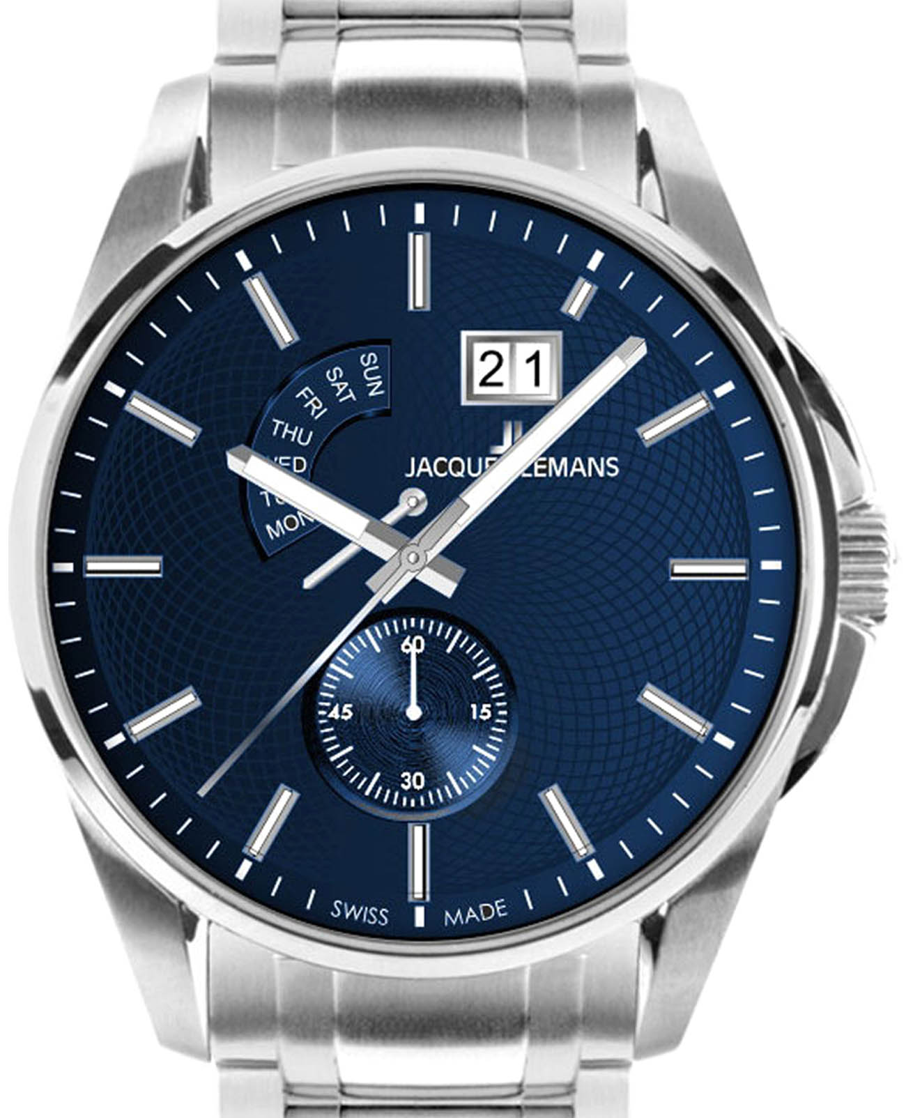 Мужские часы Jacques Lemans 1-2199M – лаконичная красота и изысканная элегантность. Оригинальная модель с классическим оформлением станет превосходным завершением образа, наделив его индивидуальным характером. Корпус выполнен из нержавеющей стали, диаметром 44 мм, что обеспечивает долговечность и утончённый внешний вид. Минеральное стеклоМинеральное стеклоМинеральное стекло представляет собой искусственно выращенный минерал кварца. Такое стекло отличается особой устойчивостью к повреждениям и царапинам. Уступает по некоторым качествам сапфировому стеклу. с сапфировым напылением защищает циферблат от царапин. Стальной браслет на раскладной застёжкеРаскладная застёжкаТакой тип застёжки используется только на браслетах из металла. Она никогда не раскрывается полностью, происходит разделение на 2 и более частей. Раскладывающая застёжка снизит вероятность потери часов к минимуму. обеспечивает комфортное ношение. Водозащита 100 метров позволит плавать, нырять и заниматься другими водными видами спорта. Стрелки и метки с люминесцентным покрытиемЛюминесцентное покрытиеПозволяет считывать показания времени в темноте. Производители наносят на стрелки, часовые индексы, безель или поверхность циферблата светонакопительный состав, дающий холодное свечение. позволяющие легко определять время даже в темноте. Окошко даты находится в положении 1 час. Широкое окошко дня недели в положении 11-12 часов позволяет показывать название дня недели. Это аксессуар для мужчины, который ценит классический стиль и функциональность.