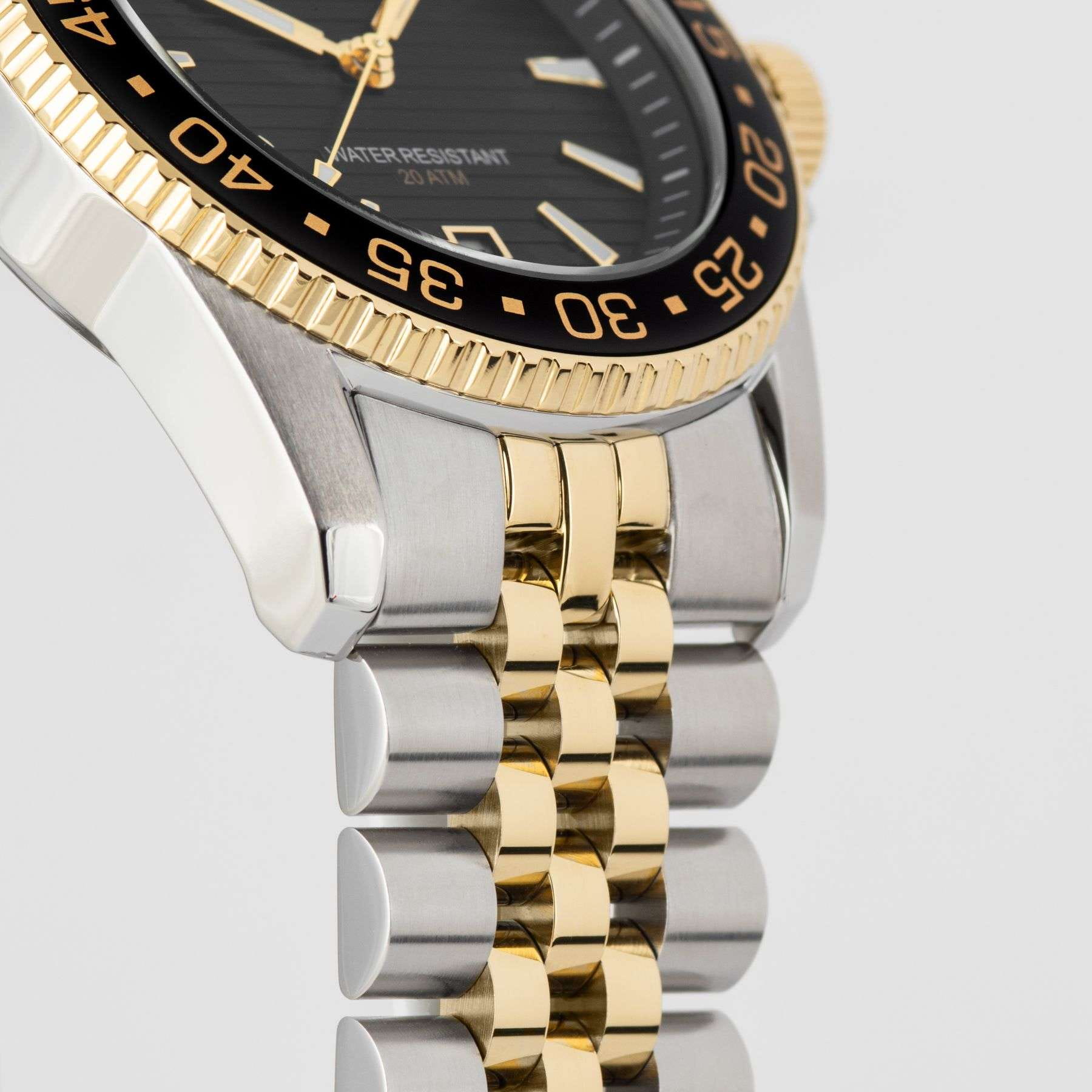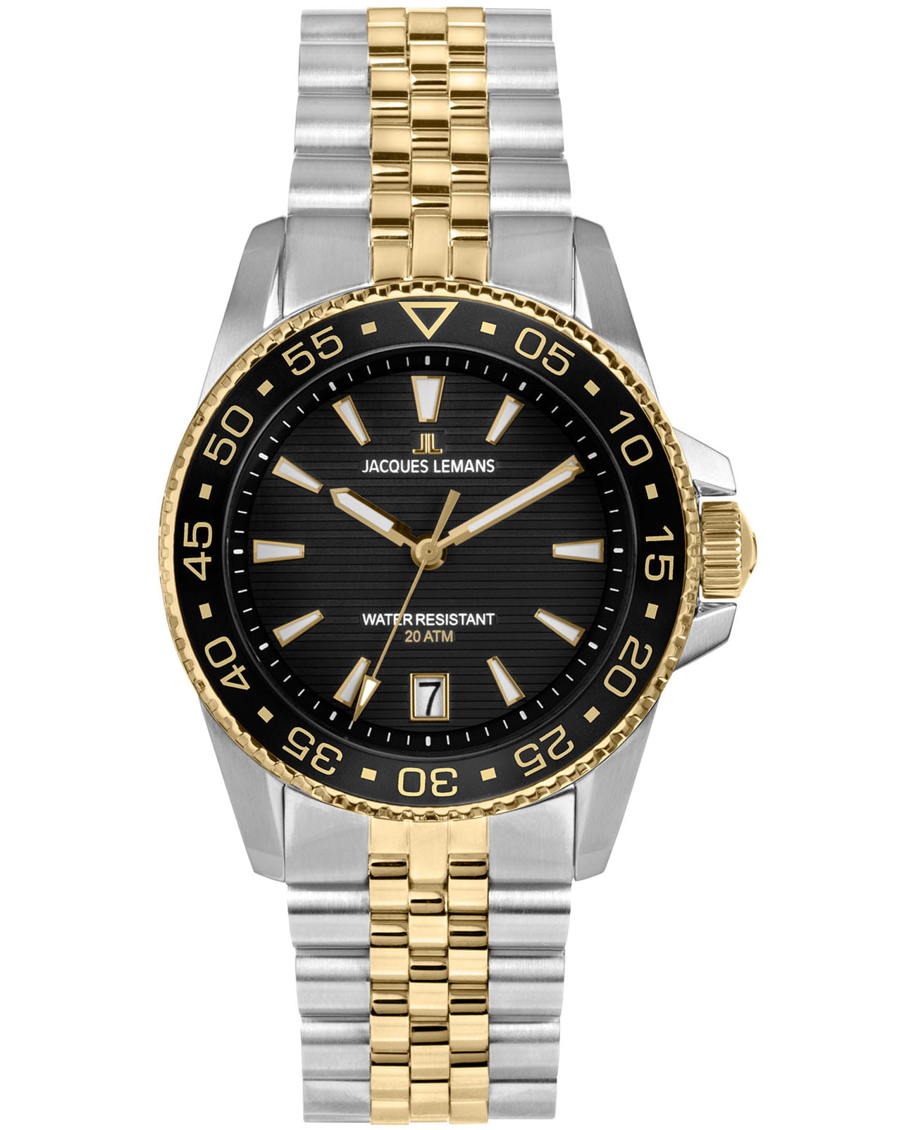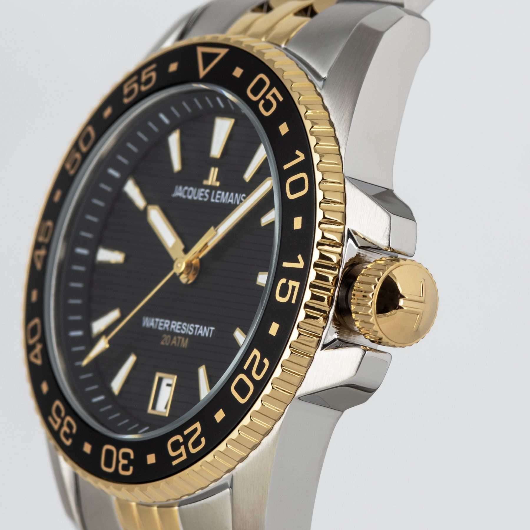 Мужские кварцевые часы Jacques Lemans 1-2205N – лаконичная красота и изысканная элегантность. Оригинальная модель с классическим оформлением станет превосходным завершением образа, наделив его индивидуальным характером. Корпус выполнен из нержавеющей стали серебристого цвета, диаметром 41 мм, что обеспечивает долговечность и утончённый внешний вид. Минеральное стеклоМинеральное стеклоМинеральное стекло представляет собой искусственно выращенный минерал кварца. Такое стекло отличается особой устойчивостью к повреждениям и царапинам. Уступает по некоторым качествам сапфировому стеклу. повышенной прочности Crystex защищает циферблат от царапин. Поворотный безельБезельВнешний ободок, закрепляющий стекло. В спортивных часах так называется поворотное кольцо с делениями на циферблате, выполняет роль таймера – замеряет отрезки времени на шкале. Неподвижный безель – элемент декора. Однонаправленно вращающийся безель на дайверских часах позволяет фиксировать моменты погружения и выныривания на поверхность. с PVD-покрытиемPVDУльтратонкое покрытие наносится в технике вакуумного напыления, сочетает в себе нитрид титана особой прочности со слоем золота или оксида хрома. Несёт в себе декоративную или защитную функцию. черно-золотого цвета. Стальной браслет с частичным PVD-покрытиемPVDУльтратонкое покрытие наносится в технике вакуумного напыления, сочетает в себе нитрид титана особой прочности со слоем золота или оксида хрома. Несёт в себе декоративную или защитную функцию. на раскладной застёжке с фиксаторомРаскладная застёжкаТакой тип застёжки используется только на браслетах из металла. Она никогда не раскрывается полностью, происходит разделение на 2 и более частей. Раскладывающая застёжка снизит вероятность потери часов к минимуму. обеспечивает комфортное ношение. Водозащита 200 метров позволит плавать, нырять и заниматься другими водными видами спорта. Стрелки и метки с люминесцентным покрытиемЛюминесцентное покрытиеПозволяет считывать показания времени в темноте. Производители наносят на стрелки, часовые индексы, безель или поверхность циферблата светонакопительный состав, дающий холодное свечение. позволяющие легко определять время даже в темноте. Окошко даты находится в положении 6 часов. Рифленая заводная головка с защитой. Это аксессуар для мужчины, который ценит классический стиль и функциональность.