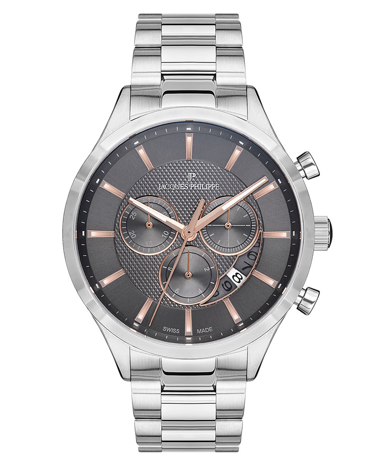 Швейцарские мужские часы-хронографХронографФункция позволяет измерять отрезки времени с особой точностью: часы, минуты, секунды. Верным признаком хронографа является наличие на циферблате 3 дополнительных окошек-счётчиков. Jacques Philippe Gallant JPQGC031346, кварцевый механизм с высокой точностью. Сапфировое стеклоСапфировое стеклоПрочный и надёжный материал из кристалла сапфира синтетического происхождения, характеризующийся особой твёрдостью и устойчивостью к царапинам и повреждениям. устойчивое к появлению царапин, обладающее высокой прозрачностью. Корпус часов изготовлен из нержавеющей стали. На циферблате три дополнительных индикатора. Стрелки с люминесцентным покрытиемЛюминесцентное покрытиеПозволяет считывать показания времени в темноте. Производители наносят на стрелки, часовые индексы, безель или поверхность циферблата светонакопительный состав, дающий холодное свечение.. Окошко даты находится между 4 и 5 часами. Класс водозащиты: 50 метров, позволит защитить корпус от случайных брызг или капель дождя. Стальной браслет на застёжке «бабочка» с кнопкамиЗастёжка "бабочка"Такой вид застёжки дополняется предохранителями, помогающими избежать случайного раскрытия браслета. Обладают изящным исполнением. .