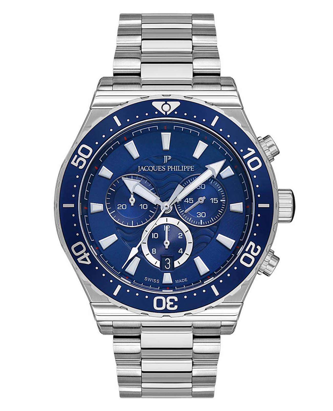 Швейцарские мужские часы-хронографХронографФункция позволяет измерять отрезки времени с особой точностью: часы, минуты, секунды. Верным признаком хронографа является наличие на циферблате 3 дополнительных окошек-счётчиков. с секундомеромСекундомерСекундоме́р — прибор, способный измерять интервалы времени с точностью до долей секунды. Jacques Philippe Cavalier JPQGC201336, кварцевый механизм с высокой точностью. Сапфировое стеклоСапфировое стеклоПрочный и надёжный материал из кристалла сапфира синтетического происхождения, характеризующийся особой твёрдостью и устойчивостью к царапинам и повреждениям. устойчивое к появлению царапин, обладающее высокой прозрачностью. Корпус часов изготовлен из нержавеющей стали. БезельБезельВнешний ободок, закрепляющий стекло. В спортивных часах так называется поворотное кольцо с делениями на циферблате, выполняет роль таймера – замеряет отрезки времени на шкале. Неподвижный безель – элемент декора. Однонаправленно вращающийся безель на дайверских часах позволяет фиксировать моменты погружения и выныривания на поверхность. из стали с IP-покрытиемIP-покрытиеМетод ионного напыления. Демонстрирует повышенную устойчивость к истиранию, окислению и химическим веществам. Под воздействием высокого давления и температуры около 1500°C молекулы металла надёжно соединяются с частицами корпуса часов.. На циферблате три дополнительных индикатора. Окошко даты находится в положении 6 часов. Стрелки с люминесцентным покрытиемЛюминесцентное покрытиеПозволяет считывать показания времени в темноте. Производители наносят на стрелки, часовые индексы, безель или поверхность циферблата светонакопительный состав, дающий холодное свечение.. Класс водозащиты: 50 метров, позволит защитить корпус от случайных брызг или капель дождя. Стальной браслет на застёжке «бабочка» с кнопкамиЗастёжка "бабочка"Такой вид застёжки дополняется предохранителями, помогающими избежать случайного раскрытия браслета. Обладают изящным исполнением. .
