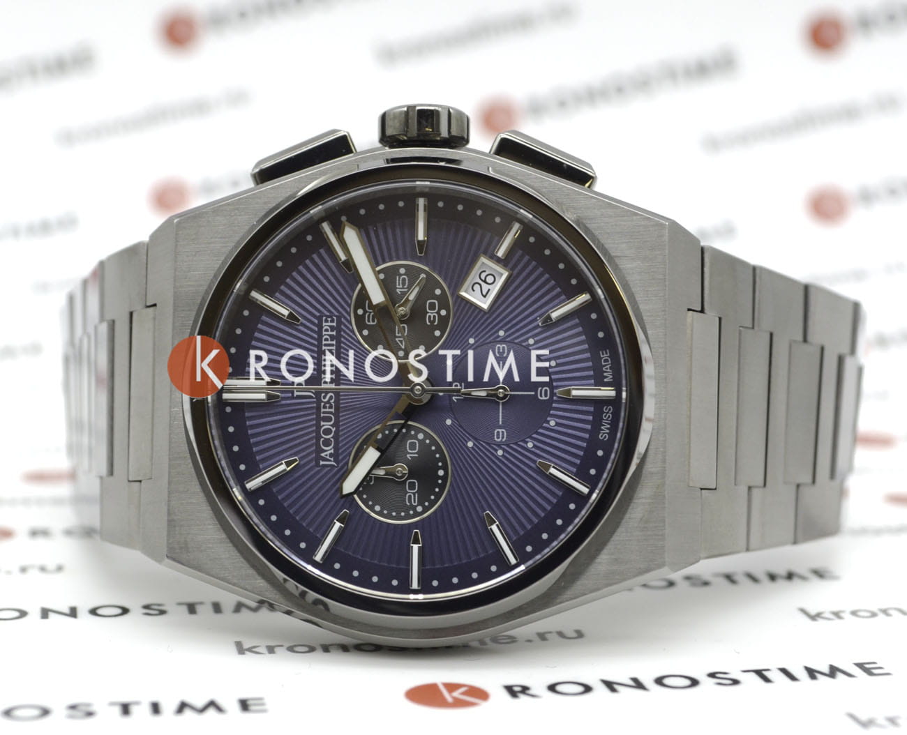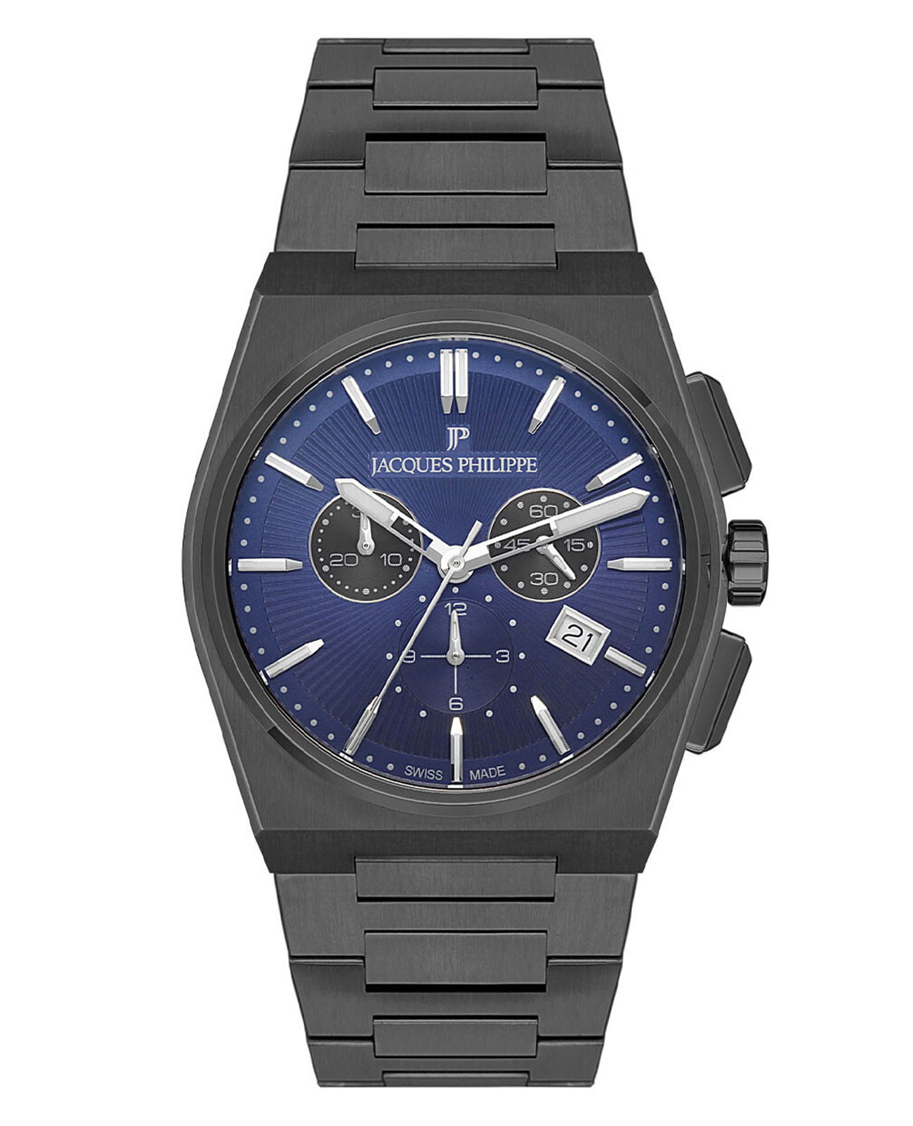 Швейцарские мужские часы-хронографХронографФункция позволяет измерять отрезки времени с особой точностью: часы, минуты, секунды. Верным признаком хронографа является наличие на циферблате 3 дополнительных окошек-счётчиков. с секундомеромСекундомерСекундоме́р — прибор, способный измерять интервалы времени с точностью до долей секунды. Jacques Philippe Aurora JPQGC418337, кварцевый механизм с высокой точностью. Сапфировое стеклоСапфировое стеклоПрочный и надёжный материал из кристалла сапфира синтетического происхождения, характеризующийся особой твёрдостью и устойчивостью к царапинам и повреждениям. устойчивое к появлению царапин, обладающее высокой прозрачностью. Корпус часов изготовлен из нержавеющей стали с IP-покрытиемIP-покрытиеМетод ионного напыления. Демонстрирует повышенную устойчивость к истиранию, окислению и химическим веществам. Под воздействием высокого давления и температуры около 1500°C молекулы металла надёжно соединяются с частицами корпуса часов.. На циферблате три дополнительных индикатора. Окошко даты находится в положении 4 часа. Стрелки с люминесцентным покрытиемЛюминесцентное покрытиеПозволяет считывать показания времени в темноте. Производители наносят на стрелки, часовые индексы, безель или поверхность циферблата светонакопительный состав, дающий холодное свечение.. Класс водозащиты: 50 метров, позволит защитить корпус от случайных брызг или капель дождя. Стальной браслет с IP-покрытиемIP-покрытиеМетод ионного напыления. Демонстрирует повышенную устойчивость к истиранию, окислению и химическим веществам. Под воздействием высокого давления и температуры около 1500°C молекулы металла надёжно соединяются с частицами корпуса часов. на застёжке «бабочка» с кнопкамиЗастёжка "бабочка"Такой вид застёжки дополняется предохранителями, помогающими избежать случайного раскрытия браслета. Обладают изящным исполнением. .