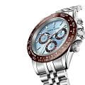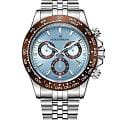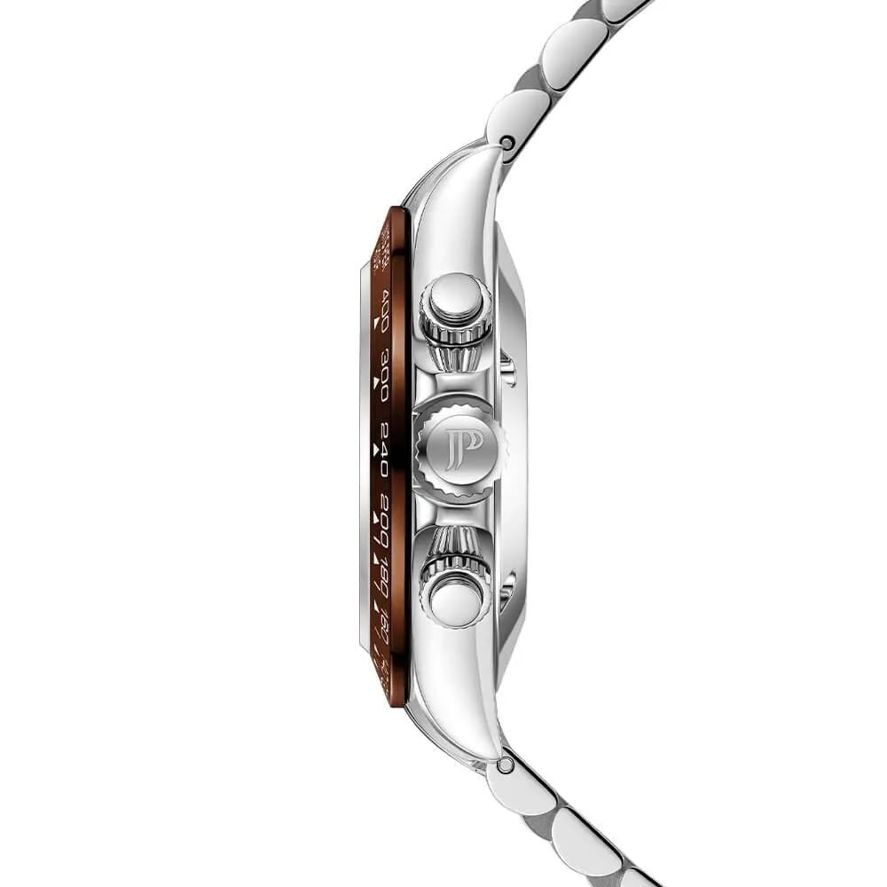 Швейцарские наручные часы Jacques Philippe JPQGC7113X6SBBR сочетают в себе современный дизайн, надежность и функциональность, это стильные швейцарские часы с функцией хронографаХронографФункция позволяет измерять отрезки времени с особой точностью: часы, минуты, секунды. Верным признаком хронографа является наличие на циферблате 3 дополнительных окошек-счётчиков. и секундомераСекундомерСекундоме́р — прибор, способный измерять интервалы времени с точностью до долей секунды.. Корпус круглой формы диаметром 39 мм выполнен из прочной нержавеющей стали, а безельБезельВнешний ободок, закрепляющий стекло. В спортивных часах так называется поворотное кольцо с делениями на циферблате, выполняет роль таймера – замеряет отрезки времени на шкале. Неподвижный безель – элемент декора. Однонаправленно вращающийся безель на дайверских часах позволяет фиксировать моменты погружения и выныривания на поверхность. с элегантным коричневым IP-покрытиемIP-покрытиеМетод ионного напыления. Демонстрирует повышенную устойчивость к истиранию, окислению и химическим веществам. Под воздействием высокого давления и температуры около 1500°C молекулы металла надёжно соединяются с частицами корпуса часов., а сапфировое стеклоСапфировое стеклоПрочный и надёжный материал из кристалла сапфира синтетического происхождения, характеризующийся особой твёрдостью и устойчивостью к царапинам и повреждениям. надежно защищает голубой циферблат от царапин и повреждений. Модель оснащена точным кварцевым механизмом RONDA 5030.D-4H, а также дополнительными функциями — тахиметромТахиметрРазмеченная шкала, располагается на ободке или безеле часов. Тахиметр позволяет рассчитать скорость на определённом участке пути, расстояние измеряется в километрах или милях. и индикатором даты, что делает часы не только стильным аксессуаром, но и практичным помощником на каждый день. Серебристый браслет шириной 20 мм удобно фиксируется на запястье с помощью застежки «бабочка»Застёжка "бабочка"Такой вид застёжки дополняется предохранителями, помогающими избежать случайного раскрытия браслета. Обладают изящным исполнением. . Стрелки имеют люминесцентное покрытиеЛюминесцентное покрытиеПозволяет считывать показания времени в темноте. Производители наносят на стрелки, часовые индексы, безель или поверхность циферблата светонакопительный состав, дающий холодное свечение. для удобства чтения времени в темноте. Водозащита 5 АТМ позволяет не снимать часы при дожде и случайных контактах с водой.
