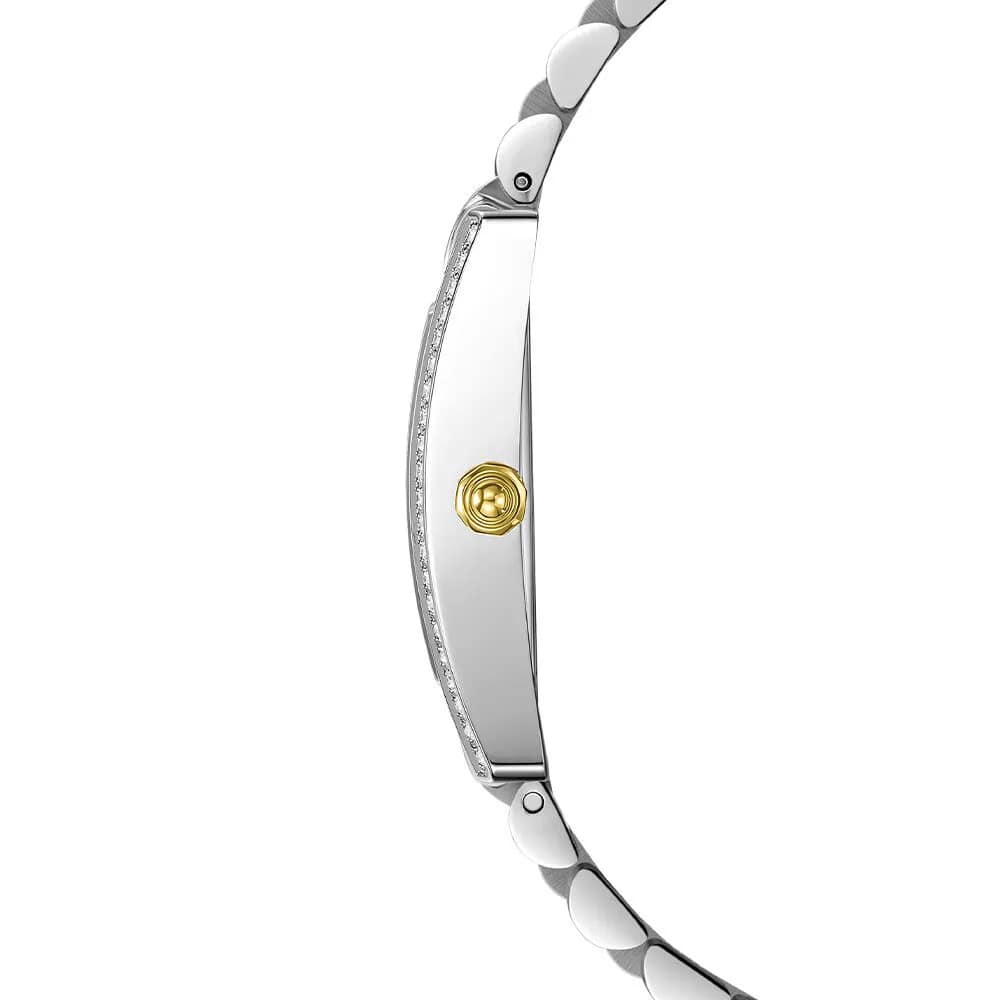 Часы Jacques Philippe JPQLS657328YGS из коллекции HORA — элегантные женские часы, сочетающие швейцарское качество и современный дизайн. Корпус диаметром 25 мм выполнен из нержавеющей стали, а белый циферблат защищён сапфировым стекломСапфировое стеклоПрочный и надёжный материал из кристалла сапфира синтетического происхождения, характеризующийся особой твёрдостью и устойчивостью к царапинам и повреждениям.. БезельБезельВнешний ободок, закрепляющий стекло. В спортивных часах так называется поворотное кольцо с делениями на циферблате, выполняет роль таймера – замеряет отрезки времени на шкале. Неподвижный безель – элемент декора. Однонаправленно вращающийся безель на дайверских часах позволяет фиксировать моменты погружения и выныривания на поверхность. инкрустирован кристаллами.