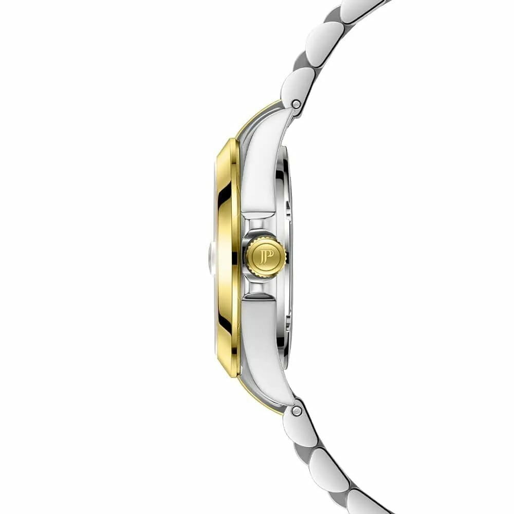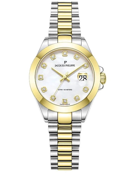 Часы Jacques Philippe JPQLS737388YG из коллекции Infinitum — элегантные женские  часы, сочетающие в себе швейцарское качество и современный дизайн. Корпус диаметром 30 мм выполнен из нержавеющей стали, а циферблат защищён сапфировым стекломСапфировое стеклоПрочный и надёжный материал из кристалла сапфира синтетического происхождения, характеризующийся особой твёрдостью и устойчивостью к царапинам и повреждениям.. БезельБезельВнешний ободок, закрепляющий стекло. В спортивных часах так называется поворотное кольцо с делениями на циферблате, выполняет роль таймера – замеряет отрезки времени на шкале. Неподвижный безель – элемент декора. Однонаправленно вращающийся безель на дайверских часах позволяет фиксировать моменты погружения и выныривания на поверхность. с PVD-покрытиемPVDУльтратонкое покрытие наносится в технике вакуумного напыления, сочетает в себе нитрид титана особой прочности со слоем золота или оксида хрома. Несёт в себе декоративную или защитную функцию.. Циферблат инкрустирован кристаллами. Внутри установлен швейцарский кварцевый механизм, обеспечивающий высокую точность хода. Водозащита 100 метров (10 ATM) позволяет использовать часы для плавания и других водных видов спорта. Браслет из нержавеющей стали с PVD-покрытиемPVDУльтратонкое покрытие наносится в технике вакуумного напыления, сочетает в себе нитрид титана особой прочности со слоем золота или оксида хрома. Несёт в себе декоративную или защитную функцию. и застёжкой бабочкаЗастёжка "бабочка"Такой вид застёжки дополняется предохранителями, помогающими избежать случайного раскрытия браслета. Обладают изящным исполнением. обеспечивает комфортное ношение и надёжную фиксацию на запястье. Эти часы идеально подойдут для тех, кто ценит сочетание классического стиля и современных технологий.