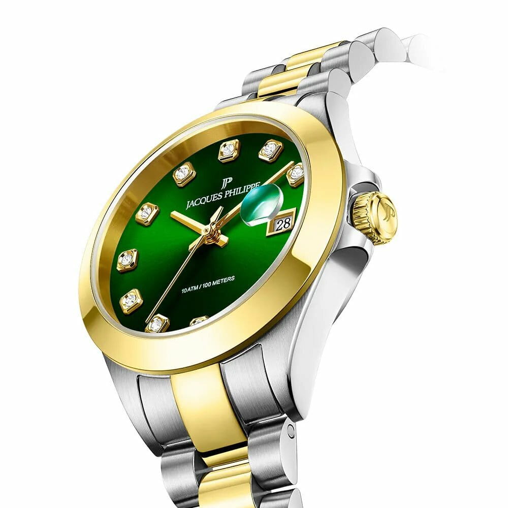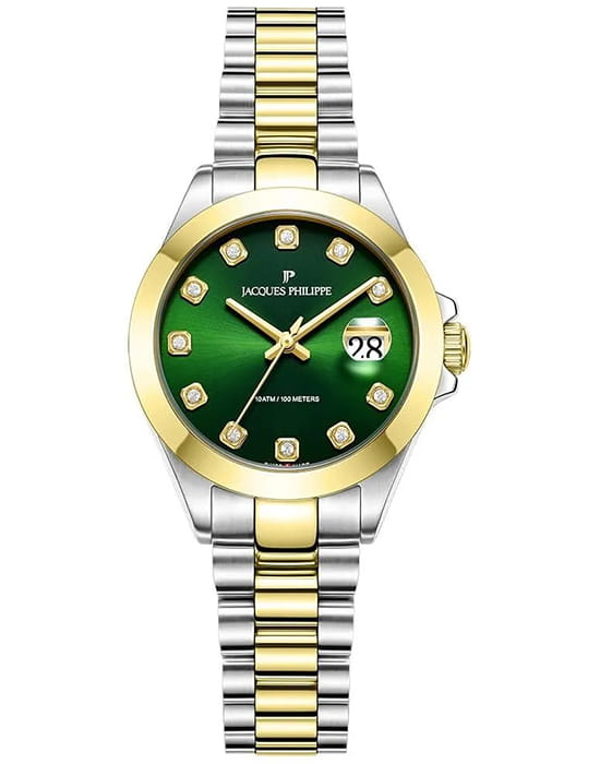 Часы Jacques Philippe JPQLS7373X8 из коллекции Infinitum — элегантные женские часы, сочетающие в себе швейцарское качество и современный дизайн. Корпус диаметром 30 мм выполнен из нержавеющей стали, а зеленый циферблат защищён сапфировым стекломСапфировое стеклоПрочный и надёжный материал из кристалла сапфира синтетического происхождения, характеризующийся особой твёрдостью и устойчивостью к царапинам и повреждениям.. БезельБезельВнешний ободок, закрепляющий стекло. В спортивных часах так называется поворотное кольцо с делениями на циферблате, выполняет роль таймера – замеряет отрезки времени на шкале. Неподвижный безель – элемент декора. Однонаправленно вращающийся безель на дайверских часах позволяет фиксировать моменты погружения и выныривания на поверхность. с PVD-покрытиемPVDУльтратонкое покрытие наносится в технике вакуумного напыления, сочетает в себе нитрид титана особой прочности со слоем золота или оксида хрома. Несёт в себе декоративную или защитную функцию.. Циферблат инкрустирован кристаллами. Внутри установлен швейцарский кварцевый механизм, обеспечивающий высокую точность хода. Водозащита 100 метров (10 ATM) позволяет использовать часы для плавания и других водных видов спорта. Браслет из нержавеющей стали с PVD-покрытиемPVDУльтратонкое покрытие наносится в технике вакуумного напыления, сочетает в себе нитрид титана особой прочности со слоем золота или оксида хрома. Несёт в себе декоративную или защитную функцию. и застёжкой бабочкаЗастёжка "бабочка"Такой вид застёжки дополняется предохранителями, помогающими избежать случайного раскрытия браслета. Обладают изящным исполнением. обеспечивает комфортное ношение и надёжную фиксацию на запястье. Эти часы идеально подойдут для тех, кто ценит сочетание классического стиля и современных технологий.