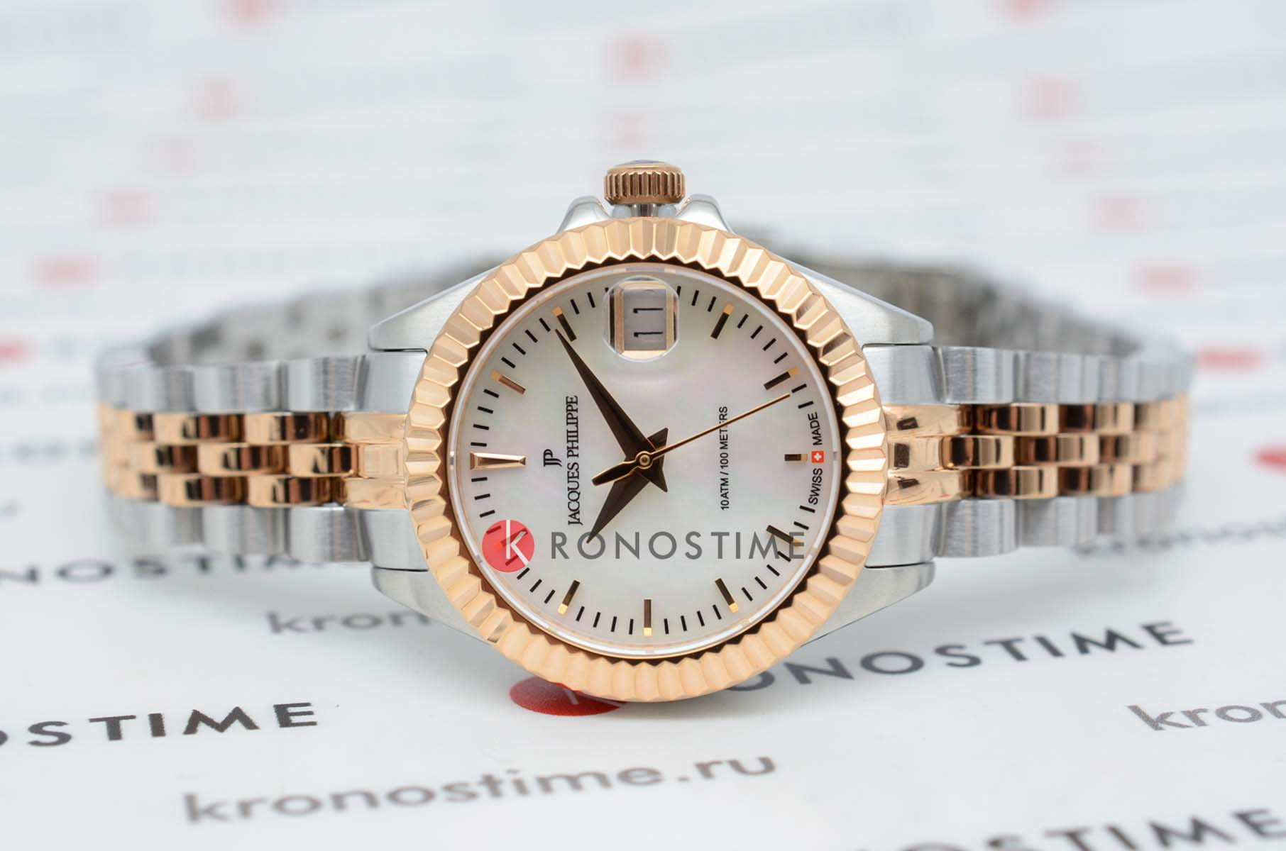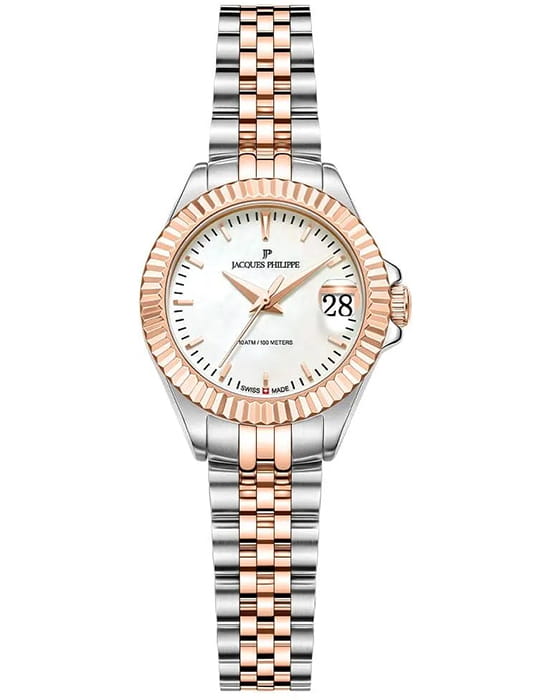 Jacques Philippe JPQLS827388RG — женские часы в сдержанном классическом исполнении с акцентом на простоту и надёжность. Корпус диаметром 26 мм выполнен из нержавеющей стали — делает модель универсальной и комфортной в повседневной носке. Циферблат оформлен в светлом металлическом тоне с тонкими стрелками, лаконичными часовыми метками и аккуратным окошком даты в позиции «3 часа». Минималистичный стиль подчёркивает строгость и чистоту дизайна. Поверхность защищена устойчивым к царапинам сапфировым стекломСапфировое стеклоПрочный и надёжный материал из кристалла сапфира синтетического происхождения, характеризующийся особой твёрдостью и устойчивостью к царапинам и повреждениям., которое обеспечивает хорошую читаемость и долговечность. БезельБезельВнешний ободок, закрепляющий стекло. В спортивных часах так называется поворотное кольцо с делениями на циферблате, выполняет роль таймера – замеряет отрезки времени на шкале. Неподвижный безель – элемент декора. Однонаправленно вращающийся безель на дайверских часах позволяет фиксировать моменты погружения и выныривания на поверхность. с PVD-покрытиемPVDУльтратонкое покрытие наносится в технике вакуумного напыления, сочетает в себе нитрид титана особой прочности со слоем золота или оксида хрома. Несёт в себе декоративную или защитную функцию.. Механизм — точный швейцарский кварц, не требующий подзавода. Он обеспечивает стабильную и бесперебойную работу часов, сохраняя точность в любых условиях. Браслет из нержавеющей стали с PVD-покрытиемPVDУльтратонкое покрытие наносится в технике вакуумного напыления, сочетает в себе нитрид титана особой прочности со слоем золота или оксида хрома. Несёт в себе декоративную или защитную функцию. визуально продолжает корпус и фиксируется на застёжке-бабочке с кнопкамиЗастёжка "бабочка"Такой вид застёжки дополняется предохранителями, помогающими избежать случайного раскрытия браслета. Обладают изящным исполнением. , обеспечивая комфортную посадку. Водозащита до 10 ATM позволяет использовать часы не только в повседневной жизни, но и при активности на воде. Jacques Philippe — это надёжная и универсальная модель для тех, кто ценит швейцарскую точность, простоту и уверенный стиль без лишних деталей.