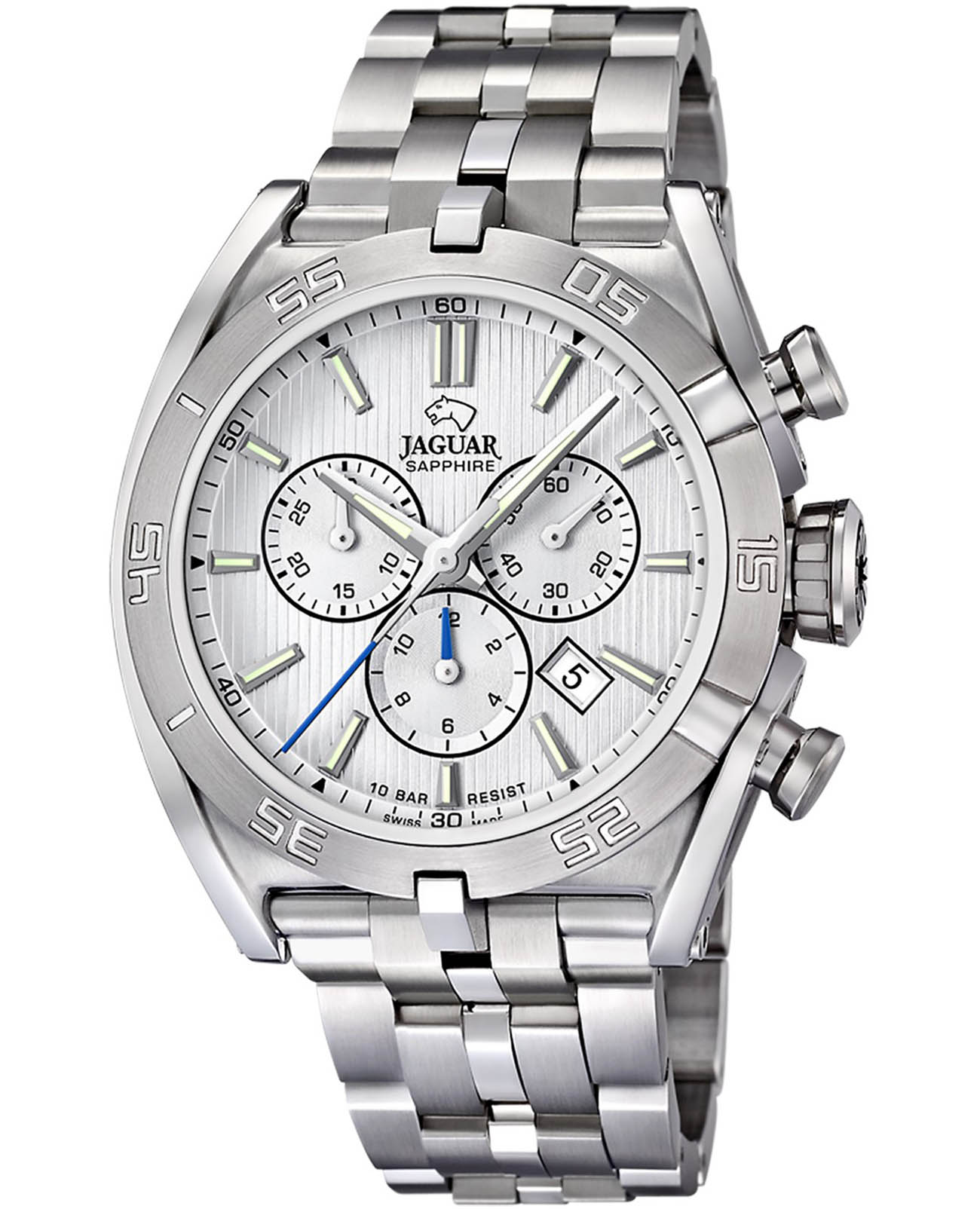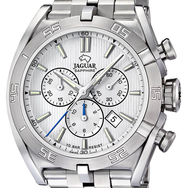 Мужские швейцарские часы-хронографХронографФункция позволяет измерять отрезки времени с особой точностью: часы, минуты, секунды. Верным признаком хронографа является наличие на циферблате 3 дополнительных окошек-счётчиков. Jaguar Executive J852/A. Кварцевый швейцарский калибр Ronda 5030d. Сапфировое стеклоСапфировое стеклоПрочный и надёжный материал из кристалла сапфира синтетического происхождения, характеризующийся особой твёрдостью и устойчивостью к царапинам и повреждениям. устойчивое к мелким механическим повреждениям. Корпус и браслет часов изготовлены из нержавеющей стали. Стрелки и метки с люминесцентным покрытиемЛюминесцентное покрытиеПозволяет считывать показания времени в темноте. Производители наносят на стрелки, часовые индексы, безель или поверхность циферблата светонакопительный состав, дающий холодное свечение.. Окошко даты находится в положении между «4» и «5 часами». Класс водозащиты: 100 метров, позволит плавать, нырять и заниматься другими водными видами спорта. Стальной браслет на раскладной застёжкеРаскладная застёжкаТакой тип застёжки используется только на браслетах из металла. Она никогда не раскрывается полностью, происходит разделение на 2 и более частей. Раскладывающая застёжка снизит вероятность потери часов к минимуму..