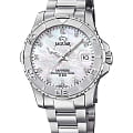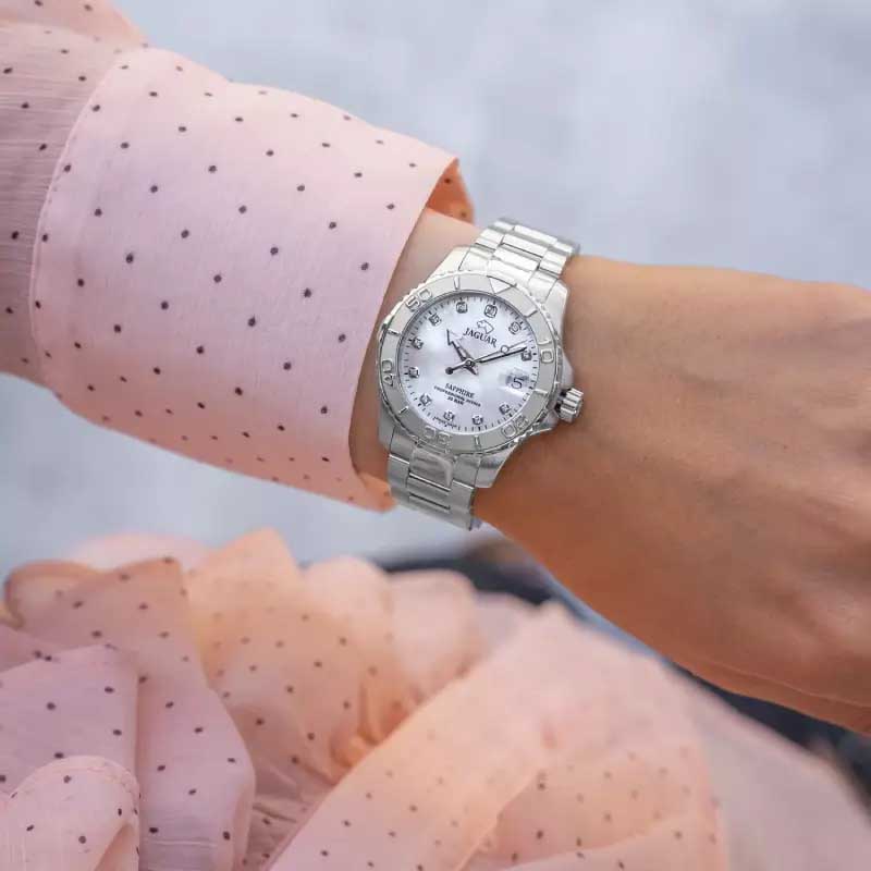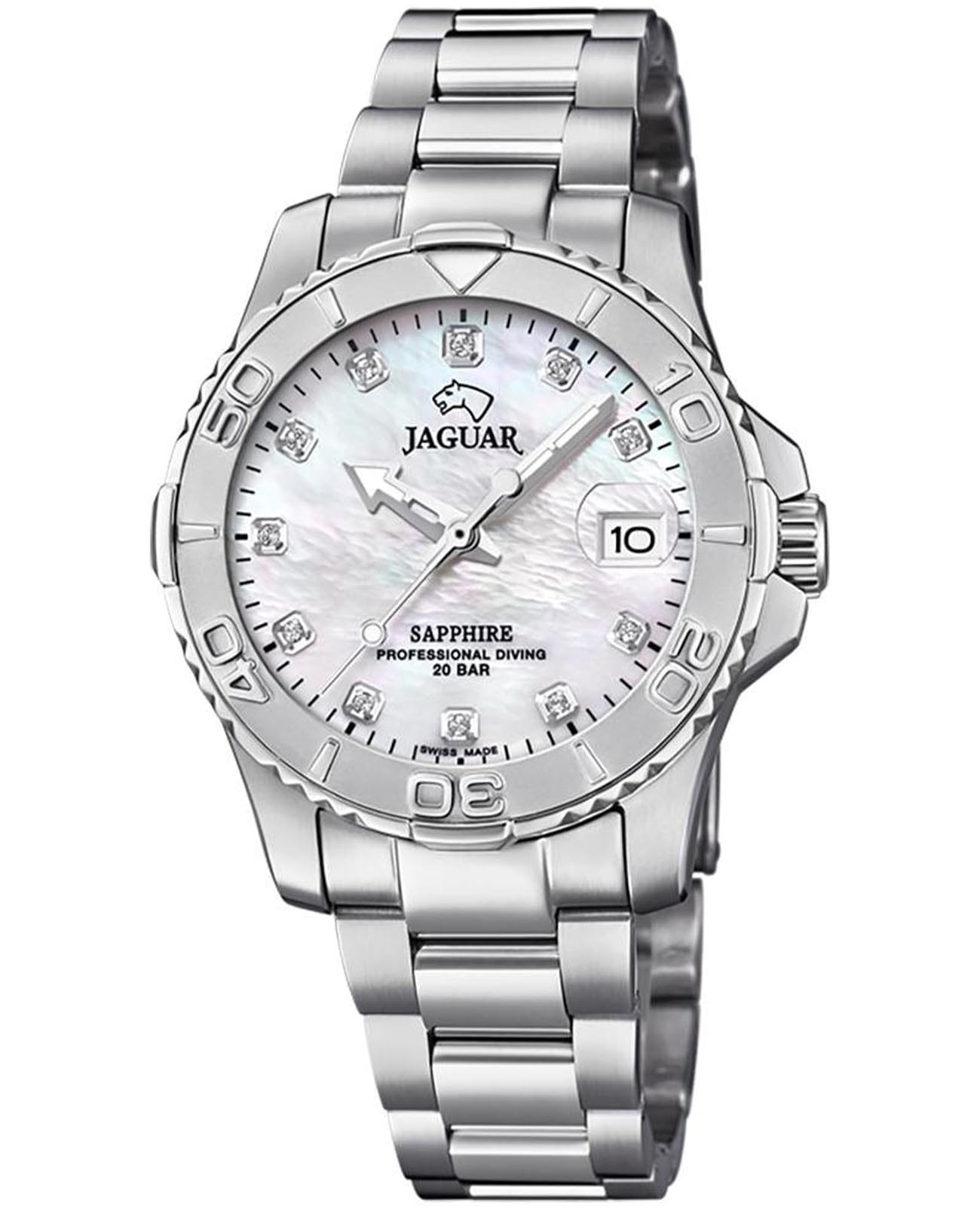 Женские швейцарские часы Jaguar Couple Diver J870/1. Кварцевый швейцарский калибр Ronda 705. Сапфировое стеклоСапфировое стеклоПрочный и надёжный материал из кристалла сапфира синтетического происхождения, характеризующийся особой твёрдостью и устойчивостью к царапинам и повреждениям. устойчивое к мелким механическим повреждениям. Корпус и браслет часов изготовлены из нержавеющей стали. Стрелки с люминесцентным покрытиемЛюминесцентное покрытиеПозволяет считывать показания времени в темноте. Производители наносят на стрелки, часовые индексы, безель или поверхность циферблата светонакопительный состав, дающий холодное свечение.. Окошко даты находится в положении 3 часа. Класс водозащиты: 200 метров, позволит плавать, нырять и заниматься другими водными видами спорта. Стальной браслет на раскладной застёжкеРаскладная застёжкаТакой тип застёжки используется только на браслетах из металла. Она никогда не раскрывается полностью, происходит разделение на 2 и более частей. Раскладывающая застёжка снизит вероятность потери часов к минимуму.. Циферблат украшен 11 кристаллами в роли часовых индексов.