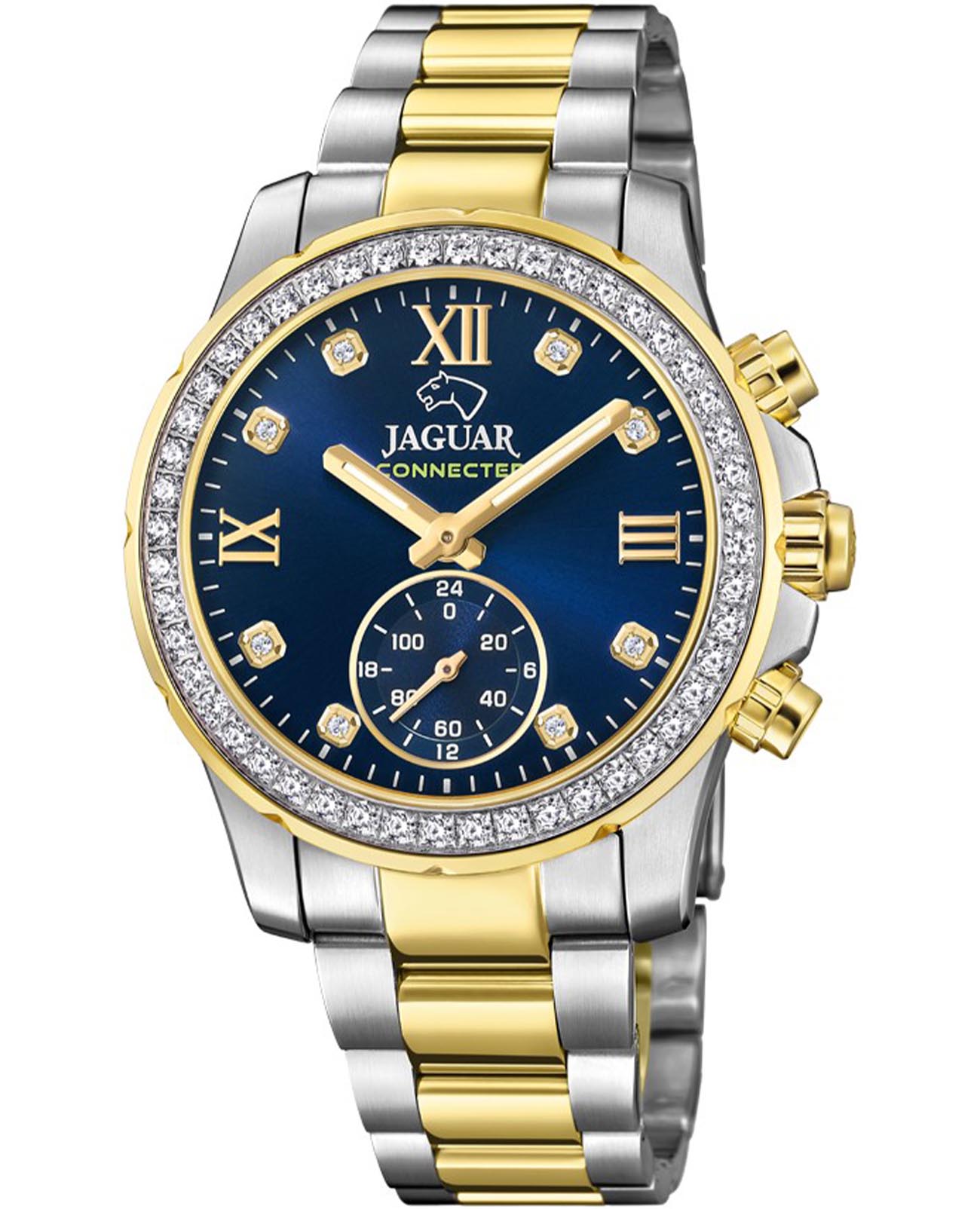 Женские швейцарские часы Jaguar Connected Lady J982/3. Сапфировое стеклоСапфировое стеклоПрочный и надёжный материал из кристалла сапфира синтетического происхождения, характеризующийся особой твёрдостью и устойчивостью к царапинам и повреждениям. устойчивое к мелким механическим повреждениям. Корпус часов изготовлен из нержавеющей стали. Стрелки с люминесцентным покрытиемЛюминесцентное покрытиеПозволяет считывать показания времени в темноте. Производители наносят на стрелки, часовые индексы, безель или поверхность циферблата светонакопительный состав, дающий холодное свечение.. Класс водозащиты: 50 метров, позволит защитить корпус от случайных брызг или капель дождя. БезельБезельВнешний ободок, закрепляющий стекло. В спортивных часах так называется поворотное кольцо с делениями на циферблате, выполняет роль таймера – замеряет отрезки времени на шкале. Неподвижный безель – элемент декора. Однонаправленно вращающийся безель на дайверских часах позволяет фиксировать моменты погружения и выныривания на поверхность. с PVD-покрытиемPVDУльтратонкое покрытие наносится в технике вакуумного напыления, сочетает в себе нитрид титана особой прочности со слоем золота или оксида хрома. Несёт в себе декоративную или защитную функцию. и циферблат инкрустированы цирконием. Стальной браслет с частичным PVD-покрытиемPVDУльтратонкое покрытие наносится в технике вакуумного напыления, сочетает в себе нитрид титана особой прочности со слоем золота или оксида хрома. Несёт в себе декоративную или защитную функцию. на раскладной застёжкеРаскладная застёжкаТакой тип застёжки используется только на браслетах из металла. Она никогда не раскрывается полностью, происходит разделение на 2 и более частей. Раскладывающая застёжка снизит вероятность потери часов к минимуму.. За точный ход работы часов, из коллекции Connected, отвечает кварцевый гибридный механизм швейцарского производства со Смарт-Модулем. Данный тип механизма обеспечивает возможность подключить часы к телефону через Bluetooth и управлять большим рядом дополнительных функций на выбор с помошью приложения Jaguar. Дополнительные функции: отображение даты и дня недели, секундомер, таймер, GMT, шагомер, поиск телефона, включение/выключение звука телефона при входящих вызовах, переключение музыки, вибро-уведомления.