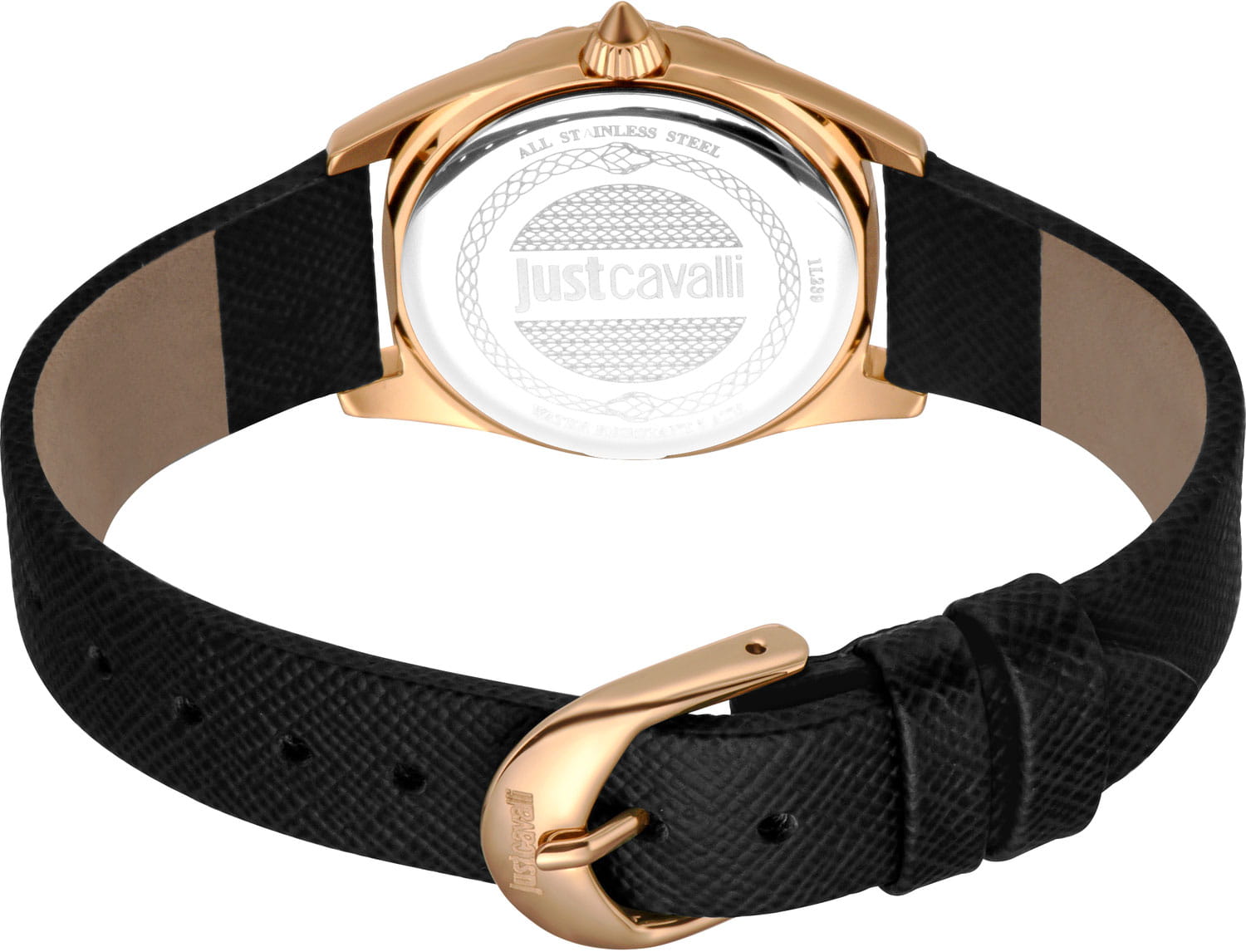 Элегантные женские часы Just Cavalli JC1L212L0035 с минеральным стекломМинеральное стеклоМинеральное стекло представляет собой искусственно выращенный минерал кварца. Такое стекло отличается особой устойчивостью к повреждениям и царапинам. Уступает по некоторым качествам сапфировому стеклу., кварцевый механизм с высокой точностью. Циферблат украшен кристаллами. Корпус часов изготовлен из стали с PVD-покрытиемPVDУльтратонкое покрытие наносится в технике вакуумного напыления, сочетает в себе нитрид титана особой прочности со слоем золота или оксида хрома. Несёт в себе декоративную или защитную функцию.. Класс водозащиты: 50 метров, позволит защитить корпус от случайных брызг или капель дождя. Кожаный ремешок на стандартной застёжке.