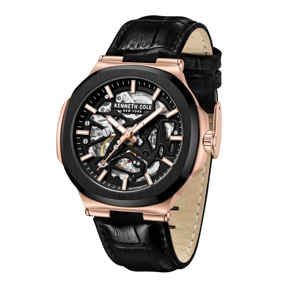 Мужские механические часы с автоподзаводом Kenneth Cole KCWGX0046204 — это выразительный аксессуар, сочетающий современный дизайн и инженерную изысканность. Корпус размером 44 мм выполнен из стали с IP-покрытиемIP-покрытиеМетод ионного напыления. Демонстрирует повышенную устойчивость к истиранию, окислению и химическим веществам. Под воздействием высокого давления и температуры около 1500°C молекулы металла надёжно соединяются с частицами корпуса часов. розового золота. Циферблат чёрного цвета частично скелетонизирован, что позволяет наблюдать за работой механизма, добавляя модели динамики и технологичности. Циферблат защищён минеральным стекломМинеральное стеклоМинеральное стекло представляет собой искусственно выращенный минерал кварца. Такое стекло отличается особой устойчивостью к повреждениям и царапинам. Уступает по некоторым качествам сапфировому стеклу. и оформлен метками в виде штрихом. Стрелки и метки оснащены люминесцентным покрытиемЛюминесцентное покрытиеПозволяет считывать показания времени в темноте. Производители наносят на стрелки, часовые индексы, безель или поверхность циферблата светонакопительный состав, дающий холодное свечение., обеспечивающим хорошую читаемость в темноте. Часы оснащены ремешком из натуральной кожи чёрного цвета с классической пряжкой. Водонепроницаемость 30 м позволяет использовать часы в повседневных условиях, защищая от случайных брызг и капель дождя. Сочетание строгого стиля и детального исполнения делает эти часы заметным элементом образа.